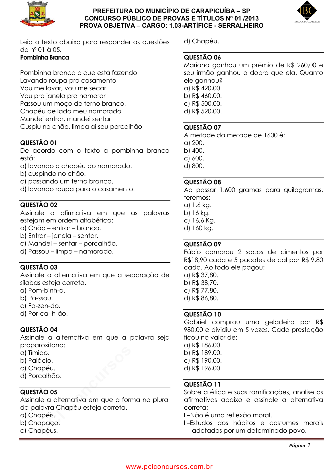 pcimarkpci MjgwNDowZDQxOmU2Yjc6MjMwMDo3Y2UyOmQ4Mjc6NTBkMDoxYWFj:VHVlLCAyOSBPY3QgMjAyNCAwNzozMzo1NyAtMDMwMA== www.pciconcursos.com.br PREFEITURA DO MUNICÍPIO DE CARAPICUÍBA – SP CONCURSO PÚBLICO DE PROVAS E TÍTULOS Nº 01 /2013 PROVA OBJETIVA – CARGO: 1.03-ARTÍFICE - SERRALHEIRO Página 1 Leia o texto abaixo para responder as questões de nº 01 à 05. Pombinha Branca Pombinha branca o que está fazendo Lavando roupa pro casamento Vou me lavar, vou me secar Vou pra janela pra namorar Passou um moço de terno branco, Chapéu de lado meu namorado Mandei entrar, mandei sentar Cuspiu no chão, limpa aí seu porcalhão QUESTÃO 01 De acordo com o texto a pombinha branca está: a) lavando o chapéu do namorado. b) cuspindo no chão. c) passando um terno branco. d) lavando roupa para o casamento. QUESTÃO 02 Assinale a afirmativa em que as palavras estejam em ordem alfabética: a) Chão – entrar – branco. b) Entrar – janela – sentar. c) Mandei – sentar – porcalhão. d) Passou – limpa – namorado. QUESTÃO 03 Assinale a alternativa em que a separação de sílabas esteja correta. a) Pom-binh-a. b) Pa-ssou. c) Fa-zen-do. d) Por-ca-lh-ão. QUESTÃO 04 Assinale a alternativa em que a palavra seja proparoxítona: a) Tímido. b) Palácio. c) Chapéu. d) Porcalhão. QUESTÃO 05 Assinale a alternativa em que a forma no plural da palavra Chapéu esteja correta. a) Chapéis. b) Chapaço. c) Chapéus. d) Chapéu. QUESTÃO 06 Mariana ganhou um prêmio de R$ 260,00 e seu irmão ganhou o dobro que ela. Quanto ele ganhou? a) R$ 420,00. b) R$ 460,00. c) R$ 500,00. d) R$ 520,00. QUESTÃO 07 A metade da metade de 1600 é: a) 200. b) 400. c) 600. d) 800. QUESTÃO 08 Ao passar 1.600 gramas para quilogramas, teremos: a) 1,6 kg. b) 16 kg. c) 16,6 Kg. d) 160 kg. QUESTÃO 09 Fábio comprou 2 sacos de cimentos por R$18,90 cada e 5 pacotes de cal por R$ 9,80 cada. Ao todo ele pagou: a) R$ 37,80. b) R$ 38,70. c) R$ 77,80. d) R$ 86,80. QUESTÃO 10 Gabriel comprou uma geladeira por R$ 980,00 e dividiu em 5 vezes. Cada prestação ficou no valor de: a) R$ 186,00. b) R$ 189,00. c) R$ 190,00. d) R$ 196,00. QUESTÃO 11 Sobre a ética e suas ramificações, analise as afirmativas abaixo e assinale a alternativa correta: I –Não é uma reflexão moral. II–Estudos dos hábitos e costumes morais adotados por um determinado povo. www.pciconcursos.com.br pcimarkpci MjgwNDowZDQxOmU2Yjc6MjMwMDo3Y2UyOmQ4Mjc6NTBkMDoxYWFj:VHVlLCAyOSBPY3QgMjAyNCAwNzozMzo1NyAtMDMwMA== www.pciconcursos.com.br PREFEITURA DO MUNICÍPIO DE CARAPICUÍBA – SP CONCURSO PÚBLICO DE PROVAS E TÍTULOS Nº 01 /2013 PROVA OBJETIVA – CARGO: 1.03-ARTÍFICE - SERRALHEIRO Página 2 III– A ética pertence apenas à religião. a) Apenas as afirmativas I e II são verdadeiras. b) Apenas as afirmativas I e III são verdadeiras. c) Apenas as afirmativas II e III são verdadeiras. d) Todas as afirmativas são verdadeiras. QUESTÃO 12 Observe as afirmativas abaixo e assinale a alternativa incorreta: a) Uma pessoa que se sinta responsável pelos resultados da equipe, terá maior probabilidade de agir de maneira mais favorável aos interesses do departamento e seus colaboradores. b) Um funcionário leal alegra-se quando o departamento é bem sucedido, defende o seu setor, tem orgulho de fazer parte dele, fala positivamente e defende contra as críticas. c) A iniciativa é assumir responsabilidades pela implementação e/ou complementação de um projeto. d) Para que um funcionário sinta-se bem como os demais colegas, não é necessário que ele esteja satisfeito consigo mesmo. QUESTÃO 13 Em caso de acidente com vítima, antes de providenciar sua remoção é primordial, exceto: a) Realizar o controle de hemorragias e respiração. b) Imobilizar todos os pontos suspeitos de fraturas. c) Promover e/ou descontrolar o estado de choque. d) Providenciar uma maca. QUESTÃO 14 Segundo os Direitos e Deveres Individuais e Coletivos, não haverá “penalidades”, EXCETO: a) de reclusão. b) de caráter perpétuo. c) de trabalhos forçados. d) de banimento. QUESTÃO 15 O Senado elegeu na sexta-feira (1º de fevereiro), com 56 votos, o novo presidente da Casa. Com isso, ele acumulará com o cargo a presidência do Congresso Nacional e presidirá as sessões conjuntas de deputados e senadores. No final de 2007, ele deixou o cargo em meio a denúncias de que usou dinheiro de lobista para pagar pensão de uma filha fora do casamento. Absolvido pelo plenário, continuou como senador e era, até agora, líder da bancada do PMDB no Senado. Estamos falando de: a) Renan Calheiros (PMDB-AL) b) Henrique Eduardo Alves (PMDB-RN), c) Rose de Freitas (PMDB-ES), d) Chico Alencar (PSOL-RJ). QUESTÃO 16 O equipamento acima é: a) uma lixa de sinta. b) uma esmerilhadeira. c) uma lixadeira orbital. d) uma serra mármore. QUESTÃO 17 Complete: _____________é um instrumento usado para medir com precisão as dimensões de pequenos objetos. Trata-se de uma régua graduada, com encosto fixo, sobre a qual desliza um cursor. O paquímetro possui dois bicos de medição, sendo um ligado à escala e o outro ao cursor. a) A desempenadeira. b) O paquímetro. c) O torquês. d) O micrômetro. QUESTÃO 18 Um metro equivale quantas polegadas? a) Equivale a 3,937 polegadas. b) Equivale a 3,930 polegadas. c) Equivale a 39,370113 polegadas. d) Equivale a 39,389112 polegadas. QUESTÃO 19 Complete: www.pciconcursos.com.br pcimarkpci MjgwNDowZDQxOmU2Yjc6MjMwMDo3Y2UyOmQ4Mjc6NTBkMDoxYWFj:VHVlLCAyOSBPY3QgMjAyNCAwNzozMzo1NyAtMDMwMA== www.pciconcursos.com.br PREFEITURA DO MUNICÍPIO DE CARAPICUÍBA – SP CONCURSO PÚBLICO DE PROVAS E TÍTULOS Nº 01 /2013 PROVA OBJETIVA – CARGO: 1.03-ARTÍFICE - SERRALHEIRO Página 3 Planta Baixa é o nome que se dá ao desenho de uma construção feito, em geral, a partir do corte horizontal à _________________. É um diagrama dos relacionamentos entre salas, espaços e outros aspectos físicos em um nível de uma estrutura. Nela devem estar detalhadas em escala