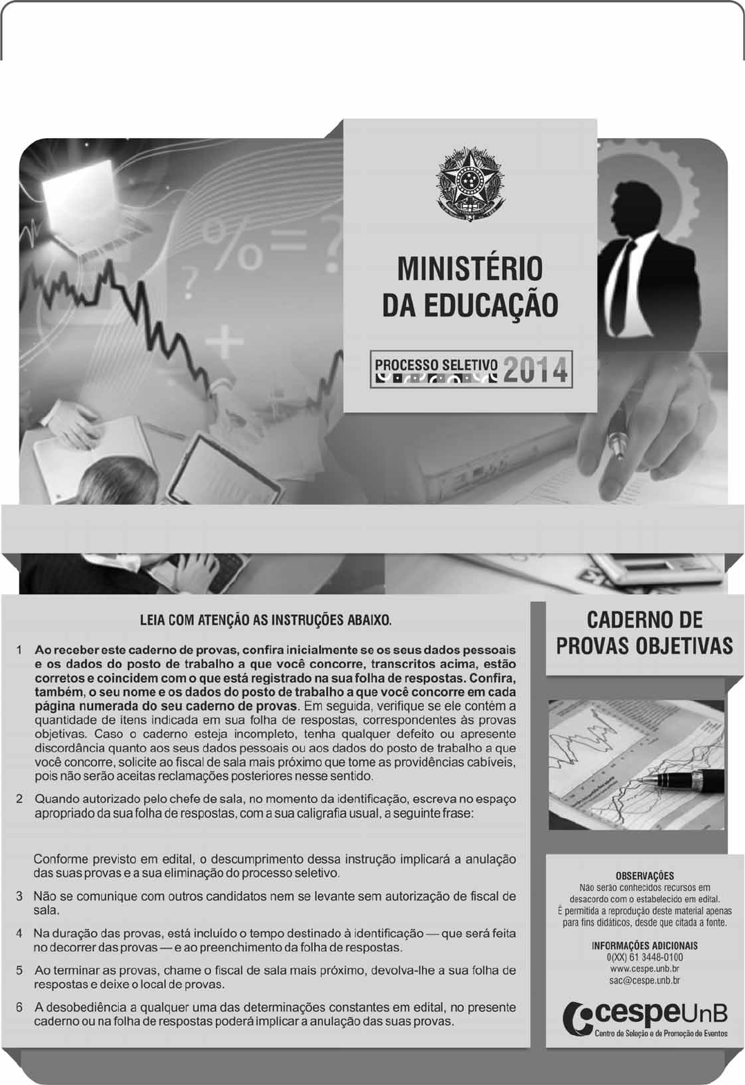 www.pciconcursos.com.br www.pciconcursos.com.br ||MEC14_CBNS01_01N475508|| CESPE/UnB – MEC/PS – Aplicação: 2014 • De acordo com o comando a que cada um dos itens a seguir se refira, marque, na folha de respostas, para cada item: o campo designado com o código C, caso julgue o item CERTO; ou o campo designado com o código E, caso julgue o item ERRADO. A ausência de marcação ou a marcação de ambos os campos não serão apenadas, ou seja, não receberão pontuação negativa. Para as devidas marcações, use a folha de respostas, único documento válido para a correção das suas provas objetivas. • Nos itens que avaliam conhecimentos de informática, a menos que seja explicitamente informado o contrário, considere que todos os programas mencionados estão em configuração-padrão, em português, e que não há restrições de proteção, de funcionamento e de uso em relação aos programas, arquivos, diretórios, recursos e equipamentos mencionados. CONHECIMENTOS BÁSICOS Nenhuma ação educativa pode prescindir de uma1 reflexão sobre o homem e de uma análise sobre suas condições culturais. Não há educação fora das sociedades humanas e não há homens isolados. O homem é um ser de raízes4 espaçotemporais. De forma que ele é, na expressão feliz de Marcel, um ser “situado e temporalizado”. A instrumentação da educação — algo mais que a simples preparação de quadros7 técnicos para responder às necessidades de desenvolvimento de uma área — depende da harmonia que se consiga entre a vocação ontológica desse “ser situado e temporalizado” e as10 condições especiais dessa temporalidade e dessa situacionalidade. Se a vocação ontológica do homem é a de ser sujeito13 e não objeto, ele só poderá desenvolvê-la se, refletindo sobre suas condições espaçotemporais, introduzir-se nelas de maneira crítica. Quanto mais for levado a refletir sobre sua16 situacionalidade, sobre seu enraizamento espaçotemporal, mais “emergirá” dela conscientemente “carregado” de compromisso com sua realidade, da qual, porque é sujeito, não deve ser19 simples espectador, mas na qual deve intervir cada vez mais. Paulo Freire. Educação e mudança. 2.ª ed. Rio de Janeiro: Paz e Terra, 1979, p. 61 (com adaptações). Julgue os itens seguintes, referentes às ideias e a aspectos linguísticos do texto acima. 1 O termo “prescindir”, no primeiro período do texto, tem acepção de abster-se, abdicar. 2 No último período do texto, o pronome relativo preposicionado “na qual” completa o sentido de “intervir” e retoma o termo “sua realidade”. 3 No segundo período do texto, a forma verbal “há”, em suas duas ocorrências (R.3 e 4), tem sentido de existir e poderia ser substituída por existe, sem prejuízo da correção gramatical do texto. 4 No primeiro parágrafo, a substituição dos travessões por parênteses (R.7 e 9) manteria a correção gramatical e o sentido original do texto. 5 O termo “porque” (R.19) poderia, sem prejuízo para a correção gramatical e o sentido do texto, ser substituído por por que. 6 Segundo o texto, a educação deve considerar não apenas o homem, mas também o contexto em que ele vive, levando-o a refletir sobre sua realidade e atuar sobre ela na condição de sujeito. O Censo Escolar da Educação Básica de 2013 revela1 que, desde 2010, o número de matrículas em educação integral no ensino fundamental cresceu 139%, chegando a 3,1 milhões o número de estudantes matriculados na educação básica. Só4 no último ano, o crescimento foi de 45,2%. O aumento do número de alunos no ensino integral é atribuído ao Programa Mais Educação, criado pelo Ministério7 da Educação para incentivar as secretarias estaduais e municipais de educação, com a transferência de recursos federais, a oferecer a educação integral. É considerada10 educação integral a jornada escolar com sete ou mais horas de duração. “Esses números demonstram o esforço que está sendo13 feito e mostram que já temos resultados”, disse o ministro da Educação, para quem a expansão do ensino integral é um dos grandes destaques do censo. “A meta de ensino integral do16 Plano Nacional de Educação, de 25% dos alunos estarem no ensino integral, é factível se continuarmos com esse esforço”, complementou.19 De acordo com o ministro, os dados do censo evidenciam o resultado das políticas públicas e dos programas governamentais dedicados à ampliação da oferta educacional.22 “Em médio e longo prazo, as políticas públicas voltadas para o processo educacional começam a surtir efeito no censo”, afirmou.25 Censo revela crescimento no ensino integral. fev./2014. Internet: (com adaptações). No que se refere aos aspectos sintáticos e semânticos do texto acima, julgue os itens que se seguem. 7 O termo “para” (R.8) introduz ideia de finalidade e poderia ser substituído, sem prejuízo para a correção gramatical e o sentido original do texto, por afim de. 8 O termo ‘factível’ (R.18), que equivale, no texto, a algo que pode acontecer ou ser feito, poderia ser substituído por exequível, sem provocar alterações semânticas no texto. 9 Na linha 22, o emprego do acento grave em “à ampliação” justifica-se em razão de o termo “dedicados” exigir complemento regido pela preposição a e o termo “ampliação” estar precedido de artigo definido feminino. 10 Infere-se do texto que a oferta universal da educação integral é um objetivo a ser atingido no sistema público de educação por meio do Programa Mais Educação. 11 Mantendo-se o sentido original e a correção gramatical do texto, a expressão “é atribuído” (R.6-7) poderia ser substituída por atribuem-se. – 1 – www.pciconcursos.com.br ||MEC14_CBNS01_01N475508|| CESPE/UnB – MEC/PS – Aplicação: 2014 Julgue os itens subsequentes, à luz do Manual de Redação da Presidência da República. 12 Nas comunicaç