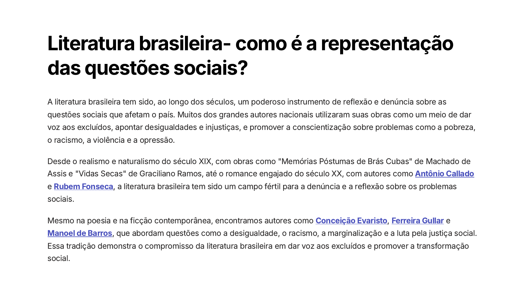 Literatura brasileira- como é a representação das questões sociais? A literatura brasileira tem sido, ao longo dos séculos, um poderoso instrumento de reflexão e denúncia sobre as questões sociais que afetam o país. Muitos dos grandes autores nacionais utilizaram suas obras como um meio de dar voz aos excluídos, apontar desigualdades e injustiças, e promover a conscientização sobre problemas como a pobreza, o racismo, a violência e a opressão. Desde o realismo e naturalismo do século XIX, com obras como "Memórias Póstumas de Brás Cubas" de Machado de Assis e "Vidas Secas" de Graciliano Ramos, até o romance engajado do século XX, com autores como Antônio Callado e Rubem Fonseca, a literatura brasileira tem sido um campo fértil para a denúncia e a reflexão sobre os problemas sociais. Mesmo na poesia e na ficção contemporânea, encontramos autores como Conceição Evaristo, Ferreira Gullar e Manoel de Barros, que abordam questões como a desigualdade, o racismo, a marginalização e a luta pela justiça social. Essa tradição demonstra o compromisso da literatura brasileira em dar voz aos excluídos e promover a transformação social. https://pt.wikipedia.org/wiki/Ant%C3%B4nio_Callado https://pt.wikipedia.org/wiki/Rubem_Fonseca https://pt.wikipedia.org/wiki/Concei%C3%A7%C3%A3o_Evaristo https://pt.wikipedia.org/wiki/Ferreira_Gullar https://pt.wikipedia.org/wiki/Manoel_de_Barros O cânone da literatura brasileira em debate- quais os principais pontos? O cânone da literatura brasileira, ou o conjunto de obras e autores consagrados como referência, tem sido alvo de acalorados debates nas últimas décadas. Essa discussão reflete a necessidade de uma maior inclusão e representatividade de vozes tradicionalmente excluídas do cânone, como escritores negros, indígenas, LGBTQIA+, de periferias e mulheres. Questiona-se a hegemonia de autores brancos, urbanos e masculinos que por muito tempo ditaram os padrões da "grande literatura" brasileira. Autores como Conceição Evaristo, Ferréz, Jarid Arraes e Marcelino Freire têm ganhado notoriedade, desafiando a noção tradicional de cânone e ampliando os limites do que se entende por literatura de qualidade. Esse movimento busca dar voz a perspectivas diversas, refletindo a pluralidade da experiência humana no Brasil. O debate sobre o cânone é, portanto, um importante passo para a democratização e a representatividade na literatura nacional. Qual O Futuro da Literatura Brasileira? À medida que a literatura brasileira continua a evoluir, é fascinante imaginar o que o futuro reserva. Com a crescente diversidade de vozes e perspectivas, a literatura nacional promete se tornar ainda mais rica e representativa. Novos autores emergentes, muitos deles de comunidades historicamente marginalizadas, trarão narrativas inovadoras que irão desafiar e ampliar os limites do cânone literário. Ao mesmo tempo, escritores consagrados continuarão a explorar temas profundos que refletem a complexa realidade brasileira, como questões sociais, políticas e ambientais. Suas obras servirão como poderosos instrumentos de reflexão, conscientização e transformação. Com o avanço da tecnologia, também é provável que surjam novas formas de experimentação literária, incorporando elementos digitais e realidade aumentada. Independentemente das mudanças, uma coisa é certa: a literatura brasileira permanecerá como um potente veículo de expressão cultural, espelhando a diversidade, os desafios e as aspirações de um país em constante transformação. Seu futuro é cheio de promessas, com a possibilidade de criar impacto duradouro na sociedade e na consciência coletiva. https://www.example.com/literatura-digital https://www.example.com/realidade-aumentada-literatura
