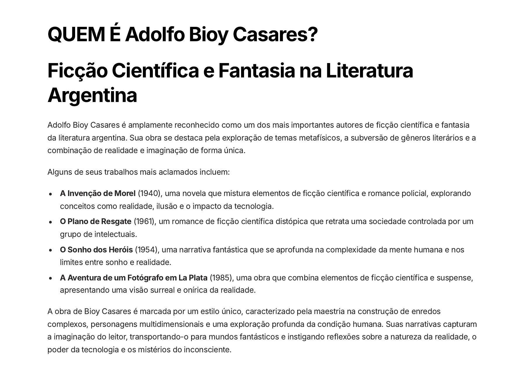 QUEM É Adolfo Bioy Casares? Ficção Científica e Fantasia na Literatura Argentina Adolfo Bioy Casares é amplamente reconhecido como um dos mais importantes autores de ficção científica e fantasia da literatura argentina. Sua obra se destaca pela exploração de temas metafísicos, a subversão de gêneros literários e a combinação de realidade e imaginação de forma única. Alguns de seus trabalhos mais aclamados incluem: A Invenção de Morel (1940), uma novela que mistura elementos de ficção científica e romance policial, explorando conceitos como realidade, ilusão e o impacto da tecnologia. O Plano de Resgate (1961), um romance de ficção científica distópica que retrata uma sociedade controlada por um grupo de intelectuais. O Sonho dos Heróis (1954), uma narrativa fantástica que se aprofunda na complexidade da mente humana e nos limites entre sonho e realidade. A Aventura de um Fotógrafo em La Plata (1985), uma obra que combina elementos de ficção científica e suspense, apresentando uma visão surreal e onírica da realidade. A obra de Bioy Casares é marcada por um estilo único, caracterizado pela maestria na construção de enredos complexos, personagens multidimensionais e uma exploração profunda da condição humana. Suas narrativas capturam a imaginação do leitor, transportando-o para mundos fantásticos e instigando reflexões sobre a natureza da realidade, o poder da tecnologia e os mistérios do inconsciente. QUEM É Silvina Ocampo? Poesia e o Universo Feminino Silvina Ocampo, notável escritora argentina do século XX, é reconhecida por sua contribuição única à poesia e sua exploração profunda do universo feminino. Sua obra é marcada por uma sensibilidade ímpar, capaz de capturar nuances psicológicas e vivências íntimas das mulheres. As composições de Ocampo são tecidas com riqueza de detalhes, revelando um olhar introspectivo e uma atenção aos pequenos gestos e movimentos que compõem a experiência feminina. Sua poesia se destaca pela forma inovadora de lidar com temas recorrentes, como a memória, a solidão e a passagem do tempo. Além da maestria em transmitir a sensibilidade feminina, a obra de Silvina Ocampo é marcada por sua inegável originalidade. Seus versos desafiam as convenções, explorando o fantástico e o onírico, e convidando o leitor a mergulhar em um universo poético único e transformador. Sua escrita delicada e vibrante posiciona Ocampo como uma das vozes mais influentes da literatura argentina, deixando um legado duradouro e inspirador para as próximas gerações de escritoras. QUEM É Ricardo Piglia? A Metaficção e a Investigação Literária Ricardo Piglia, um dos mais influentes escritores argentinos contemporâneos, é reconhecido por sua abordagem inovadora da ficção. Suas obras são marcadas pela metaficção, uma técnica que expõe o próprio processo de criação literária, desafiando os limites entre realidade e ficção. Piglia mergulha profundamente na investigação da natureza da literatura, explorando temas como a identidade, a linguagem e o papel do autor. Em suas narrativas, Piglia frequentemente se vale de personagens envolvidos em investigações literárias, como críticos, escritores ou leitores atentos. Essas personagens atuam como observadores e intérpretes da própria ficção, guiando o leitor por meio de uma jornada repleta de surpresas e revelações. Sua prosa é marcada por uma sofisticada estrutura narrativa, com camadas de significado que se desdobram gradualmente, convidando o leitor a se engajar ativamente na construção do sentido. Além de sua maestria na ficção, Piglia é também um influente teórico e crítico literário. Suas reflexões sobre a literatura e o papel do escritor têm sido fundamentais para a compreensão da literatura argentina contemporânea. Sua obra é reconhecida por sua profundidade intelectual, sua capacidade de desafiar os limites da ficção e sua contribuição inestimável para a renovação da literatura argentina.