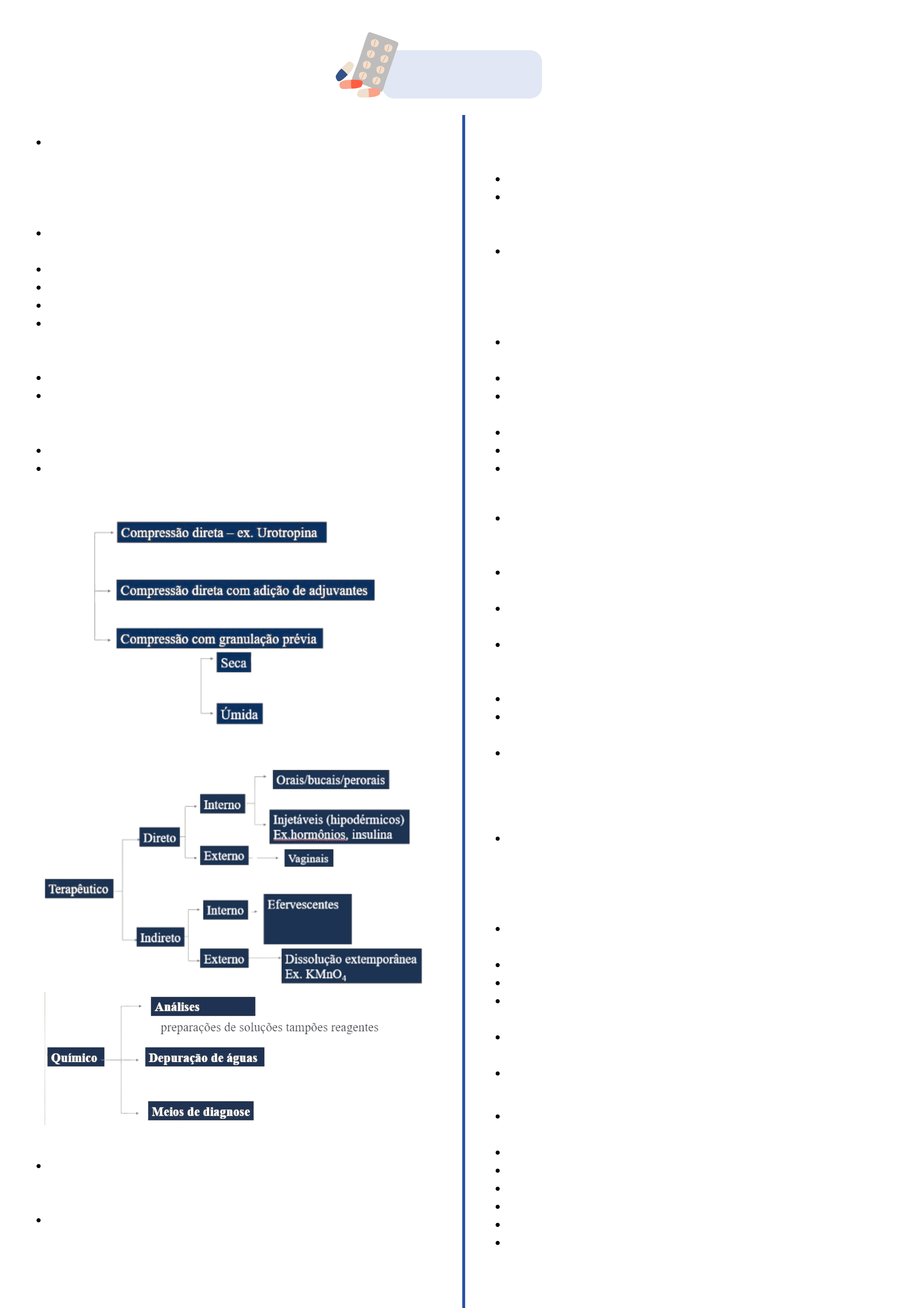 Comprimidos Conceito Forma farmacêutica sólida, de dose unitária, obtida por compressão. Cada comprimido contém uma única dose de um ou mais fármacos. Vantagens Precisão na dosagem, possibilidade de grande variação nas doses; Conservação (ausência de água); Fácil administração e portabilidade (tamanho reduzido); Fácil transporte e armazenamento; Fácil produção, com grande rendimento – tecnologia relativamente simples permite produção em grande volume; Quase todas as substâncias podem ser comprimidas; Direcionamento da liberação do princípio ativo. Desvantagens Diminuição da biodisponibilidade Impacto gástrico - > [ ] em locais pontuais → irritação Quanto a tecnologia de obtenção: Quanto ao emprego: Tipos de comprimidos - Peroral (boca-estômago) Comprimidos convencionais ou desintegráveis: É o mais comum. É desenvolvido para ser ingerido e liberado em um espaço relativamente curto de tempo por desintegração e dissolução. É absorvido no estômago. Incluem os seguintes adjuvantes: diluente, desintegrante, aglutinante, deslizante, lubrificante, corante, tampão, molhante, agente de dissolução, flavorizante e antiaderente. Comprimidos mastigáveis: Desintegração rápida e completa. Ex. comprimidos antiácidos. Facilitar a ingestão do comprimido. Ex. crianças e idosos. Possibilidade de uso quando não há disponibilidade de água. Não apresentam desintegrantes na sua composição. Adição de flavorizantes e corantes. Ex. sorbitol e manitol. Absorção no estomago Tipos de comprimidos - Oral Pastilhas: São comprimidos de dissolução bucal lenta, liberando o fármaco dissolvido na saliva. As pastilhas demoram a serem dissolvidas porque os açucares saturam as glândulas salivares, impedindo a salivação. 1. Anti-sépticos e antibióticos, anestésicos locais e expectorantes. Comprimidos de cedência lenta para tratamento local. Não apresentam desintegrantes. Adjuvantes – sabor agradável (sacarose, glicose, sorbitol e manitol). Não devem conter talco e estearato de magnésio devido ao sabor particular dessas substâncias. Absorção na boca Comprimidos efervescentes: Libera CO2 em água, resultado da reação entre um carbonato ou bicarbonato e um ácido fraco, como os ácidos cítrico e tartárico. Facilita a desintegração do comprimido e a distribuição do fármaco. Dissolução completa do fármaco obtida em poucos minutos. São empregados para produzir rápida ação dos fármacos, por exemplo, analgésicos, ou facilitar a ingestão do fármaco, como, por exemplo, vitaminas. Absorção no intestino Os comprimidos efervescentes devem ficar no fundo do copo. O princípio ativo está no gás (o gás permeia as membranas) Forma Influi na estabilidade para transporte e armazenagem. Em algumas circunstâncias o tamanho e a forma podem influenciar na desintegração. A forma do comprimido altera alguma coisa? Sim, a forma do comprimido pode influenciar fatores como a dissolução, a preferência do paciente e o tempo que leva para fazer efeito, dependendo da situação específica. Comprimidos sublinguais e bucais: São empregados para a cedência do fármaco na cavidade oral com subseqüente absorção sistêmica do fármaco. Liberação imediata: Nitroglicerina Sem efeito de primeira passagem hepática. Comprimidos sublinguais – embaixo da linha. Comprimidos bucais – lateralmente, nas bochechas. São normalmente pequenos, lisos, sem borda agudas. Absorção na boca Tipos de comprimidos - Oral Nova geração Alta liberação do ativo, Maior eficiência em mascarar gosto, Baixa friabilidade, Menor custo, Mais opções de embalagem, Expansão das aplicações terapêuticas Propriedades ideias para um sistema de liberação oral Não necessitar de água e dissolver ou desintegrar na boca em segundos, Alto poder de cedência do ativo, Proporcionar sabor agradável, O mascarador de sabor ser compatível com os demais excipientes, Deixe o mínimo de resíduo ou nenhum na boca, Ter dureza e não ser friável. 250ml de água melhora a absorção, pois é o volume máximo do lúmen Cápsula= beber água antes de ingerir para lubrificar o esôfago Tipos de ingredientes para comprimidos Ativo Diluente Aglutinante (granulação úmida) Super desintegrante Lubrificante e deslizante Aromatizante, adoçante Corante Molhante Tampão Para evitar alto custo do medicamento, só usa todos os ingredientes acima se realmente for necessário. Volume de dose/solubilidade A dose é expressa em peso enquanto que a solubilidade do fármaco é expressa em termos de peso dissolvido pôr unidade de volume Quando a dose é dividida pela solubilidade, este resulta em uma determinação de volume mg/ (mg/mL) = mL O volume de dose/solubilidade é o volume mínimo de solvente necessário para dissolver a dose. Vantagens Facilidade de administração para geriatria, pediatria, psiquiatria e pacientes em coma, Não há necessidade de água, Precisão de dose, boa estabilidade física e química, Possibilidade de aumentar a biodisponibilidade devido a rápida absorção e nível concentração plasmática. Limitações/Desvantagens Os comprimidos normalmente tem baixa força de compressão, Deixa gosto desagradável se não formulado corretamente, Fármacos de elevada dose são difíceis de formular, Requer um sistema de embalagem adequado para garantir a estabilidade, São produtos higrocópicos por natureza, portanto, guardar em lugar seco. Tipos de comprimidos- Parenteral Injetáveis : Preparação de soluções estéreis a partir de P.A e adjuvantes hidrossolúveis. Os adjuvantes devem ser livres de efeitos fisiológicos, farmacológicos e pirogênio (lactose , sacarose sorbitol e cloreto de sódio). Implantes: Aplicação abaixo da pele (hormônios) e condições estéreis. Absorção subcutânea Tipos de comprimidos- Externo Para dissolver: Preparo de soluções antisépticas Vaginais: P.A para uso local na mucosa e solubilização lenta. Adjuvantes com boa so