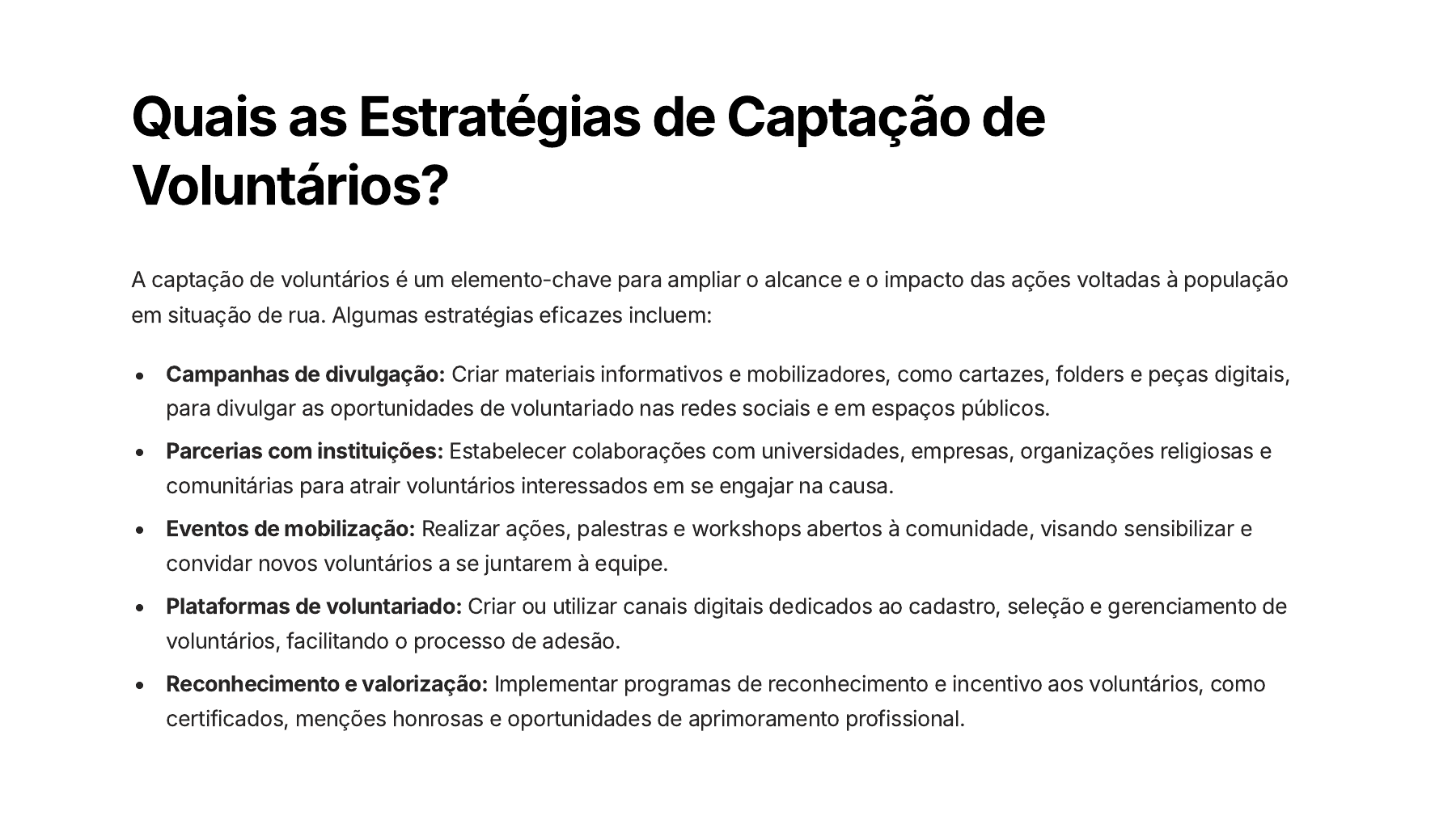 Quais as Estratégias de Captação de Voluntários? A captação de voluntários é um elemento-chave para ampliar o alcance e o impacto das ações voltadas à população em situação de rua. Algumas estratégias eficazes incluem: Campanhas de divulgação: Criar materiais informativos e mobilizadores, como cartazes, folders e peças digitais, para divulgar as oportunidades de voluntariado nas redes sociais e em espaços públicos. Parcerias com instituições: Estabelecer colaborações com universidades, empresas, organizações religiosas e comunitárias para atrair voluntários interessados em se engajar na causa. Eventos de mobilização: Realizar ações, palestras e workshops abertos à comunidade, visando sensibilizar e convidar novos voluntários a se juntarem à equipe. Plataformas de voluntariado: Criar ou utilizar canais digitais dedicados ao cadastro, seleção e gerenciamento de voluntários, facilitando o processo de adesão. Reconhecimento e valorização: Implementar programas de reconhecimento e incentivo aos voluntários, como certificados, menções honrosas e oportunidades de aprimoramento profissional. Quais os Indicadores de Qualidade e Resultados? Para avaliar o impacto e a efetividade das ações voltadas à saúde da população em situação de rua, é fundamental estabelecer um sistema de monitoramento e avaliação baseado em indicadores de qualidade e resultados. Esses indicadores devem abranger diferentes dimensões, como acesso aos serviços, satisfação dos usuários, desfechos clínicos, redução de agravos e melhoria da qualidade de vida. Indicador Descrição Meta Cobertura de vacinação Percentual da população em situação de rua com esquema vacinal completo 90% Detecção precoce de tuberculose Proporção de casos novos de tuberculose identificados e tratados precocemente 80% Adesão ao tratamento Percentual de pacientes que mantêm a regularidade no tratamento de doenças crônicas 75% Satisfação do usuário Nível de satisfação dos usuários com os serviços de saúde recebidos 80% Redução de internações Diminuição do número de internações hospitalares por condições sensíveis à atenção primária 20% O monitoramento desses indicadores, juntamente com a análise dos dados coletados, permitirá identificar gargalos, planejar ações corretivas e direcionar melhorias contínuas no atendimento à população em situação de rua. Essa abordagem baseada em evidências é fundamental para demonstrar o impacto positivo das intervenções e garantir a sustentabilidade das ações de saúde. Qual o papel da Disseminação de Conhecimentos? A disseminação de conhecimentos desempenha um papel fundamental no cuidado com a saúde dos moradores de rua. Como profissionais de enfermagem, temos a responsabilidade de compartilhar os aprendizados adquiridos, tanto com a equipe multiprofissional quanto com a própria comunidade atendida. Através de ações de educação em saúde, podemos empoderar os indivíduos em situação de rua, capacitando-os a cuidar melhor de sua saúde e a acessar os serviços disponíveis de forma mais efetiva. Estratégias como oficinas, rodas de conversa e material educativo adaptado à realidade dessa população podem ser utilizadas para disseminar orientações sobre prevenção de doenças, hábitos saudáveis, direitos e acesso aos serviços de saúde. Ao mesmo tempo, é importante que os profissionais estejam abertos a aprender com as experiências e conhecimentos dos próprios usuários, criando um diálogo horizontal e enriquecedor para ambas as partes. Além disso, o compartilhamento de boas práticas e lições aprendidas entre os serviços de saúde é essencial para aprimorar continuamente a assistência prestada. Reuniões, publicações e eventos científicos podem ser utilizados como canais para disseminar os avanços e desafios enfrentados no cuidado à população em situação de rua. Dessa forma, a disseminação de conhecimentos se torna um pilar fundamental para o fortalecimento das ações de saúde voltadas a esse público vulnerável, contribuindo para uma assistência cada vez mais qualificada, efetiva e alinhada às suas necessidades.