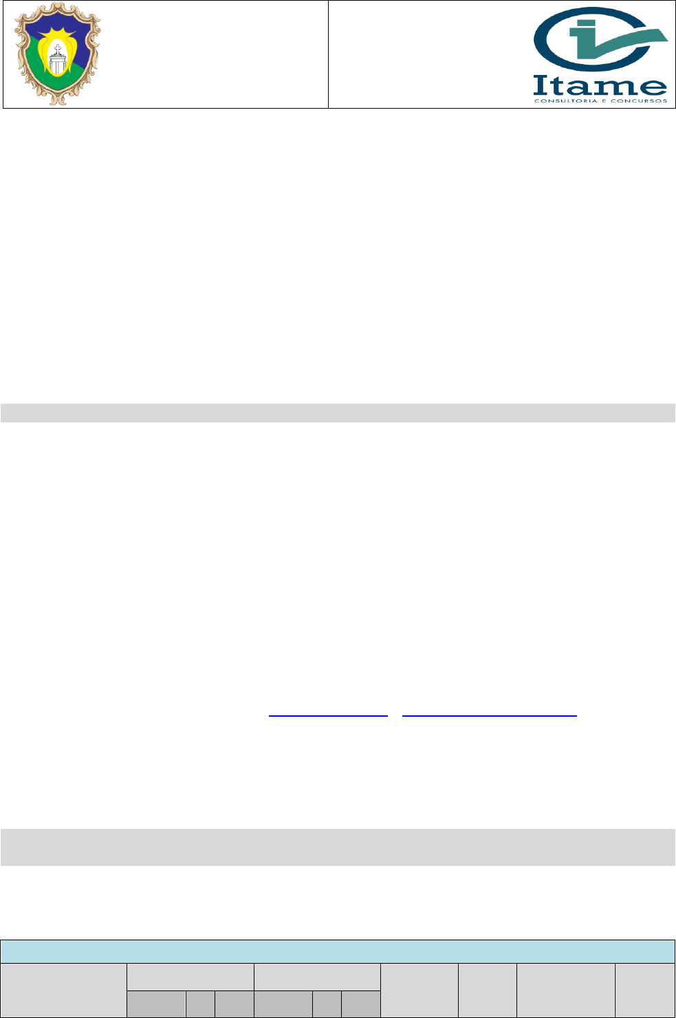 CÂMARA MUNICIPAL DE GOIÁS Página 1 de 32 CONCURSO PÚBLICO N. 01/2024 EDITAL 01 – ABERTURA E REGULAMENTO GERAL REGULAMENTA O CONCURSO PÚBLICO PARA INGRESSO NAS CARREIRAS DE CARGOS EFETIVOS DA CÂMA- RA MUNICIPAL DA CIDADE DE GOIÁS - GO A CÂMARA MUNICIPAL DE GOIÁS-GO, com sede localizada na Rua 15 de novembro, n. 18, Cidade de Goiás, Goiás, CEP: 76600-000, Telefone: (62) 3371-1316, através da Comissão Especial de Concurso Público - CECP, nomeada pela Portaria n. 23/2024, torna público a abertura de Concurso Público visando à seleção de pes- soal para preenchimento de vagas no quadro de cargos efetivos do Poder Legislativo, em conformidade com o disposto na Lei Orgânica do Município, Estatuto dos Servidores Públicos do Município (Lei Municipal n. 169/95), Regimento Interno da Câmara Municipal de Goiás (Resolução n. 02/2022), Lei Complementar n. 21/2024 (Dispõe sobre a reformulação da estrutura administrativa da Câmara Municipal de Goiás), nas de- mais leis municipais aplicáveis e nas disposições previstas neste regulamento e seus anexos. 1. DAS DISPOSIÇÕES GERAIS PRELIMINARES 1.1 O concurso público será realizado pela banca organizadora do ITAME - INSTITUTO DE CONSULTORIA E CONCURSOS, encarregado do planejamento, organização, elaboração, aplicação e correção das provas, com fiscalização da Comissão Especial do Concurso nomeada pelo Chefe do Poder Legislativo Municipal. 1.2 No concurso público serão exigidos níveis de conhecimento e grau de complexidade compatíveis com a escolaridade e atribuições de cada cargo. 1.3 O concurso público tem por finalidade o preenchimento das vagas abertas ou que forem criadas no pra- zo de validade do certame, bem como para formação do cadastro de reserva técnica. 1.4 Os candidatos aprovados no cadastro de reserva poderão ser convocados e nomeados na hipótese de abertura de novas vagas dentro do prazo de validade do certame. 1.5 Os horários mencionados neste edital terão como referência o horário oficial de Brasília-DF. 1.6 A relação de trabalho dos candidatos nomeados em decorrência de aprovação no concurso público será disciplinada pelo regime jurídico estatutário estabelecido por Lei Municipal. 1.7 A lotação dos candidatos aprovados e nomeados atenderá às necessidades da Câmara Municipal de Goi- ás – GO. 1.8 As publicações dos atos do concurso público serão realizadas no Diário Oficial do Estado, jornal de gran- de circulação, placar da Câmara e nos sites www.itame.com.br e www.camaragoias.go.gov.br. 1.9 Será responsabilidade do candidato acompanhar as publicações dos atos e comunicados do concurso, inclusive as datas, locais e horários de realização das provas, em todas as etapas do certame. 1.10 O cronograma de atividades do concurso consta no ANEXO I deste Edital, podendo sofrer alterações nas datas das provas e demais atos do certame, de acordo com as necessidades do Poder Legislativo Munici- pal. 2. DOS CARGOS/ VAGAS/CADASTRO DE RESERVA/VENCIMENTOS/ESCOLARIDADE/CARGA HORÁRIA/TIPO DE PROVA E PONTO DE CORTE 2.1 Os cargos, a quantidade de vagas abertas para ampla concorrência, o cadastro de reserva, as vagas re- servadas, os vencimentos, a carga horária semanal, os tipos de provas e o ponto de corte são descritos no quadro abaixo: ENSINO FUNDAMENTAL CARGOS/FUNÇÃO VAGAS EFETIVAS CADASTRO DE RESERVA VENCIMENTOS CARGA HORÁRIA SEMANAL TIPOS DE PROVAS PONTO DE CORTE Ampla Concorrência ¹PcD ²Cota Ampla Concorrência ¹PcD ²Cota http://www.itame.com.br/ http://www.camaragoias.go.gov.br/ CÂMARA MUNICIPAL DE GOIÁS Página 2 de 32 AGENTE DE APOIO BÁSICO 1 - - 3 1 1 R$ 2.149,73 40 horas Prova objetiva 6º ENSINO MÉDIO CARGOS/FUNÇÃO VAGAS EFETIVAS CADASTRO DE RESERVA VENCIMENTOS CARGA HORÁRIA SEMANAL TIPOS DE PROVAS/ REQUISITOS PONTO DE CORTE Ampla Concorrência ¹PcD ²Cota Ampla Concorrência ¹PcD ²Cota ANALISTA ADMINISTRATI- VO LEGISLATIVO 2 - - 4 1 1 R$ 3.571,72 40 horas Prova objetiva 8º EXECUTOR ADMINISTRATI- VO LEGISLATIVO 3 - 1 9 1 2 R$ 3.571,72 40 horas Prova objetiva 16º MOTORISTA 1 - - 3 - 1 R$ 2.844,00 40 horas Prova objetiva + CNH categoria “D” 5º ENSINO SUPERIOR CARGOS/FUNÇÃO VAGAS EFETIVAS CADASTRO DE RESERVA VENCIMENTOS CARGA HORÁRIA SEMANAL TIPOS DE PROVAS PONTO DE CORTE Ampla Concorrência ¹PcD ²Cota Ampla Concorrência ¹PcD ²Cota ANALISTA LEGISLATIVO EM COMUNICAÇÃO SOCIAL 1 - - 3 - 1 R$ 3.571,72 30 horas Prova objetiva + Registro no Órgão Profissional 5º CONTROLADOR INTERNO 1 - - 3 - 1 R$ 3.750,30 40 horas Prova objetiva + Registro no Órgão Profissional 5º ¹PcD (Pessoa com Deficiência – Portaria n. 2.344/10 - Secretaria dos Direitos Humanos). ²Cota (Reserva de vagas para os candidatos negros/ pardos – Lei Municipal n. 160/2017). 2.2 Os candidatos que forem nomeados receberão os vencimentos previstos no quadro acima e as demais vantagens previstas na legislação municipal em vigor. 2.3 No certame serão ofertadas 10 (dez) vagas para ampla concorrência e 35 (trinta e cinco) vagas para formação do cadastro de reserva técnica, cujo preenchimento ocorrerá de acordo com as necessidades da Câmara Municipal de Goiás – GO, durante o prazo de validade do concurso. 2.4 A descrição das atribuições sumárias dos cargos e os requisitos para provimento constam no ANEXO III deste edital, em conformidade com a legislação municipal vigente. 2.5 Os valores das taxas de inscrição serão de R$ 70,00 (setenta reais) para os cargos de nível fundamental, R$ 90,00 (noventa reais) para os cargos de ensino médio e R$ 120,00 (cento e vinte reais) para os cargos de nível superior. 2.6 Ficam reservadas para cada cargo 20% (vinte por cento) das vagas abertas ou que forem criadas no prazo de validade do concurso para os candidatos negros (pretos e pardos), nos termos da Lei Municipal n. 160/2017. 2.7 Ficam reservadas para cada cargo, no mínimo, 5% (cinco por cento) das vagas abertas ou que forem cria- das no p