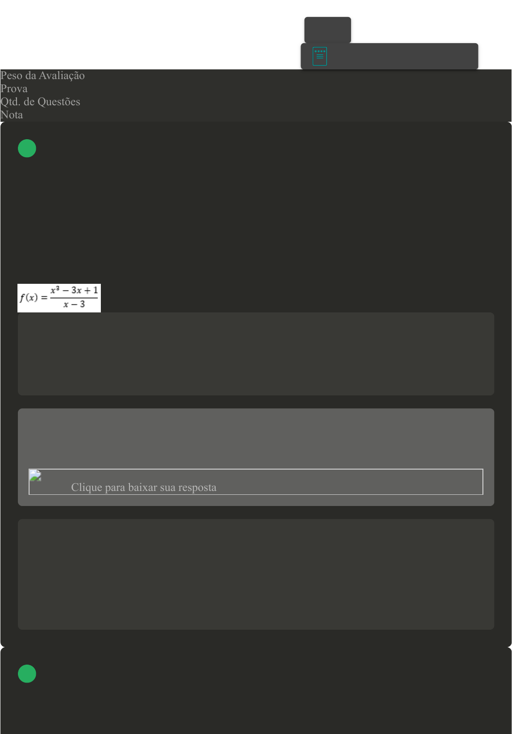 Prova Impressa GABARITO | Avaliação Final (Discursiva) - Individual (Cod.:959190) Peso da Avaliação 2,00 Prova 82317043 Qtd. de Questões 2 Nota 6,50 O assunto de limite estudado até o momento terá grande participação na análise do comportamento gráfico das funções. As duas principais utilizações dos limites, é na busca de assíntotas horizontais ou verticais. No caso das horizontais, basta aplicar o limite para mais e menos infinito e no caso das assíntotas verticais, a verificação do comportamento é realizada pelos limites laterais nos pontos de descontinuidade da função. Na função a seguir, realize os quatro limites comentados anteriormente e no caso da descontinuidade, realize com o valor 3. Resposta esperada . Minha resposta Resposta em anexo. 1234.pdfClique para baixar sua resposta Retorno da correção Prezado acadêmico, sua resposta não apresentou relação com os objetivos da questão e/ou com o assunto abordado, porém, identificamos uma tentativa de desenvolvimento da resposta. Sugerimos que nas próximas vezes você leia atentamente o enunciado da questão contemplando o assunto abordado. Com relação ao conceito de integral, existem várias aplicações que podemos destacar, principalmente na área das engenharias. A relação entre as derivadas e integrais tornou-se uma das ferramentas mais VOLTAR A+ Alterar modo de visualização 1 2 29/10/2024, 09:47 Avaliação Final (Discursiva) - Individual about:blank 1/3 poderosas para analisar diversos fenômenos. O primeiro passo para se construir o conceito de integral é estudar alguns critérios de cálculo. Sem assim, resolva a integral indefinida a seguir. Obs.: não esqueça de realizar todos os passos necessários para a resolução desta questão. Resposta esperada Minha resposta Resposta em anexo whatsapp_image_2024-06-06_at_1.pdfClique para baixar sua resposta 29/10/2024, 09:47 Avaliação Final (Discursiva) - Individual about:blank 2/3 Retorno da correção Parabéns, acadêmico, sua resposta atingiu os objetivos da questão e você contemplou o esperado, demonstrando a competência da análise e síntese do assunto abordado, apresentando excelentes argumentos próprios, com base nos materiais disponibilizados. Formulário - Cálculo Diferencial e Integral (MAD) - PauloClique para baixar o anexo da questão Imprimir 29/10/2024, 09:47 Avaliação Final (Discursiva) - Individual about:blank 3/3
