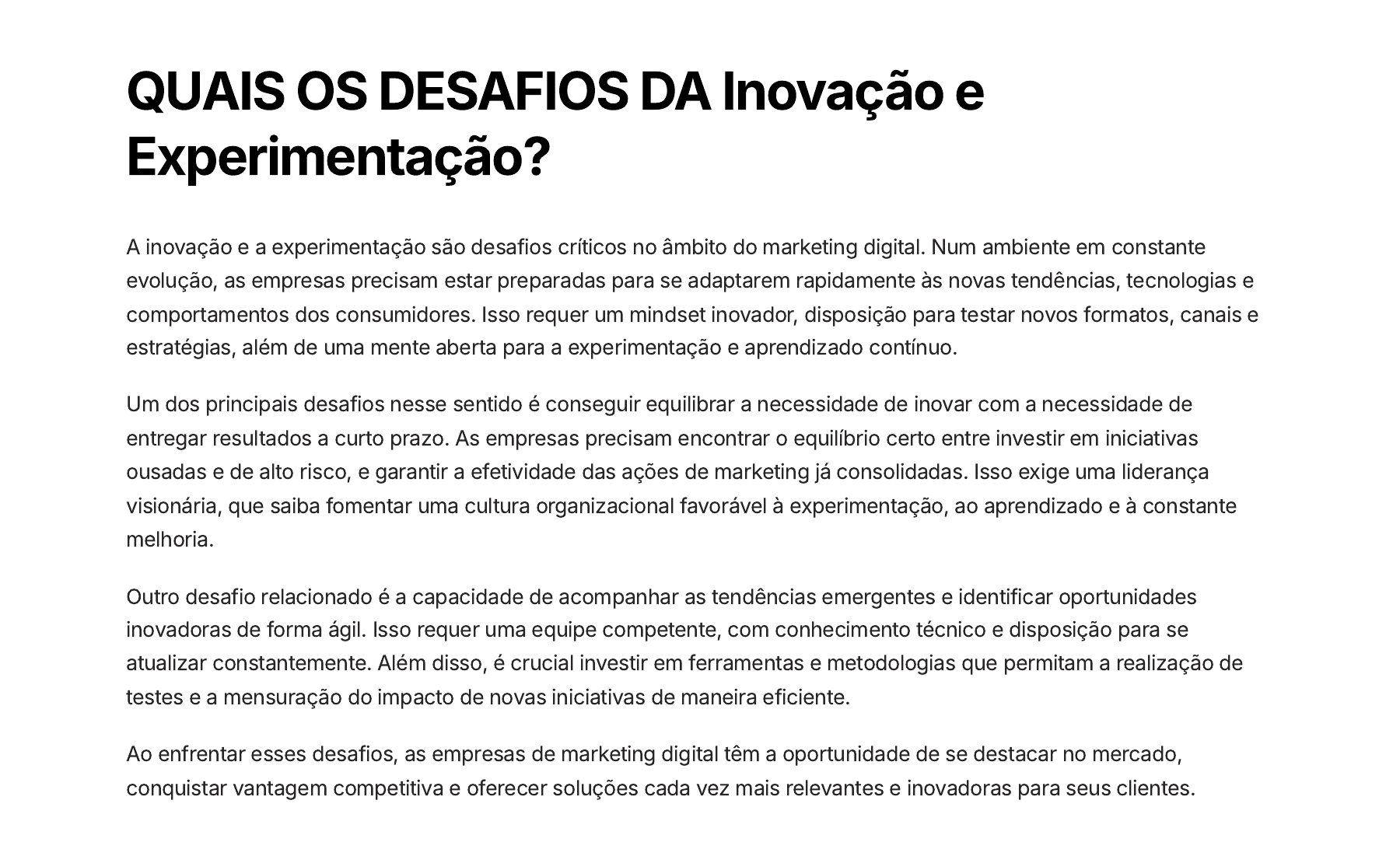 QUAIS OS DESAFIOS DA Inovação e Experimentação? A inovação e a experimentação são desafios críticos no âmbito do marketing digital. Num ambiente em constante evolução, as empresas precisam estar preparadas para se adaptarem rapidamente às novas tendências, tecnologias e comportamentos dos consumidores. Isso requer um mindset inovador, disposição para testar novos formatos, canais e estratégias, além de uma mente aberta para a experimentação e aprendizado contínuo. Um dos principais desafios nesse sentido é conseguir equilibrar a necessidade de inovar com a necessidade de entregar resultados a curto prazo. As empresas precisam encontrar o equilíbrio certo entre investir em iniciativas ousadas e de alto risco, e garantir a efetividade das ações de marketing já consolidadas. Isso exige uma liderança visionária, que saiba fomentar uma cultura organizacional favorável à experimentação, ao aprendizado e à constante melhoria. Outro desafio relacionado é a capacidade de acompanhar as tendências emergentes e identificar oportunidades inovadoras de forma ágil. Isso requer uma equipe competente, com conhecimento técnico e disposição para se atualizar constantemente. Além disso, é crucial investir em ferramentas e metodologias que permitam a realização de testes e a mensuração do impacto de novas iniciativas de maneira eficiente. Ao enfrentar esses desafios, as empresas de marketing digital têm a oportunidade de se destacar no mercado, conquistar vantagem competitiva e oferecer soluções cada vez mais relevantes e inovadoras para seus clientes. QUAIS OS DESAFIOS DA Colaboração entre equipes? A colaboração eficaz entre as equipes é um dos principais desafios no marketing digital. Com a crescente complexidade das estratégias e campanhas, é essencial que os departamentos de marketing, vendas, tecnologia e outros trabalhem de forma integrada e sincronizada. Essa integração permite uma melhor compreensão das necessidades dos clientes, uma abordagem mais coesa e personalizada, e a otimização dos recursos disponíveis. No entanto, muitas empresas ainda lutam com a comunicação fragmentada, falta de alinhamento de objetivos e silos departamentais que impedem uma colaboração efetiva. É fundamental investir em ferramentas de colaboração, processos de trabalho ágeis e treinamento em habilidades de trabalho em equipe para superar esses desafios. Ao promover uma cultura de colaboração, as empresas podem aproveitar melhor o conhecimento coletivo, integrar estratégias online e offline, e responder de forma mais ágil às necessidades em constante evolução dos clientes. Esse esforço conjunto é essencial para alcançar os objetivos de marketing digital e manter a competitividade em um mercado cada vez mais dinâmico. https://www.exemplo.com.br/integracaodepartamentos https://www.exemplo.com.br/integracaodepartamentos QUAL O PAPEL DA Educação e Treinamento da Equipe? O constante aprimoramento das habilidades da equipe de marketing digital é fundamental para enfrentar os desafios em um ambiente em rápida evolução. Investir em educação e treinamento contínuos é essencial para garantir que sua equipe esteja atualizada com as últimas tendências, tecnologias e melhores práticas do setor. Identificar Lacunas de Habilidades: Avalie regularmente as competências da sua equipe e identifique áreas-chave que precisam ser fortalecidas, como análise de dados, criação de conteúdo, otimização de SEO, gerenciamento de mídias sociais, entre outras. 1. Promover Treinamentos Específicos: Ofereça programas de treinamento direcionados a cada perfil, desde cursos online até workshops presenciais, para que sua equipe possa se aprofundar em habilidades técnicas e estratégicas essenciais. 2. Incentivar a Aprendizagem Contínua: Crie uma cultura organizacional que valorize a educação permanente, incentivando seus profissionais a participarem de eventos, conferências, leituras e outras atividades que os mantenham atualizados sobre as tendências do mercado. 3. Investir em Desenvolvimento Profissional: Ofereça oportunidades de crescimento e desenvolvimento, como programas de mentoria, bolsas de estudo e acesso a cursos de especialização, para que sua equipe possa se aprimorar e conquistar novas habilidades. 4. Promover Compartilhamento de Conhecimento: Estimule a troca de experiências e a colaboração entre os membros da equipe, criando espaços para que possam compartilhar aprendizados, melhores práticas e soluções inovadoras. 5.