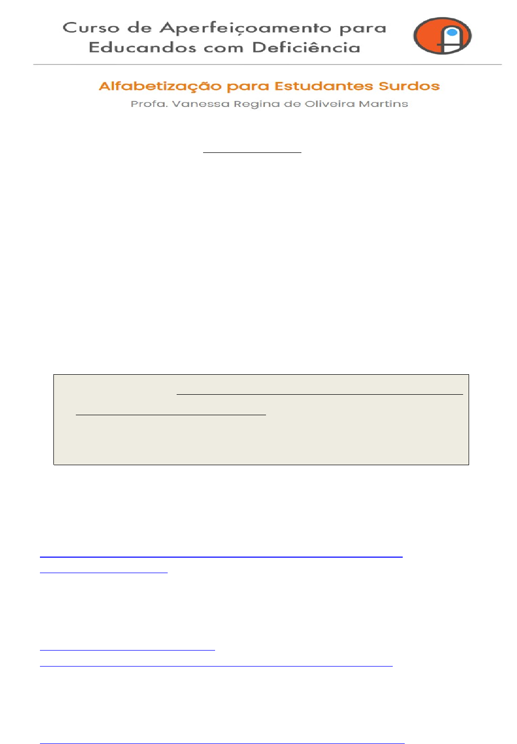 PLANO DE AULA Nome do aluno: BRUNA MARIANA PEREIRA VAZ Assista aos quatro vídeos selecionados e escolha apenas um deles para ser usado de apoio pedagógico. Você deverá desenvolver uma proposta interventiva de apoio ao educador regente, mas antes deve argumentar a escolha do vídeo, a partir da perspectiva da qualidade imagética de material não verbal para auxílio no desenvolvimento de linguagem em criança surda com aquisição tardia da Libras. · Dos quatro vídeos apenas um tem essa qualidade imagética como apoio ao desenvolvimento de linguagem para alunos surdos com aquisição tardia da Libras – aluno que ainda está se apropriando da língua de sinais, com pouco vocabulário e produção de sentenças com apenas 2 sinais. Vídeo 1 – Projeto #CasaLibras - Esta cidade é minha! - Quinho e seu cãozinho: https://www.youtube.com/watch?v=fw1J4jTxqbs&t=2s&ab_channel=%23CasaLibrasUFSCar Vídeo 2 – Ciclo da água – vídeo ilustrado: https://www.youtube.com/watch?v=KZTRy6KL7_c&ab_channel=SmileandLearn-Portugu%C3%AAs Vídeo 3 – A vovó e seu biscoito – animação em filme: https://www.youtube.com/watch?v=6YSxJnqCr8I&ab_channel=Leafy Vídeo 4 – Chapeuzinho vermelho – Tradução para Libras https://www.youtube.com/watch?v=zRwpzAY4pMU&ab_channel=MontenegroProdu%C3%A7%C3%B5es Imaginemos que o aluno tem 8 anos, produz gestualidade caseira e está no nível 1 de desenvolvimento da Libras: criança com aquisição tardia de linguagem iniciando a apropriação de sinais. Não fixa muito tempo o olhar para o enunciador e responde sempre com no máximo dois sinais em suas produções enunciativas. Esse nível é o que marca o processo inicial de aquisição de uma língua. Agora vamos para a atividade: 1. Qual vídeo foi selecionado e qual o motivo dessa escolha? Justifique a seguir: Selecionei o Vídeo 3 “A vovó e seu biscoito - animação em filme”, pois a animação apresenta uma narrativa visual clara, cores vivas, gestos expressivos, ações do cotidiano e cenas simples. As ações do cotidiano podem auxiliar a criança a associar sinais a objetos e ações, o que é essencial para um aluno que está começando a adquirir a linguagem. Para uma criança que está em fase inicial de aquisição de LIBRAS é mais fácil de compreender, já que as características favorecem o engajamento e auxilia no entendimento dos significados, mesmo para uma criança que não mantém o olhar fixo por muito tempo no Vídeo. A qualidade imagética do vídeo 3 facilita a associação de sinais com os objetos e ações apresentados, que é essencial para um aluno que possui vocabulário limitado e está desenvolvendo a capacidade de comunicação. 2. Por que os demais vídeos foram descartados? Qual a justificativa para isso? O Vídeo 1 “Projeto CasaLibras - Esta cidade é minha! - Quinho e seu cãozinho”, embora possa apresentar elementos do cotidiano, a narrativa é complexa para uma criança no nível inicial da Libras, dificultando a compreensão. O Vídeo 2 – “Ciclo da água – vídeo ilustrado”, o conteúdo trata de conceitos científicos, sendo abstrato e mais difícil para uma criança com vocabulário limitado e sem um conhecimento prévio da língua de sinais entender. O Vídeo 4 – “Chapeuzinho vermelho – Tradução para Libras”, apesar da história ser bem conhecida, a tradução para Libras é muito rápida e difícil de acompanhar para o aluno que está no processo inicial de aquisição da linguagem. 3. Pense em qual seria a colaboração desse vídeo selecionado para o professor regente. Imaginemos que o aluno surdo está nos anos iniciais do ensino fundamental. A animação oferece uma base visual que facilita a compreensão e a memorização dos sinais, permitindo que o aluno associe os gestos aos objetos e ações da história. O vídeo selecionado pode colaborar para a ampliação do vocabulário e o desenvolvimento de habilidades de comunicação em Libras. Plano de Agora Indique apenas uma proposta pedagógica que pode ser feita a partir do vídeo escolhido. Pense na indicação de uma atividade para o professor regente fazer com o aluno surdo a partir do vídeo. Aula: A Vovó e seu Biscoito Público-alvo: 3º ano do Ensino Fundamental – Aluno surdo Duração: 50 minutos Objetivo: Desenvolver a compreensão de histórias narrativas e estimular a expressão em Libras por meio da dramatização e recontagem. 1. Objetivos Específicos • Compreender e sequenciar os eventos narrativos do vídeo “A vovó e seu biscoito”. • Recontar a história utilizando a linguagem de sinais (Libras). • Desenvolver habilidades de interpretação e expressão corporal em Libras. • Ampliar o vocabulário em Libras, incluindo sinais relacionados à história. 2. Materiais Necessários • Vídeo “A Vovó e seu Biscoito” (disponível no YouTube no link: https://www.youtube.com/watch?v=6YSxJnqCr8I&ab_channel=Leafy • Cartões com imagens representativas das cenas principais. • Quadro ou cartolina para organizar a sequência dos eventos com figuras. • Recursos para dramatização (como adereços simples que representem personagens ou objetos do vídeo). 3. Desenvolvimento Início (10 minutos) • Apresentar o vídeo e explicar que será realizada uma atividade de recontagem e dramatização. • Assistir ao vídeo junto com o aluno, pedindo que observe os detalhes e identifique o começo, o meio e o fim da história. • Discutir brevemente em Libras sobre o que ele achou do vídeo estimulando ele a compartilhar suas impressões. Desenvolvimento (30 minutos) • Dividir a história em partes e trabalhar com o aluno para identificar as cenas mais importantes, utilizando os cartões com imagens para ajudar na compreensão. • Pedir ao aluno para colocar os cartões em ordem da sequência dos eventos. • Orientar a dramatização em Libras, incentivando o aluno a interpretar as cenas com gestos, expressões faciais e sinais apropriados. • O professor ir