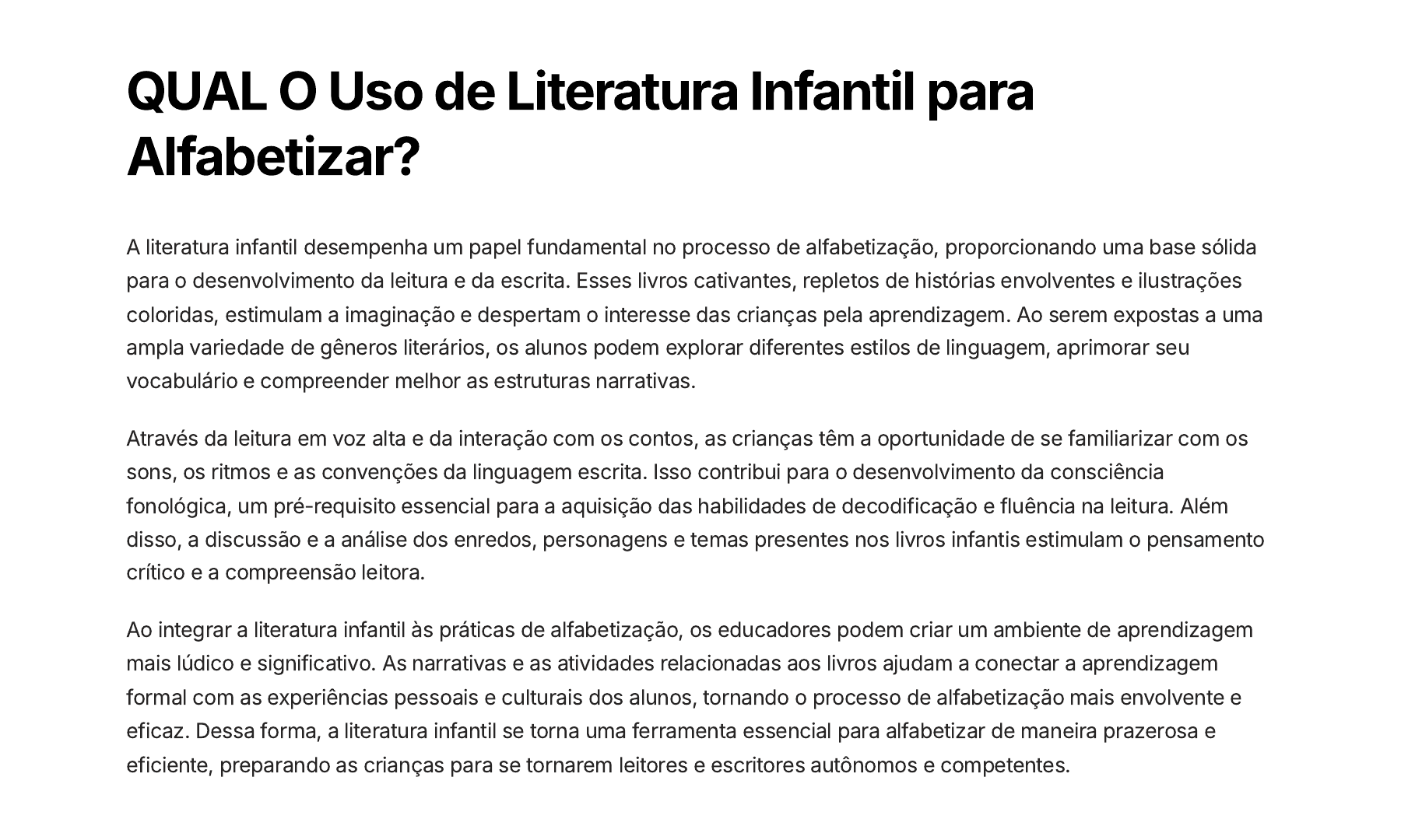 QUAL O Uso de Literatura Infantil para Alfabetizar? A literatura infantil desempenha um papel fundamental no processo de alfabetização, proporcionando uma base sólida para o desenvolvimento da leitura e da escrita. Esses livros cativantes, repletos de histórias envolventes e ilustrações coloridas, estimulam a imaginação e despertam o interesse das crianças pela aprendizagem. Ao serem expostas a uma ampla variedade de gêneros literários, os alunos podem explorar diferentes estilos de linguagem, aprimorar seu vocabulário e compreender melhor as estruturas narrativas. Através da leitura em voz alta e da interação com os contos, as crianças têm a oportunidade de se familiarizar com os sons, os ritmos e as convenções da linguagem escrita. Isso contribui para o desenvolvimento da consciência fonológica, um pré-requisito essencial para a aquisição das habilidades de decodificação e fluência na leitura. Além disso, a discussão e a análise dos enredos, personagens e temas presentes nos livros infantis estimulam o pensamento crítico e a compreensão leitora. Ao integrar a literatura infantil às práticas de alfabetização, os educadores podem criar um ambiente de aprendizagem mais lúdico e significativo. As narrativas e as atividades relacionadas aos livros ajudam a conectar a aprendizagem formal com as experiências pessoais e culturais dos alunos, tornando o processo de alfabetização mais envolvente e eficaz. Dessa forma, a literatura infantil se torna uma ferramenta essencial para alfabetizar de maneira prazerosa e eficiente, preparando as crianças para se tornarem leitores e escritores autônomos e competentes. COMO USAR A Avaliação Formativa na Jornada de Alfabetização? A avaliação formativa desempenha um papel crucial na jornada de alfabetização, permitindo acompanhar de perto o progresso dos alunos e ajustar estratégias de ensino para atender às suas necessidades específicas. Essa abordagem contínua e interativa de avaliação possibilita identificar lacunas de aprendizagem em tempo hábil, fornecer feedbacks construtivos e adaptar as práticas pedagógicas de forma ágil. Algumas estratégias eficazes de avaliação formativa incluem: Observações em sala de aula: Monitorar o desempenho dos alunos durante as atividades, identificando dificuldades e progressos para direcionar intervenções personalizadas. Avaliações informais: Utilizar avaliações rápidas e frequentes, como testes de leitura e escrita, para obter um panorama contínuo do desenvolvimento dos estudantes. Portfólios de trabalhos: Acompanhar o progresso por meio da compilação de amostras de atividades, permitindo uma visão holística da evolução do aluno. Feedback construtivo: Fornecer feedbacks imediatos e específicos, com sugestões claras de como o aluno pode melhorar, estimulando a autorregulação da aprendizagem. Ajustes instrucionais: Utilizar os dados da avaliação formativa para adaptar as estratégias de ensino, materiais didáticos e atividades, de modo a atender às necessidades individuais dos estudantes. Ao adotar uma abordagem de avaliação formativa, os educadores podem garantir que cada etapa da alfabetização seja acompanhada, apoiada e ajustada para impulsionar o progresso de todos os alunos, rumo ao domínio pleno da leitura e da escrita. Alfabetização e Criatividade- QUAL A RELAÇÃO? A alfabetização não se limita apenas ao domínio das habilidades básicas de leitura e escrita. Ela também desempenha um papel fundamental no desenvolvimento da criatividade das crianças. Ao serem expostas a uma variedade de textos, gêneros literários e atividades envolvendo a linguagem, as crianças em processo de alfabetização têm a oportunidade de expandir sua imaginação, explorar diferentes perspectivas e expressar-se de maneiras únicas. Incentivo à Expressão Criativa: Oferecer oportunidades para que as crianças escrevam histórias, poemas e narrativas pessoais estimula sua criatividade e capacidade de usar a língua de forma inovadora. 1. Conexões Interdisciplinares: Integrar a alfabetização a outras áreas, como artes, música e ciências, permite que as crianças explorem a linguagem de maneiras diversas e desenvolvam uma visão holística do conhecimento. 2. Resolução de Problemas: Desafiar as crianças a encontrar soluções criativas para problemas relacionados à leitura e escrita, como a criação de novos sinônimos ou a reescrita de contos clássicos, estimula o pensamento divergente. 3. Leitura de Textos Criativos: O contato com obras literárias inovadoras, que exploram a linguagem de maneira criativa, inspira as crianças a experimentar novos estilos e formas de expressão. 4. Jogo e Ludicidade: Atividades lúdicas envolvendo a linguagem, como jogos de palavras, dramatizações e criação de histórias, permitem que as crianças brinquem com a língua e desenvolvam sua criatividade de forma prazerosa. 5. Ao integrar a criatividade ao processo de alfabetização, os educadores podem estimular o desenvolvimento integral das crianças, preparando-as não apenas para serem leitoras e escritoras competentes, mas também para serem pensadoras inovadoras, capazes de explorar a linguagem de maneira única e expressiva.
