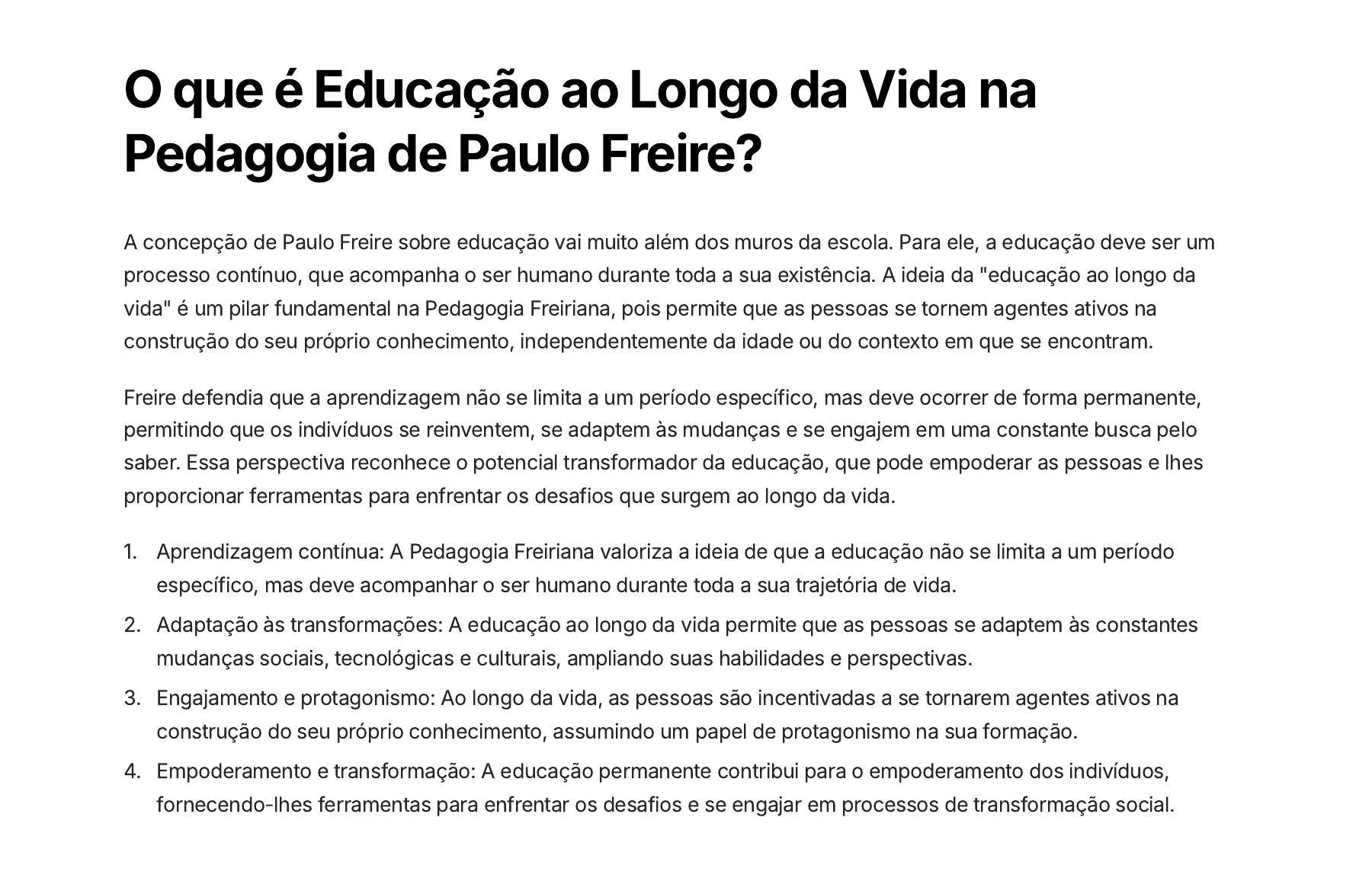 O que é Educação ao Longo da Vida na Pedagogia de Paulo Freire? A concepção de Paulo Freire sobre educação vai muito além dos muros da escola. Para ele, a educação deve ser um processo contínuo, que acompanha o ser humano durante toda a sua existência. A ideia da "educação ao longo da vida" é um pilar fundamental na Pedagogia Freiriana, pois permite que as pessoas se tornem agentes ativos na construção do seu próprio conhecimento, independentemente da idade ou do contexto em que se encontram. Freire defendia que a aprendizagem não se limita a um período específico, mas deve ocorrer de forma permanente, permitindo que os indivíduos se reinventem, se adaptem às mudanças e se engajem em uma constante busca pelo saber. Essa perspectiva reconhece o potencial transformador da educação, que pode empoderar as pessoas e lhes proporcionar ferramentas para enfrentar os desafios que surgem ao longo da vida. Aprendizagem contínua: A Pedagogia Freiriana valoriza a ideia de que a educação não se limita a um período específico, mas deve acompanhar o ser humano durante toda a sua trajetória de vida. 1. Adaptação às transformações: A educação ao longo da vida permite que as pessoas se adaptem às constantes mudanças sociais, tecnológicas e culturais, ampliando suas habilidades e perspectivas. 2. Engajamento e protagonismo: Ao longo da vida, as pessoas são incentivadas a se tornarem agentes ativos na construção do seu próprio conhecimento, assumindo um papel de protagonismo na sua formação. 3. Empoderamento e transformação: A educação permanente contribui para o empoderamento dos indivíduos, fornecendo-lhes ferramentas para enfrentar os desafios e se engajar em processos de transformação social. 4. Quais Desafios Éticos e Políticos da Pedagogia Freiriana? A Pedagogia de Paulo Freire enfrenta diversos desafios éticos e políticos em sua implementação. Alguns dos principais pontos a serem considerados incluem: Engajamento Político: A natureza inerentemente política da educação proposta por Freire exige um posicionamento claro e engajado dos educadores, o que pode gerar conflitos com sistemas educacionais mais conservadores. Neutralidade Ideológica: A recusa da suposta neutralidade da educação e a defesa de uma perspectiva crítica e transformadora é vista por alguns como uma imposição ideológica, demandando mediação e diálogo. Empoderamento dos Oprimidos: O objetivo de empoderar as classes marginalizadas e promover a conscientização política pode ser visto como ameaçador por grupos dominantes, exigindo cautela e estratégias de implementação. Diálogo Intercultural: A valorização dos saberes populares e a perspectiva de diálogo horizontal entre educador e educando requer uma abertura a diferentes visões de mundo e uma postura de humildade intelectual. Formação de Educadores: A formação de professores alinhada com os princípios freirianos é um desafio crucial, demandando uma transformação profunda nos modelos tradicionais de capacitação docente. Esses são apenas alguns dos muitos desafios éticos e políticos que a Pedagogia de Paulo Freire enfrenta em sua busca por uma educação transformadora e emancipatória. Sua implementação exige uma constante reflexão e negociação entre diferentes atores e interesses sociais. Pedagogia Freiriana- quais os movimentos sociais contemporâneos?? A Pedagogia de Paulo Freire tem sido amplamente adotada e adaptada por diversos movimentos sociais contemporâneos em todo o mundo. Esses movimentos, que lutam por justiça social, igualdade e transformação política, encontram na abordagem freireana uma poderosa ferramenta de conscientização, mobilização e empoderamento das comunidades marginalizadas. A educação como prática da liberdade, defendida por Freire, é especialmente relevante para os grupos oprimidos, que buscam se libertar de estruturas sociais opressoras e construir uma sociedade mais equânime. Movimentos de educação popular, luta por moradia, movimentos negros e indígenas têm encontrado na abordagem freiriana um modo de promover a conscientização, o diálogo e a transformação social em suas respectivas lutas. Ao incorporar os princípios da pedagogia do oprimido, esses movimentos amplificam suas vozes, fortalecem sua organização e impulsionam mudanças estruturais em busca de uma sociedade mais justa e inclusiva. https://www.brasildefato.com.br/2020/06/22/movimentos-sociais-adotam-pedagogia-freiriana-para-enfrentar-a-pandemia https://www.sinpro-rs.org.br/2020/06/24/movimentos-sociais-adotam-pedagogia-de-paulo-freire-para-enfrentar-a-pandemia/ https://www.uol.com.br/ecoa/reportagens-especiais/paulo-freire-e-os-movimentos-sociais/#cover https://www.opovo.com.br/noticias/brasil/2020/06/21/movimentos-sociais-adotam-pedagogia-de-paulo-freire-para-enfrentar-a-pandemia.html