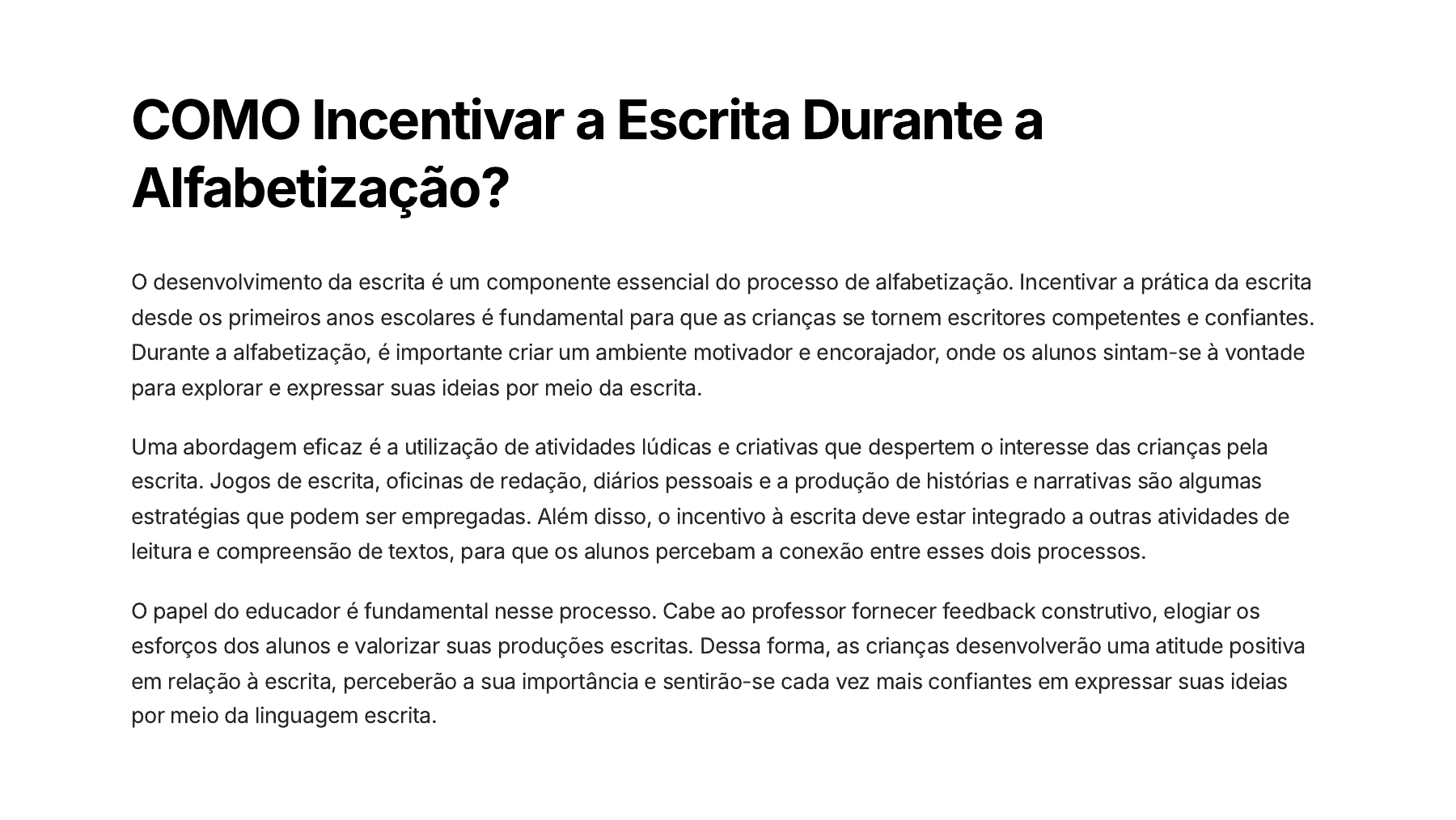 COMO Incentivar a Escrita Durante a Alfabetização? O desenvolvimento da escrita é um componente essencial do processo de alfabetização. Incentivar a prática da escrita desde os primeiros anos escolares é fundamental para que as crianças se tornem escritores competentes e confiantes. Durante a alfabetização, é importante criar um ambiente motivador e encorajador, onde os alunos sintam-se à vontade para explorar e expressar suas ideias por meio da escrita. Uma abordagem eficaz é a utilização de atividades lúdicas e criativas que despertem o interesse das crianças pela escrita. Jogos de escrita, oficinas de redação, diários pessoais e a produção de histórias e narrativas são algumas estratégias que podem ser empregadas. Além disso, o incentivo à escrita deve estar integrado a outras atividades de leitura e compreensão de textos, para que os alunos percebam a conexão entre esses dois processos. O papel do educador é fundamental nesse processo. Cabe ao professor fornecer feedback construtivo, elogiar os esforços dos alunos e valorizar suas produções escritas. Dessa forma, as crianças desenvolverão uma atitude positiva em relação à escrita, perceberão a sua importância e sentirão-se cada vez mais confiantes em expressar suas ideias por meio da linguagem escrita. Leitura em voz alta: quais benefícios e melhores práticas? A leitura em voz alta é uma ferramenta poderosa na alfabetização, pois proporciona uma série de benefícios cruciais para o desenvolvimento das habilidades de leitura e escrita das crianças. Além de estimular a atenção e a concentração, essa prática ajuda a desenvolver a consciência fonológica, o entendimento da estrutura da linguagem e a compreensão leitora. Para tirar o máximo proveito da leitura em voz alta, é importante seguir algumas melhores práticas: Expressividade e entonação: Ler com ênfase, variação de tom e ritmo ajuda a despertar o interesse e a imaginação da criança. 1. Interação e questionamentos: Fazer perguntas durante a leitura, solicitar previsões e discutir o texto estimulam a compreensão e o engajamento ativo. 2. Vocabulário e conceitos: Explicar palavras e conceitos desconhecidos amplia o repertório linguístico e favorece a construção de significados. 3. Repetição e revisão: Reler trechos ou o texto inteiro ajuda a consolidar a aprendizagem e a desenvolver a fluência leitora. 4. Diversidade de gêneros: Explorar uma variedade de livros, desde ficção até não ficção, enriquece a experiência de leitura. 5. Ao aplicar essas estratégias, a leitura em voz alta se torna uma ferramenta essencial para guiar as crianças em seu fascinante processo de alfabetização e desenvolvimento da linguagem. QUAIS AS Atividades Lúdicas para Reforçar a Alfabetização? A alfabetização é um processo fundamental no desenvolvimento da criança, e incorporar atividades lúdicas a esse processo pode ser extremamente benéfico. Essas atividades de caráter lúdico não apenas tornam a aprendizagem mais divertida e envolvente, mas também ajudam a fortalecer habilidades essenciais, como a consciência fonológica, a construção do vocabulário e a compreensão de leitura. Jogos de memória, palavras cruzadas, caça-palavras e brinquedos que estimulam a identificação de letras e sons podem ser excelentes ferramentas para reforçar a alfabetização de maneira prazerosa. Além disso, atividades que envolvem a dramatização de histórias, a criação de livros ilustrados e a produção de textos criativos ajudam a desenvolver a expressão escrita e a imaginação dos alunos. O educador desempenha um papel fundamental nesse processo, sendo responsável por selecionar e conduzir as atividades lúdicas de forma alinhada aos objetivos de aprendizagem. Através da ludicidade, a criança pode aprender de maneira mais natural, divertida e significativa, ampliando suas habilidades de leitura e escrita. Ao combinar o aprendizado formal com atividades lúdicas, as crianças se envolvem de forma mais ativa e demonstram maior entusiasmo, o que por sua vez impulsiona o desenvolvimento da alfabetização e a aquisição de conhecimentos essenciais para seu crescimento e êxito escolar.