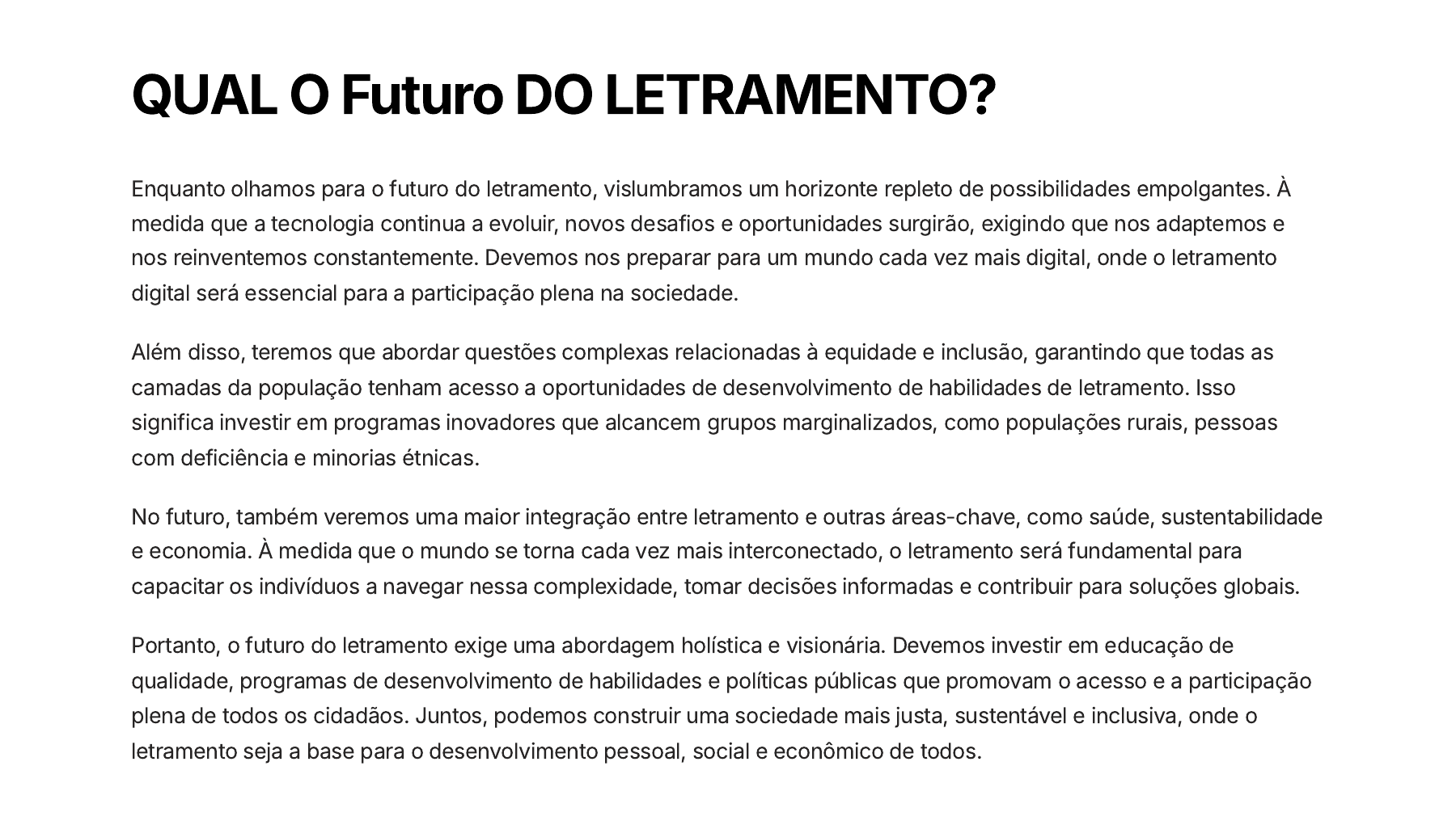 QUAL O Futuro DO LETRAMENTO? Enquanto olhamos para o futuro do letramento, vislumbramos um horizonte repleto de possibilidades empolgantes. À medida que a tecnologia continua a evoluir, novos desafios e oportunidades surgirão, exigindo que nos adaptemos e nos reinventemos constantemente. Devemos nos preparar para um mundo cada vez mais digital, onde o letramento digital será essencial para a participação plena na sociedade. Além disso, teremos que abordar questões complexas relacionadas à equidade e inclusão, garantindo que todas as camadas da população tenham acesso a oportunidades de desenvolvimento de habilidades de letramento. Isso significa investir em programas inovadores que alcancem grupos marginalizados, como populações rurais, pessoas com deficiência e minorias étnicas. No futuro, também veremos uma maior integração entre letramento e outras áreas-chave, como saúde, sustentabilidade e economia. À medida que o mundo se torna cada vez mais interconectado, o letramento será fundamental para capacitar os indivíduos a navegar nessa complexidade, tomar decisões informadas e contribuir para soluções globais. Portanto, o futuro do letramento exige uma abordagem holística e visionária. Devemos investir em educação de qualidade, programas de desenvolvimento de habilidades e políticas públicas que promovam o acesso e a participação plena de todos os cidadãos. Juntos, podemos construir uma sociedade mais justa, sustentável e inclusiva, onde o letramento seja a base para o desenvolvimento pessoal, social e econômico de todos. Pedagogia e Neurociência: como Explorar as Conexões? A compreensão dos princípios da neurociência é fundamental para aprimorar as práticas pedagógicas e promover um aprendizado mais eficaz e significativo. Nesta seção, exploraremos como as descobertas da neurociência podem informar e aprimorar os métodos de ensino, possibilitando a criação de ambientes de aprendizagem que potencializam o desenvolvimento cognitivo e emocional dos alunos. A neurociência tem desempenhado um papel crucial na elucidação dos mecanismos do cérebro e sua relação com o processo de aprendizagem. Ao compreender como o cérebro processa, armazena e recupera informações, educadores podem desenvolver estratégias de ensino que se alinham com os princípios do funcionamento neural, otimizando o engajamento, a motivação e a retenção de conhecimento por parte dos alunos. by . -*.- QUAL A Importância da Interdisciplinaridade? A integração entre a pedagogia e a neurociência é fundamental para aprimorar a compreensão do processo de aprendizagem e desenvolvimento cognitivo. Ao unir estas disciplinas, é possível criar ambientes de ensino- aprendizagem mais eficazes e adaptados às necessidades individuais dos alunos. A interdisciplinaridade permite que educadores e pesquisadores analisem os fenômenos educacionais por diferentes ângulos, combinando conhecimentos e metodologias de áreas como a psicologia, a biologia, a tecnologia e as ciências sociais. Essa abordagem holística possibilita uma visão mais ampla e profunda sobre como o cérebro processa e armazena informações, quais fatores influenciam a atenção e a motivação, e de que maneira as emoções se relacionam com a aprendizagem. Ao compreender melhor esses mecanismos, os profissionais da educação podem desenvolver estratégias pedagógicas mais assertivas, que levem em conta as diferenças individuais e os estilos de aprendizagem dos alunos. https://www.scielo.br/j/ep/a/tPmnPJCqcGkDtMzRQfhj8Rr/?lang=pt https://www.rnp.br/noticias/estilos-de-aprendizagem-como-identificar-e-trabalhar-com-eles