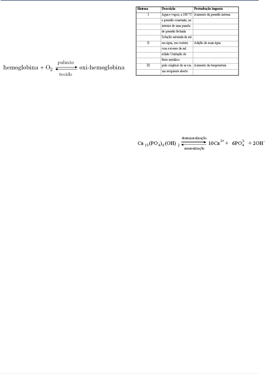 Exercícios sobre Deslocamento de Equilíbrio com Gabarito 1) (Vunesp-2001) No corpo humano, o transporte de oxigênio é feito por uma proteína chamada hemoglobina. Cada molécula de hemoglobina contém 4 átomos de ferro. O transporte de oxigênio, dos pulmões para os tecidos, envolve o equilíbrio reversível: Mesmo um atleta bem treinado tem seu rendimento físico muito diminuído quando vai competir em localidades de altitude muito mais elevada do que a que está habituado. Após cerca de duas semanas de treinamento na nova altitude, o rendimento do atleta retorna ao normal. a) Explique, em termos químicos, por que o rendimento físico inicial do atleta diminui na altitude mais elevada. b) Explique por que, após o período de adaptação, o rendimento do atleta retorna ao normal. O que ocorre com as reservas originais de ferro do organismo em conseqüência da adaptação? 2) (Mack-2006) Cientistas descobriram que águas de gêiseres, dentro do Parque Yellowstone (E.U.A.), são moradia de certos microorganismos. Essas águas, as mais quentes do mundo, são ricas em ácido sulfúrico. A descoberta permite supor a existência de vida em outros ambientes inóspitos, dentro e fora da Terra. Considere que, nas águas dos gêiseres, predomine o equilíbrio H 1+(aq.) + HSO 1 4 (aq.) H2SO4(aq.) e que, numa amostra dessa água, se tenha verificado que [H2SO4] = 0,6mol/L e [HSO 1 4 ] = 0,2mol/L. O valor da constante de equilíbrio, na temperatura em que a experiência foi feita, é K = 3,0 10 1 . Assim, o pH da água da amostra analisada é a) 1 b) 2 c) 3 d) 4 e) 6 3) (UFMG-1999) O princípio de le Chatelier permite prever os efeitos de perturbações impostas a sistemas em equilíbrio. O quadro descreve três sistemas de interesse químico, bem como perturbações impostas a eles. Assinale a alternativa que apresenta os sistemas a que o princípio de le Chatelier pode ser aplicado. A) I e III. B) I, II e III. C) I e II. D) II e III. 4) (Fuvest-1999) O esmalte dos dentes , principalmente hidroxiapatita que, sob certas condições, sofre dissolução (desmineralização), o que provoca a cárie. Provoca desmineralização bochechar com I) uma solução aquosa de hipoclorito de sódio (pH=9); II) uma solução aquosa de cloreto de sódio (soro fisiológico); III) vinagre diluído em água. Dessas afirmações, apenas: a) a I é correta. b) a II é correta. c) a III é correta. d) a I e a II são corretas. e) a II e a III são corretas. 5) (Fuvest-1999) Algumas argilas do solo têm a capacidade de trocar cátions da sua estrutura por cátions de soluções aquosas do solo. A troca iônica pode ser representada pelo equilíbrio: RNa + (s) + NH4 + (aq) RNH4 + (s) + Na + (aq) onde R representa parte de uma argila. Se o solo for regado com uma solução aquosa de um adubo contendo NH4NO3, o que ocorre com o equilíbrio acima? a) Desloca-se para o lado do do Na + (aq). b) Desloca-se para o lado do NH4 + (aq). c) O valor de sua constante aumenta. d) O valor de sua constante diminui. e) Permanece inalterado. 6) (UFSCar-2001) 31. Quando se dissolve cloreto de cobalto (II) em ácido clorídrico, HC (aq), ocorre o seguinte equilíbrio: [Co(H2O)6] 2+ (aq) + 4 C(aq) [CoC4] 2 (aq) + 6 H2O() H > 0 rosa azul À temperatura ambiente, a cor dessa solução é violeta. a) O que acontece com a cor da solução quando ela é aquecida? Justifique a resposta. b) O que acontece com a cor da solução quando se adiciona mais ácido clorídrico? Justifique a resposta. 7) (Mack-2002) (T constante) Da reação acima equacionada, pode-se afirmar que o equilíbrio: a) desloca-se no sentido 2, se a pressão aumentar. b) desloca-se no sentido 1, se a concentração do Cl2 aumentar. c) desloca-se no sentido 1, se for adicionado um catalisador. d) desloca-se no sentido 2, se a concentração de gás oxigênio diminuir. e) não se altera, se a pressão diminuir. 8) (Unicamp-2000) A ―revolução verde‖, que compreende a grande utilização de fertilizantes inorgânicos na agricultura, fez surgir a esperança de vida para uma população mundial cada vez mais crescente e, portanto, mais necessitada de alimentos. O nitrogênio é um dos principais constituintes de fertilizantes sintéticos de origem não orgânica. Pode aparecer na forma de uréia, sulfato de amônio, fosfato de amônio etc., produtos cuja produção industrial depende da amônia como reagente inicial. A produção de amônia, por sua vez, envolve a reação entre o gás nitrogênio e o gás hidrogênio. A figura a seguir mostra, aproximadamente, as porcentagens de amônia em equilíbrio com os gases nitrogênio e hidrogênio, na mistura da reação de síntese. a)A reação de síntese da amônia é um processo endotérmico? Justifique. b)Imagine que uma síntese feita à temperatura de 450ºC e pressão de 120 atm tenha produzido 50 toneladas de amônia até o equilíbrio. Se ela tivesse sido feita à temperatura de 300ºC e à pressão de 100 atm, quantas toneladas a mais de amônia seriam obtidas? Mostre os cálculos. c) Na figura, a curva não sinalizada com o valor de temperatura pode corresponder aos dados de equilíbrio para uma reação realizada a 400ºC na presença de um catalisador? Justifique. 9) (Vunesp-2001) Leia o seguinte trecho de um diálogo entre Dona Benta e seus netos, extraído de um dos memoráveis livros de Monteiro Lobato, ―Serões de Dona Benta‖: ―— ... Toda matéria ácida tem a propriedade de tornar vermelho o papel de tornassol. — ... A matéria básica não tem gosto ácido e nunca faz o papel de tornassol ficar vermelho... — E os sais? — Os sais são o produto da combinação dum ácido com uma base. ... — E de que cor os sais deixam o tornassol? — Sempre da mesma cor. Não têm nenhum efeito sobre ele. ...‖ a) Explique como o papel de tornassol fica vermelho em meio ácido, sabendo que o equilíbrio para o indicador impregnado no papel pode ser representado como: b) Identifique uma parte do diálogo em q
