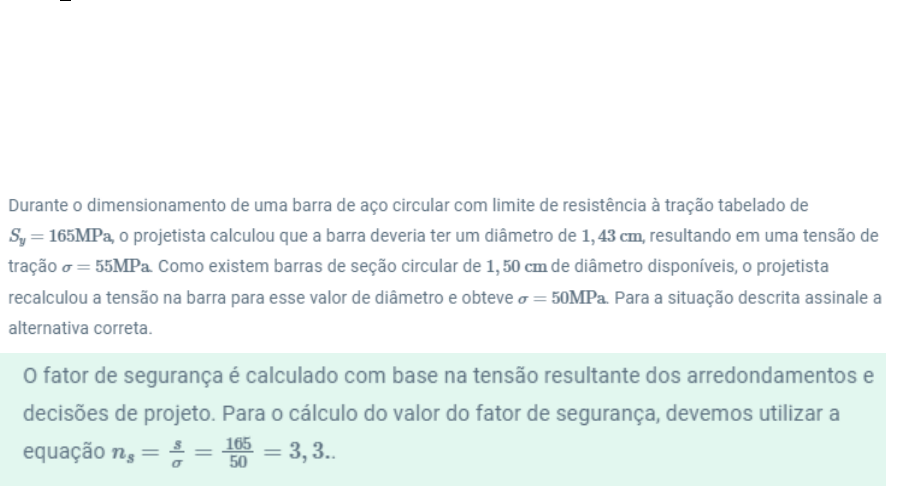 E o que é o fator de segurança? O fator de segurança, por outro lado, é calculado com base nas condições reais de operação do sistema. Após o sistema estar em funcionamento e conhecermos, por meio de precisão, as partes que atuam em cada parte, fazemos um cálculo inverso. Verificamos qual é a "distância" entre a tensão atuante em uma peça e o limite admissível de tensão para o material, a fim de verificar a segurança do projeto em relação a um modo específico de falha. Esse fator, relacionado às condições reais de uso do sistema mecânico, é o fator de segurança. Portanto, o fator de projeto é utilizado para compensar incertezas e simplificações exigidas durante a fase de concepção do projeto, enquanto o fator de segurança é calculado com base nas condições reais de operação, após o sistema estar em funcionamento. Uma observação importante é que o fator de projeto também está associado ao custo final do projeto. Se optarmos por um fator de projeto muito elevado, aumentaremos desnecessariamente o custo do projeto. Esse termo descreve a capacidade estrutural de um sistema além das cargas esperadas ou cargas reais. Basicamente, de maneira simples, pode ser entendido como o quão mais forte o sistema é do que precisaria ser para o nível de carregamento a que será submetido nas condições de operação. O fator de segurança (ns) é calculado pela expressão a seguir: 𝑛𝑠 = 𝑆 𝜎 Onde: S é a propriedade do material; σ é a tensão no material oriunda das condições de carregamento do sistema. E o que é o fator de segurança?