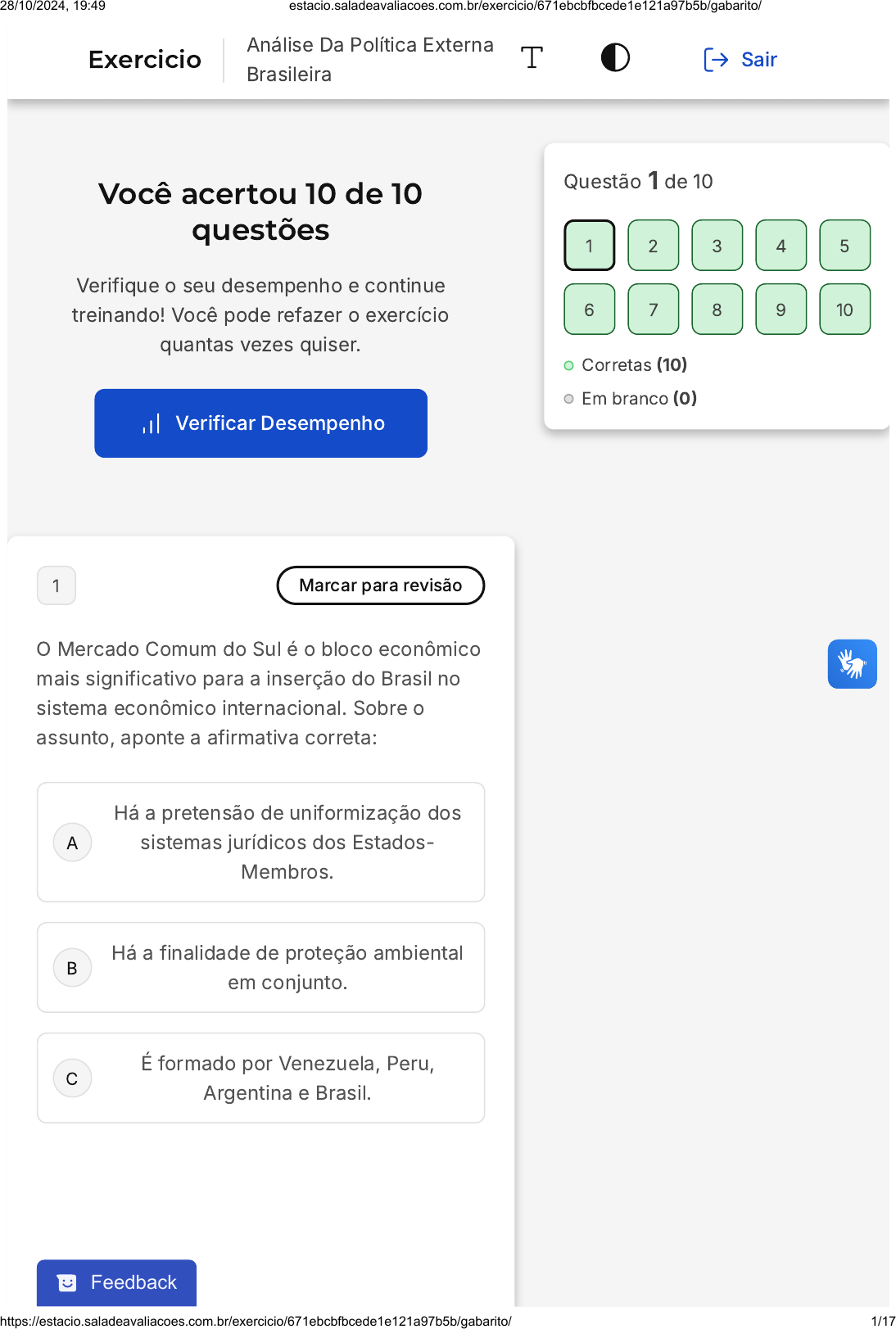 Você acertou 10 de 10 questões Verifique o seu desempenho e continue treinando! Você pode refazer o exercício quantas vezes quiser. Verificar Desempenho A B C 1 Marcar para revisão O Mercado Comum do Sul é o bloco econômico mais significativo para a inserção do Brasil no sistema econômico internacional. Sobre o assunto, aponte a afirmativa correta: Há a pretensão de uniformização dos sistemas jurídicos dos Estados- Membros. Há a finalidade de proteção ambiental em conjunto. É formado por Venezuela, Peru, Argentina e Brasil. Questão 1 de 10 Corretas �10� Em branco �0� 1 2 3 4 5 6 7 8 9 10 Exercicio Análise Da Política Externa Brasileira Sair Feedback 28/10/2024, 19:49 estacio.saladeavaliacoes.com.br/exercicio/671ebcbfbcede1e121a97b5b/gabarito/ https://estacio.saladeavaliacoes.com.br/exercicio/671ebcbfbcede1e121a97b5b/gabarito/ 1/17 D E Foi formado a partir do Tratado de Assunção de 1991. Sua maior área de atuação é na América do Norte, juntamente com o Canadá. Resposta correta Parabéns, você selecionou a alternativa correta. Confira o gabarito comentado! Gabarito Comentado O Mercado Comum do Sul, conhecido como MERCOSUL, é uma importante iniciativa de integração regional na América Latina, com mais de vinte anos de existência. Sua criação está ligada aos processos de redemocratização que ocorreram nos países da região a partir da década de 1980. Os membros fundadores do MERCOSUL, que participaram do Tratado de Assunção de 1991, são Brasil, Argentina, Uruguai e Paraguai. Este bloco tem sua atuação focada principalmente na América do Sul. Portanto, a alternativa correta é a D, que afirma que o MERCOSUL foi formado a partir do Tratado de Assunção de 1991. 2 Marcar para revisão Analise as afirmativas abaixo sobre o impacto da eleição de governos conservadores na agenda do MERCOSUL� 28/10/2024, 19:49 estacio.saladeavaliacoes.com.br/exercicio/671ebcbfbcede1e121a97b5b/gabarito/ https://estacio.saladeavaliacoes.com.br/exercicio/671ebcbfbcede1e121a97b5b/gabarito/ 2/17 A B C D E I � Quando os governos da região tinham uma perspectiva à esquerda, utilizavam cada vez mais o Bloco sul-americano como órgão político, e a integração econômica ficava em segundo plano. II � Atualmente, a maioria do Bloco quer que a abertura econômica volte a ser o centro das atenções. III � A integração intrabloco e também a composição de acordos econômicos fora do Mercado Comum do Sul permanecem em andamento. Estão corretas as afirmativas: I, II e III Apenas I e II Apenas I e III Apenas II e III Apenas a alternativa I Resposta correta Parabéns, você selecionou a alternativa correta. Confira o gabarito comentado! Gabarito Comentado Todas as afirmativas estão corretas. A afirmativa I indica que, quando os governos da região tinham uma perspectiva à esquerda, o Bloco sul-americano era mais utilizado como órgão político, deixando a integração econômica em segundo plano. 28/10/2024, 19:49 estacio.saladeavaliacoes.com.br/exercicio/671ebcbfbcede1e121a97b5b/gabarito/ https://estacio.saladeavaliacoes.com.br/exercicio/671ebcbfbcede1e121a97b5b/gabarito/ 3/17 A afirmativa II mostra que, atualmente, a maioria do Bloco deseja que a abertura econômica volte a ser o centro das atenções. Por fim, a afirmativa III destaca que a integração intrabloco e a composição de acordos econômicos fora do Mercado Comum do Sul continuam em andamento. Portanto, as afirmativas I, II e III estão corretas. 3 Marcar para revisão Leia as afirmativas abaixo: Afirmativa I A política externa brasileira articulou de forma estratégica os mecanismos institucionais do MERCOSUL em favor de sua preponderância regional, da bacia do Prata em direção ao norte da América do Sul. Afirmativa II Posteriormente, por meio da CELAC e de outros mecanismos internacionais, o Brasil se projeta como um interlocutor regional e potência comercial equidistante à China e aos Estados Unidos. Devemos compreender que esta estratégia esteve em seu auge na década de 2000�2010 e enfrentou uma série de resistências internacionais. Os governos posteriores parecem ter deixado de dedicar relevância a esse interesse. A relação correta entre elas é: 28/10/2024, 19:49 estacio.saladeavaliacoes.com.br/exercicio/671ebcbfbcede1e121a97b5b/gabarito/ https://estacio.saladeavaliacoes.com.br/exercicio/671ebcbfbcede1e121a97b5b/gabarito/ 4/17 A B C D E As duas afirmativas estão corretas e se complementam. As duas afirmativas apontam caminhos diversos e antagônicos para o tema em debate. As duas afirmativas são contraditórias. A alternativa I responde a questão e a afirmativa II está equivocada. A alternativa I está equivocada e a afirmativa II responde a questão. Resposta correta Parabéns, você selecionou a alternativa correta. Confira o gabarito comentado! Gabarito Comentado As duas afirmativas estão corretas e se complementam. A primeira afirmativa destaca a estratégia da política externa brasileira de utilizar os mecanismos institucionais do MERCOSUL para fortalecer sua preponderância regional. A segunda afirmativa complementa a primeira ao explicar que, posteriormente, o Brasil se projetou como um interlocutor regional e potência comercial equidistante à China e aos Estados Unidos, por meio da CELAC e de outros mecanismos internacionais. No entanto, essa estratégia enfrentou resistências internacionais e 28/10/2024, 19:49 estacio.saladeavaliacoes.com.br/exercicio/671ebcbfbcede1e121a97b5b/gabarito/ https://estacio.saladeavaliacoes.com.br/exercicio/671ebcbfbcede1e121a97b5b/gabarito/ 5/17 A B C parece ter perdido relevância em governos posteriores. 4 Marcar para revisão Analise as afirmativas abaixo sobre o papel do Itamaraty, como burocracia, na política externa recente do Brasil: I � O corpo diplomático brasileiro é dotado por funcionários capacitados para o serviço consular e de Estado no exterior. II � A tradição do Itamaraty é privilegiar o est