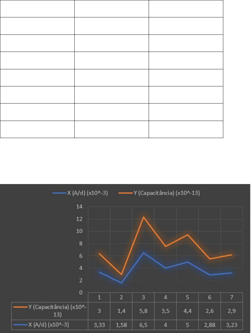 Eletricidade e Magnetismo - Trabalho extra. Cinthia Silva da Costa Sousa -Com a bateria desligada (Marca de 0 volt), fixe um valor para a distância entre as placas do capacitor e varie continuamente a área das placas e preencha a tabela abaixo. Capacitância (F) Área Das Placas (m2) A/d (m) 3,0x10^-13 0,0002 3,33x10^-3 1,4×10^-13 0,00012 1,58x10^-3 5,8×10^-13 0,00026 6,5x10^-3 3,5×10^-13 0,0004 4x10^-3 4,4×10^-13 0,0001 5x10^-3 2,6×10^-13 0,00015 2,88x10^-3 2,9×10^-13 0,00022 3,23x10^-3 -Faça um gráfico colocando a capacitância no eixo vertical e o valor A/d no eixo horizontal. -A partir do conjunto de pontos, obtenha o coeficiente angular da curva encontrada. - O valor encontrado se aproxima de 𝜀0? Encontre o erro na sua medida. Ao convertemos para a unidade correta, o valor se aproximou ao valor de 𝜀0 que é 8,85x10^-12 aproximadamente. Observação do potencial e do Campo elétrico entre as placas do capacitor. - Com o circuito fechado, escolha um valor de potencial na bateria e carregue o capacitor. Você perceberá que aparecerão cargas nas placas. - Deixe a área das placas fixa e varie continuamente a distância entre elas. Preencha a tabela abaixo. Tensão ou ddp (Volts) Distância (m) O.750 3,4x10^-3 0.441 2,0x10^-3 0.794 3,6x10^-3 1368 6,2x10^-3 1765 8,0x10^-3 2029 9,2x10^-3 2206 10,0x10^-3 1103 5,0x10^-3 1412 6,4x10^-3 -Faça um gráfico colocando a ddp no eixo vertical e a distância entre as placas no eixo horizontal e encontre o coeficiente angular da curva encontrada. O que esse coeficiente significa? Coeficiente angular = 220,5288 O coeficiente determina a inclinação de uma reta, portanto quanto maior o seu valor, maior a inclinação. A partir dos valores encontrados, podemos concluir que a distancia entre as duas linhas são grandes ou não