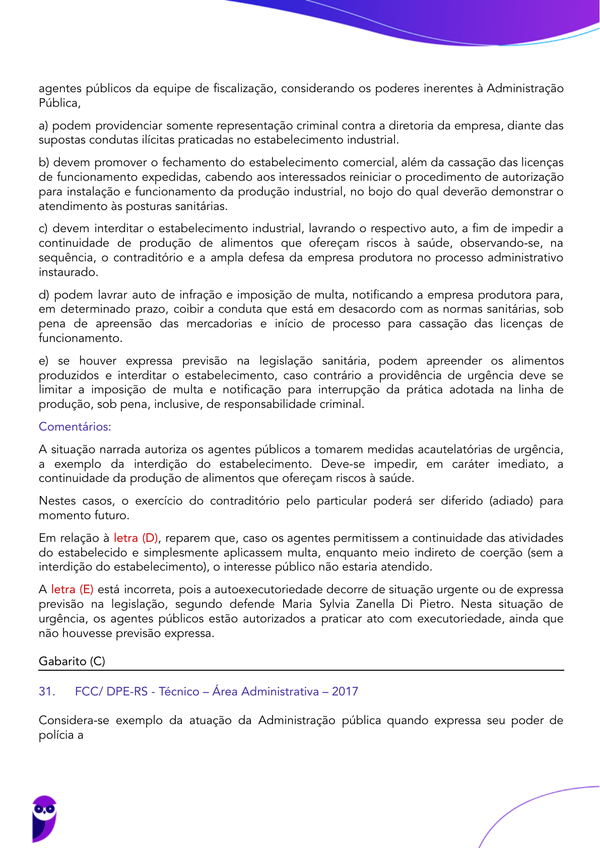 agentes públicos da equipe de fiscalização, considerando os poderes inerentes à Administração Pública, a) podem providenciar somente representação criminal contra a diretoria da empresa, diante das supostas condutas ilícitas praticadas no estabelecimento industrial. b) devem promover o fechamento do estabelecimento comercial, além da cassação das licenças de funcionamento expedidas, cabendo aos interessados reiniciar o procedimento de autorização para instalação e funcionamento da produção industrial, no bojo do qual deverão demonstrar o atendimento às posturas sanitárias. c) devem interditar o estabelecimento industrial, lavrando o respectivo auto, a fim de impedir a continuidade de produção de alimentos que ofereçam riscos à saúde, observando-se, na sequência, o contraditório e a ampla defesa da empresa produtora no processo administrativo instaurado. d) podem lavrar auto de infração e imposição de multa, notificando a empresa produtora para, em determinado prazo, coibir a conduta que está em desacordo com as normas sanitárias, sob pena de apreensão das mercadorias e início de processo para cassação das licenças de funcionamento. e) se houver expressa previsão na legislação sanitária, podem apreender os alimentos produzidos e interditar o estabelecimento, caso contrário a providência de urgência deve se limitar a imposição de multa e notificação para interrupção da prática adotada na linha de produção, sob pena, inclusive, de responsabilidade criminal. Comentários: A situação narrada autoriza os agentes públicos a tomarem medidas acautelatórias de urgência, a exemplo da interdição do estabelecimento. Deve-se impedir, em caráter imediato, a continuidade da produção de alimentos que ofereçam riscos à saúde. Nestes casos, o exercício do contraditório pelo particular poderá ser diferido (adiado) para momento futuro. Em relação à letra (D), reparem que, caso os agentes permitissem a continuidade das atividades do estabelecido e simplesmente aplicassem multa, enquanto meio indireto de coerção (sem a interdição do estabelecimento), o interesse público não estaria atendido. A letra (E) está incorreta, pois a autoexecutoriedade decorre de situação urgente ou de expressa previsão na legislação, segundo defende Maria Sylvia Zanella Di Pietro. Nesta situação de urgência, os agentes públicos estão autorizados a praticar ato com executoriedade, ainda que não houvesse previsão expressa. Gabarito (C) 31. FCC/ DPE-RS - Técnico – Área Administrativa – 2017 Considera-se exemplo da atuação da Administração pública quando expressa seu poder de polícia a Antonio Daud, Equipe Antonio Daud, Equipe Antonio Daud 2 Aula 01 - Questões Comentadas Questões Comentadas de Direito Administrativo (FGV, FCC e CEBRASPE) Em PDF - Cartão 12x! www.estrategiaconcursos.com.br 37089970000 - José Roberto 49 464