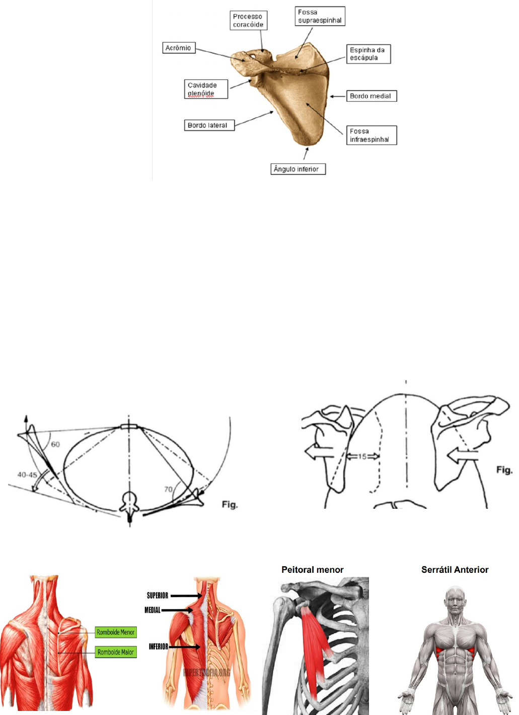 Cinesiologia e Biomecânica Unidade IV · ESCÁPULA: É um osso par, chato, fino, com formato triangular; forma a parte dorsal da Cintura escapular. É um dos dois ossos que compõem o ombro. · Situado na região costal do ombro, na altura entre as segundas e sétima costelas, articula-se com dois outros ossos: o úmero e a clavícula, articulando-se ao tronco através desta última. Tem grande importância para movimentação dos braços, em razão da musculatura que ela se prende. · A cintura escapular liga o esqueleto apendicular superior (membros superiores) ao esqueleto axial (tronco). Sua principal função é aumentar a amplitude dos movimentos dos membros superiores, de maneira que se ela não existisse, ou seja, os úmeros fosses ligados diretamente ao tronco, nossos movimentos seriam consideravelmente menos amplos. · PLANO TRANSVERSAL Anteposição (Abdução): A cintura escapular desloca-se para fora e para frente. Retroposição (adução): A cintura escapular dirige-se para trás e para dentro. · PLANO TRANSVERSAL Anteposição (Abdução) - PLANO TRANSVERSAL Abdução e Adução e Retroposição (Adução) · Retroposição (Adução): músculos *Anteposição (Abdução): músculos Peitoral menor e Serrátil Anterior Trapézio e Rombóides · PLANO FRONTAL Elevação: A cintura escapular desloca-se para cima. · Depressão: A cintura escapular dirige-se para baixo. PLANO FRONTAL Elevação e Depressão Elevação: músculos Trapézio descendente / levantador da escápula · Depressão: músculos Peitoral Menor e Trapézio Ascendente · PLANO FRONTAL · Báscula lateral (rotação superior): Rotação da escápula para cima, ao redor do eixo perpendicular ao seu plano, localizado próximo a espinha da escápula. · Báscula medial (rotação inferior): Movimento inverso. Rotação da escápula para baixo. PLANO FRONTAL Báscula lateral Báscula lateral: músculos e Báscula medial Serrátil anterior e Trapézio Transverso Báscula Medial: músculos Peitoral Menor Movimentos da cintura escapular que acompanham e Rombóides os movimentos da articulação glenoumeral · Movimentos da cintura escapular que acompanham os movimentos da articulação glenoumeral. 1- FLEXÃO DO BRAÇO: Báscula lateral da escápula, acompanhada por elevação e um movimento discreto de abdução. 2- EXTENSÃO DO BRAÇO: Báscula medial, acompanhada por depressão e um movimento discreto de adução da cintura escapular. 3- ABDUÇÃO DO BRAÇO: Báscula lateral, acompanhada por elevação. 4- ADUÇÃO DO BRAÇO: Báscula medial, acompanhada por depressão e um movimento mais discreto de adução. 5- ROTAÇÃO LATERAL DO BRAÇO: Adução da escápula. 6- ROTAÇÃO MEDIAL DO BRAÇO: Abdução da escápula. 7- ABDUÇÃO HORIZONTAL: Adução da escápula. 8- ADUÇÃO HORIZONTAL: Abdução da escápula. ESCÁPULA: MOVIMENTOS ACESSAR O VÍDEO: https://www.youtube.com/watch?v =APOEkqViCOg image5.png image6.png image7.png image8.png image9.png image10.png image11.png image12.png image1.png image2.png image3.png image4.png
