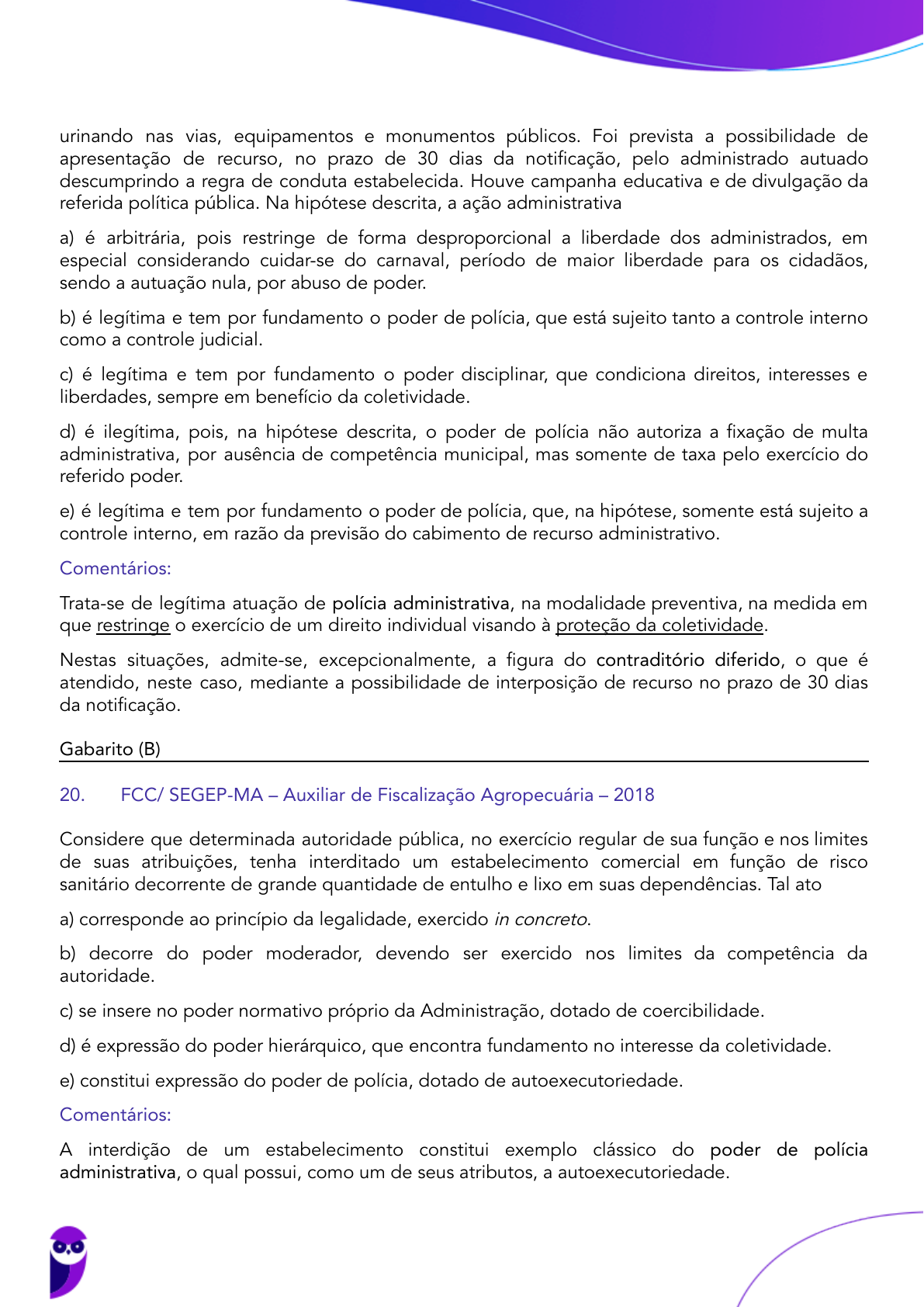 urinando nas vias, equipamentos e monumentos públicos. Foi prevista a possibilidade de apresentação de recurso, no prazo de 30 dias da notificação, pelo administrado autuado descumprindo a regra de conduta estabelecida. Houve campanha educativa e de divulgação da referida política pública. Na hipótese descrita, a ação administrativa a) é arbitrária, pois restringe de forma desproporcional a liberdade dos administrados, em especial considerando cuidar-se do carnaval, período de maior liberdade para os cidadãos, sendo a autuação nula, por abuso de poder. b) é legítima e tem por fundamento o poder de polícia, que está sujeito tanto a controle interno como a controle judicial. c) é legítima e tem por fundamento o poder disciplinar, que condiciona direitos, interesses e liberdades, sempre em benefício da coletividade. d) é ilegítima, pois, na hipótese descrita, o poder de polícia não autoriza a fixação de multa administrativa, por ausência de competência municipal, mas somente de taxa pelo exercício do referido poder. e) é legítima e tem por fundamento o poder de polícia, que, na hipótese, somente está sujeito a controle interno, em razão da previsão do cabimento de recurso administrativo. Comentários: Trata-se de legítima atuação de polícia administrativa, na modalidade preventiva, na medida em que restringe o exercício de um direito individual visando à proteção da coletividade. Nestas situações, admite-se, excepcionalmente, a figura do contraditório diferido, o que é atendido, neste caso, mediante a possibilidade de interposição de recurso no prazo de 30 dias da notificação. Gabarito (B) 20. FCC/ SEGEP-MA – Auxiliar de Fiscalização Agropecuária – 2018 Considere que determinada autoridade pública, no exercício regular de sua função e nos limites de suas atribuições, tenha interditado um estabelecimento comercial em função de risco sanitário decorrente de grande quantidade de entulho e lixo em suas dependências. Tal ato a) corresponde ao princípio da legalidade, exercido in concreto. b) decorre do poder moderador, devendo ser exercido nos limites da competência da autoridade. c) se insere no poder normativo próprio da Administração, dotado de coercibilidade. d) é expressão do poder hierárquico, que encontra fundamento no interesse da coletividade. e) constitui expressão do poder de polícia, dotado de autoexecutoriedade. Comentários: A interdição de um estabelecimento constitui exemplo clássico do poder de polícia administrativa, o qual possui, como um de seus atributos, a autoexecutoriedade. Antonio Daud, Equipe Antonio Daud, Equipe Antonio Daud 2 Aula 01 - Questões Comentadas Questões Comentadas de Direito Administrativo (FGV, FCC e CEBRASPE) Em PDF - Cartão 12x! www.estrategiaconcursos.com.br 37089970000 - José Roberto 40 464