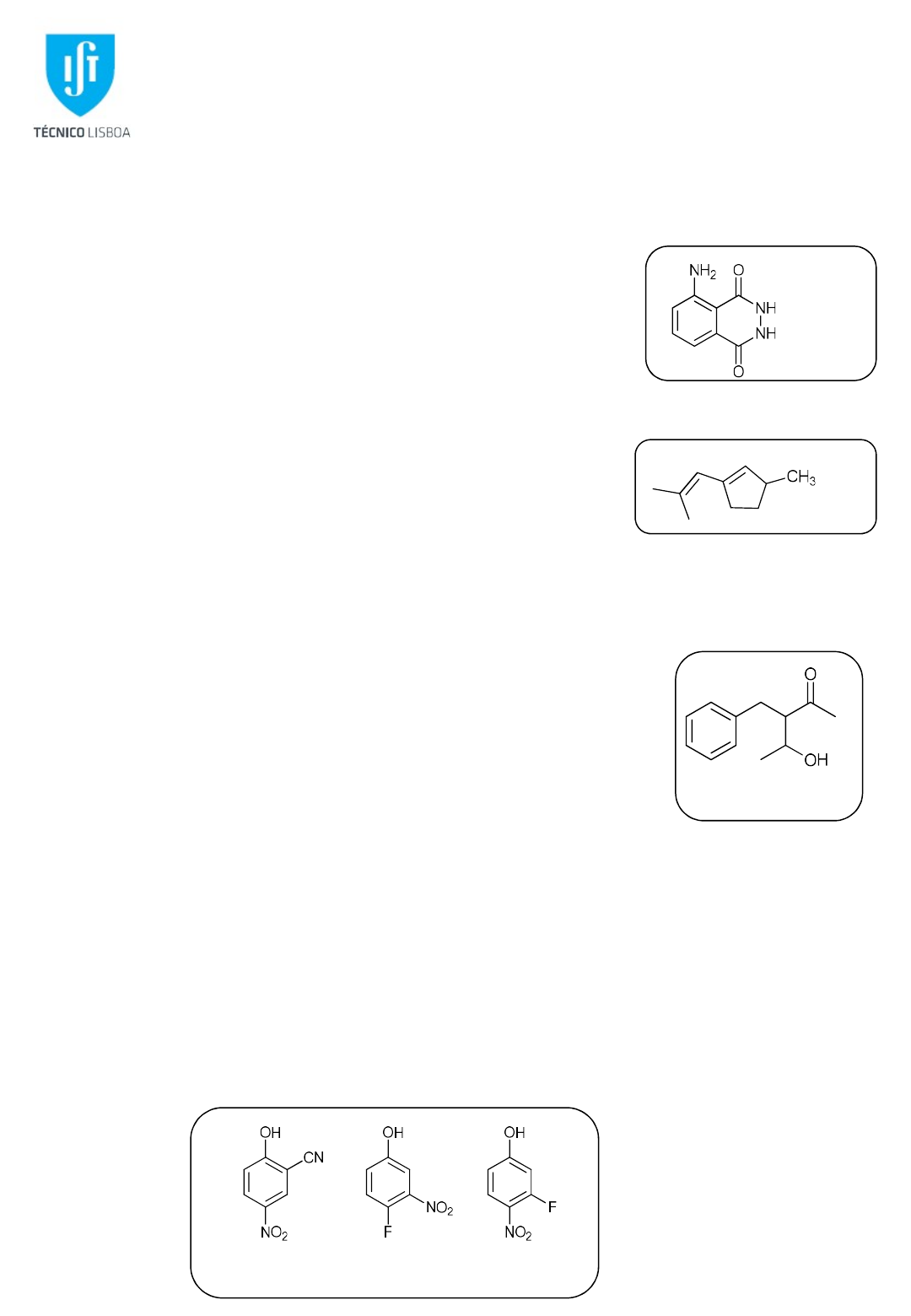 Mestrado integrado em Engenharia Biomédica 1º Teste de Química Orgânica 27/04/2015 Duração – 2 horas A 1 – Escreva os contributores mais importantes do luminol (A), composto quimiluminescente utilizado na deteção de vestígios de sangue, indicando o “movimento electrónico” com o uso de setas. 2 – a) Escreva a fórmula em perspectiva (com cunhas e tracejado) do isómero R do composto B. b) Classifique a ligação dupla do anel como E ou Z. B C (2,0) (1,5) (0,5) (1,0) (1,5) (1,0) (1,0) (1,0) (0,5) 4 – a) Ordene os seguintes compostos D, E, F segundo acidez decrescente. Justifique, mostrando a base conjugada. FD E e) Desenhe uma projecção de Newman alternada e uma de cavalete alternada para um dos estereoisómeros à sua escolha (indique qual escolheu). 3 – a) Identifique os centros de quiralidade de C e indique o número máximo de estereoisómeros possível. b) Escreva em projecção de Fischer os diferentes estereoisómeros de C. c) Atribua uma designação R/S a cada um dos centros de quiralidade. d) Indique as relações de estereoisomeria entre os diferentes estereoisómeros. J 5 - Preveja os produtos das seguintes reacções indicando o nome da reacção, mecanismo e a estereoquímica quando aplicável: a) b) c) 6 - Desenhe as duas conformações em cadeira para o composto J e diga qual é a mais estável. Justifique e indique se os substituintes se encontram em posição equatorial ou axial. (1,5) (1,5) (1,5) (1,5) CH2CH3 H H H OTs (CH3)3CONa b) Ordene os seguintes compostos G, H, I, segundo basicidade decrescente. Justifique. IG H (2,0) NaI F OSO2CH3 H2SO4 OH d)(1,5) e) Indique qual ou quais dos produtos obtidos nas alíneas anteriores são oticamente ativos. Justifique. (0,5)