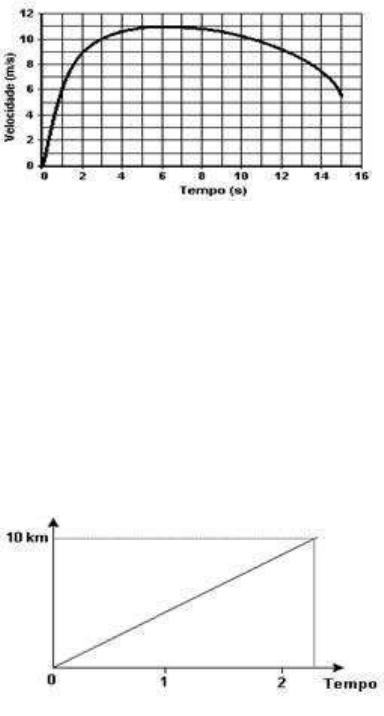 Questões sobre movimento uniforme 1 – (ENEM) em uma prova de 100 metros rasos, o desempenho típico de um corredor padrão é representado pelo gráfico a seguir: Baseado no gráfico, em que intervalo de tempo a Velocidade do corredor é aproximadamente constante? a) Entre 0 e 1 segundo b) Entre 1 e 5 segundos c) Entre 5 e 8 segundos d) Entre 8 e 11 segundos e) Entre 12 e 15 segundos. 2 –(ENEM - 2008) O gráfico a seguir modela a distância percorrida, em km, por uma pessoa em certo período de tempo. A escala de tempo a ser adotada para o eixo das abscissas depende da maneira que essa pessoa se desloca. Qual é a opção que representa melhor associação entre meio ou forma de locomoção e unidade de tempo, quando são percorridos 10 km? a) carroça – semana b) carro – dia c) caminhada – hora d) bicicleta–minuto e) avião – segundo 3 - (UFRN) A cidade de João Câmara, a 80 km de Natal, no Rio Grande do Norte (RN), tem sido o epicentro (ponto da superfície terrestre atingido em primeiro lugar e com mais intensidade pelas ondas sísmicas) de alguns terremotos ocorridos nesse estado. O Departamento de Física da UFRN tem um grupo de pesquisadores que trabalham na área de sismologia utilizando um sismógrafo instalado nas suas dependências, para detecção de terremotos. Num terremoto, em geral, duas ondas, denominadas de primária (P) e secundária (S), percorrem o interior da Terra com velocidades diferentes. Admita que as informações contidas no gráfico abaixo sejam referentes a um dos terremotos ocorridos no RN. Considere ainda que a origem dos eixos da figura seja coincidente com a posição da cidade de João Câmara. Dados referentes às ondas P e S, associados a um terremoto ocorrido no Rio Grande do Norte. Diante das informações contidas no gráfico, é correto afirmar que a onda mais rápida e a diferença de tempo de chegada das ondas P e S no sismógrafo da UFRN, em Natal, correspondem, respectivamente: a) à onda S e 4 segundos b) à onda P e 8 segundos c) à onda P e 16 segundos d) à onda S e 24 segundos 4 – (a) Um carro movimenta-se em uma estrada plana e reta e o seu velocímetro está indicando sempre 70 km/h. Como você denomina esse movimento? R.:______________________________________________ (b) Um carro está sendo testado em uma pista circular e seu velocímetro indica sempre 100 km/h. Como você denomina este movimento? R.:______________________________________________ 5 – Um automóvel, que estava parado em um sinal luminoso, arranca e, após alguns segundos, seu velocímetro passa a indicar 50km/h. Mantém esta indicação durante 10 segundos e, após este tempo, a velocidade do carro diminui até parar, no sinal seguinte. (a) Entre os dois sinais, o carro desenvolveu um movimento uniforme? Explique (b) Em qual trecho do percurso o carro desenvolveu movimento uniforme? 6 – O Brasil pode se transformar no primeiro país das Américas a entrar no seleto grupo das nações que dispõem de trens-bala. O Ministério dos Transportes prevê o lançamento do edital de licitação internacional para a construção da ferrovia de alta velocidade Rio-São Paulo. A viagem ligará os 403 quilômetros entre a Central do Brasil, no Rio, e a Estação da Luz, no centro da capital paulista, em uma hora e 25 minutos. (Disponível em: http://oglobo.globo.com.Acesso em: 14 jul. 2009.) Suponha que o nordeste também fosse contemplado com trens de alta velocidade, e que um trem bala, em movimento uniforme, partindo de Natal, gaste 4 h para percorrer a distância de aproximadamente 1000 km para chegar à cidade de Salvador, na Bahia. Qual a velocidade deste trem? R.:______________________ (a) Qual é a distancia que o trem percorre em 0,5 h? R.:______________________ (b) Quanto tempo ele gastará, mantendo aquela velocidade, para ir de Natal à cidade do Rio de Janeiro percorrendo uma distância aproximada de 2580 km? R.:______________________ 7. Numa competição aquática, um nadador, ao disputar uma prova de 100 metros nado livre, consegue o tempo de 50 s. Supondo que o nadador tenha mantido sua velocidade constante: a) Qual é em m/s, o valor desta velocidade? R.:______________________ b) Que distancia o nadador percorreria, mantendo esta velocidade, durante 2min 40s? 8. Um atleta disputando a corrida de 100 m rasos obtém a marca de 10 s. A velocidade que ele desenvolveu é maior, menor ou igual à de um carro a 40 km/h? (suponha que o atleta tenha mantido um movimento uniforme) R.:______________________ 9. Desenvolvendo sua velocidade normal para viagens internacional (800 km/h), um avião de passageiros, a jato, mantém, durante certo tempo, movimento uniforme. a) Este avião é supersônico, ou seja, é mais rápido que o som?(Consulte a tabela 2-1 para obter a velocidade do som.) b) Quanto tempo este avião gasta para atravessar uma nuvem de 1500 m de comprimento? 10. Uma moto de 400kg está se deslocando em uma estrada, com movimento retilíneo uniforme (a = 0 m/s2). Observou-se que ele gasta um tempo t= 2h para percorrer uma distância d=180 km. a) Qual o valor da força resultante que age na moto? b) Qual é o valor da velocidade da moto? c) Qual é a distância que a moto percorre em um tempo t= 5h? d) Mantendo seu movimento uniforme, em quanto tempo essa motocicleta atravessará um túnel de 500m? 11. Ao sair da escola Felipe Guerra um estudante dirigiu-se a Av. Hermes da Fonseca. Ele observou que gastou um tempo de 2min. Curioso, visitou o site Google mapas e verificou que a distância entre a escola e a Av. Hermes da Fonseca é, aproximadamente, 700m. Ele se questionou: qual foi minha velocidade média nesse percurso? Você poderia responder para ele?