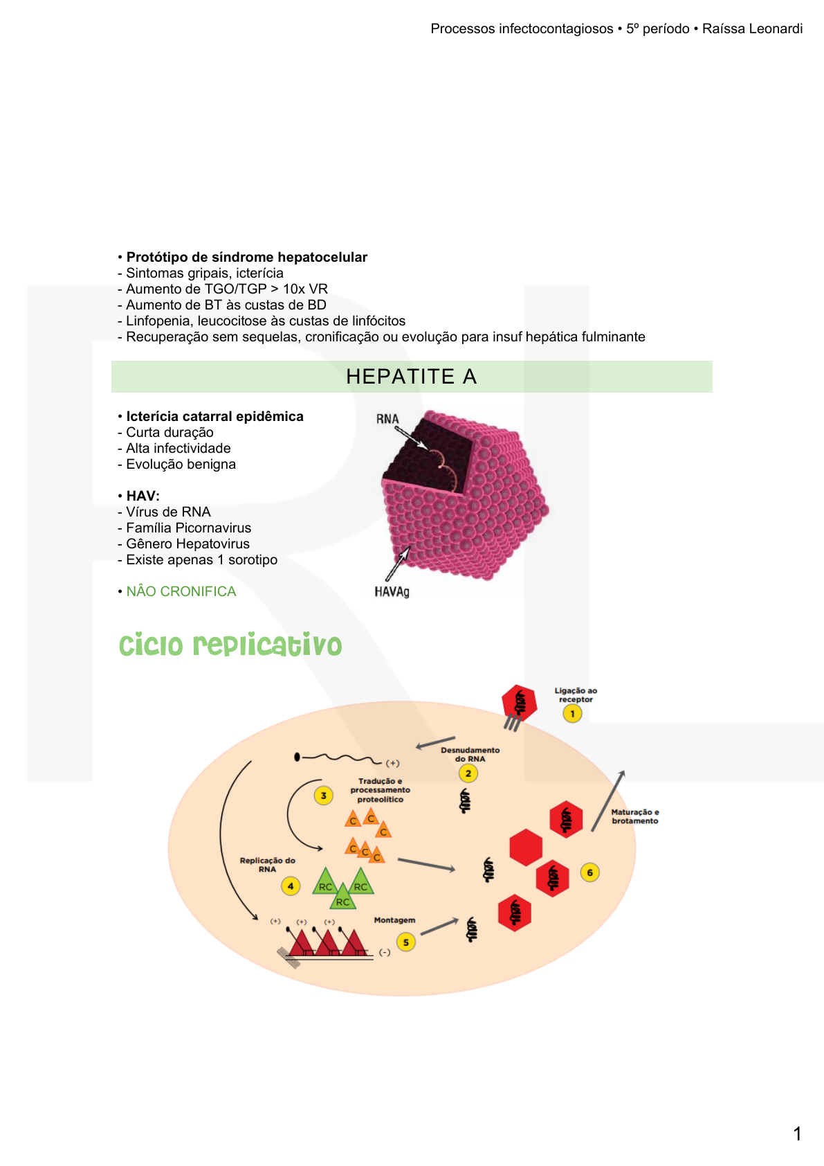 SEMANA 2 Objetivos: 1 – Estudar as hepatites virais quanto: epidemio, etiologia, transmissão, fisiopato, QC, dg (algoritmo), tto e prognóstico. • Protótipo de síndrome hepatocelular - Sintomas gripais, icterícia - Aumento de TGO/TGP > 10x VR - Aumento de BT às custas de BD - Linfopenia, leucocitose às custas de linfócitos - Recuperação sem sequelas, cronificação ou evolução para insuf hepática fulminante HEPATITE A • Icterícia catarral epidêmica - Curta duração - Alta infectividade - Evolução benigna • HAV: - Vírus de RNA - Família Picornavirus - Gênero Hepatovirus - Existe apenas 1 sorotipo • NÂO CRONIFICA Ciclo replicativo • HAV sintetiza uma cópia de RNA complementar de polaridade negativa (intermediário replicativo) = molde para a síntese de novas fitas de polaridade positiva 1 Processos infectocontagiosos • 5º período • Raíssa Leonardi • A síntese das fitas positivas ocorre dentro do retículo endoplasmático liso e é auxiliada pelas proteínas não estruturais recém formadas. • Essas novas moléculas de RNA positivas podem ser traduzidas para a síntese de novas proteínas virais, servir de molde para a síntese de outras proteínas virais ou, ainda, ser empacotadas para a formação de novas partículas virais • A última etapa do ciclo replicativo consiste na montagem da partícula viral - As três proteínas do capsídeo, VP1, VP2 e VP3, são montadas em uma estrutura icosaédrica, contendo 60 cópias de cada proteína Epidemiologia • Grupo mais acometido: cças 40 anos, saudáveis: recebem vacina, devendo-se considerar acréscimo de imunoglobulina de acordo com avaliação de risco individual • ≥ 12 meses com imunodepressão ou hepatopatia crônica: vacina + imunoglobulina * A imunoglobulina humana convencional é obtida a partir de um pool de múltiplas doações de sangue. HEPATITE B • Transmissão: - Vertical (não era testado antes de 2003) - Horizontal - Sexual → principal forma de transmissão - Percutânea - Hemotransfusão até 1993 - Transplante de órgãos - Procedimentos como manicures, tatuagens e piercings • Incubação: 30-180 dias • Pode fazer ca mesmo sem cirrose 4 Processos infectocontagiosos • 5º período • Raíssa Leonardi Epidemiologia • 2 bilhões de pessoas tem ctto com HBV - 240 milhões tem hep B crônica - A infecção crônica pode evoluir para cirrose e CHC (alta morbimortalidade) • Alto risco: - Profissionais do sexo, pessoas que usam drogas, pessoas privadas de liberdade e pessoas em situação de rua (essas populações também estão expostas a outros agravos e barreiras que prejudicam os resultados de estratégias de prevenção, diagnóstico, assistência e vigilância) - Elevação de transaminases ou hepatopatia sem causa clara - Comorbidades clássicas: DM tipo 2, cirurgias e álcool - Infecção pelo HIV - HSH com práticas sexuais de risco Virus • DNA pertencente à família Hepadnaviridae - Fita dupla incompleta (uma maior que a outra) - Replicação por transcriptase reversa • Envoltório lipoproteico e núcleo central denso - Antígeno de superfície: HbsAg – marcador de presença do HBV no corpo, estando ativo ou não - Antígeno do núcleo: HBcAg - Antígeno secretado na corrente sanguínea pelos hepatócitos infectados: HBeAg – somente na vigência de elevadas taxas de replicação viral - Antígeno que estimula a transcrição de genes virais e celulares: HBxAg - Anticorpo de superfície: anti-HBs • Anti-HBe:baixa replicação • Possui tropismo pela cél hepática • O HBV permanece viável durante longo período quando fora do corpo - Maior chance de infectar um pcte suscetível • Pode causar hepatite aguda ou crônica - Ambas formas oligossintomática (pouco sintoma ou nenhum sintoma característico) • Definidor de hep B aguda: Anti-HBc IgM - Pcte negativo para HbsAg e positivo para IgM está em janela imunológica • Raramente causam icterícia • Acompanhamento: marcadores séricos - Imunidade: anti-HBs - Presença do antígeno de superfície: HbsAg - Quantificação do vírus na corrente sanguínea: carga viral/HBV-DNA * Aparecimento do anti-HBs e desaparecimento do HbsAg = resolução da infecção. 5 Processos infectocontagiosos • 5º período • Raíssa Leonardi • FR: extremos de idade, fatores comportamentais e genéticos, características demográficas ou concomitância de substâncias tóxicas. Ciclo replicativo • O HBV é capaz de infectar, primariamente, células hepáticas. • Após o reconhecimento dos receptores, a partícula viral é internalizada por endocitose, o envelope viral é removido e o capsídeo é liberado no citoplasma. • Após ser transportado para o poro nuclear, o capsídeo libera o genoma no interior do núcleo celular • Uma vez no núcleo, o genoma viral se liga a fatores de reparo de DNA celulares e é maturado na forma de DNA circular covalentemente fechado • Essas moléculas se mantêm de forma epissômica no núcleo celular e são usadas pela RNA polimerase II celular para transcrever RNAs mensageiros pré-genômicos e subgenômicos, que são transportados ao citoplasma para ser traduzidos em proteínas virais. • As proteínas virais serão usadas para a produção de novas partículas virais, ou são encapsuladas nas partículas nascentes junto à polimerase viral para, então, serem retrotranscritas, gerando assim novos genomas virais. * Mutante pré-core: incapacidade em produzir o antígeno “e”, é negativo para HBeAg, positivo para o anti-HBe, porém continua replicando muito. * Hepatite oculta: pcte negativo para HbsAg, apesar de ter a doença – exclusivo de imunossuprimidos 6 Processos infectocontagiosos • 5º período • Raíssa Leonardi • Os capsídeos virais montados podem migrar novamente para o núcleo, liberando novos genomas virais no nucleoplasma, ou podem ser usados para a montagem de novos vírions em corpos multivesiculares, que serão liberados no meio ex