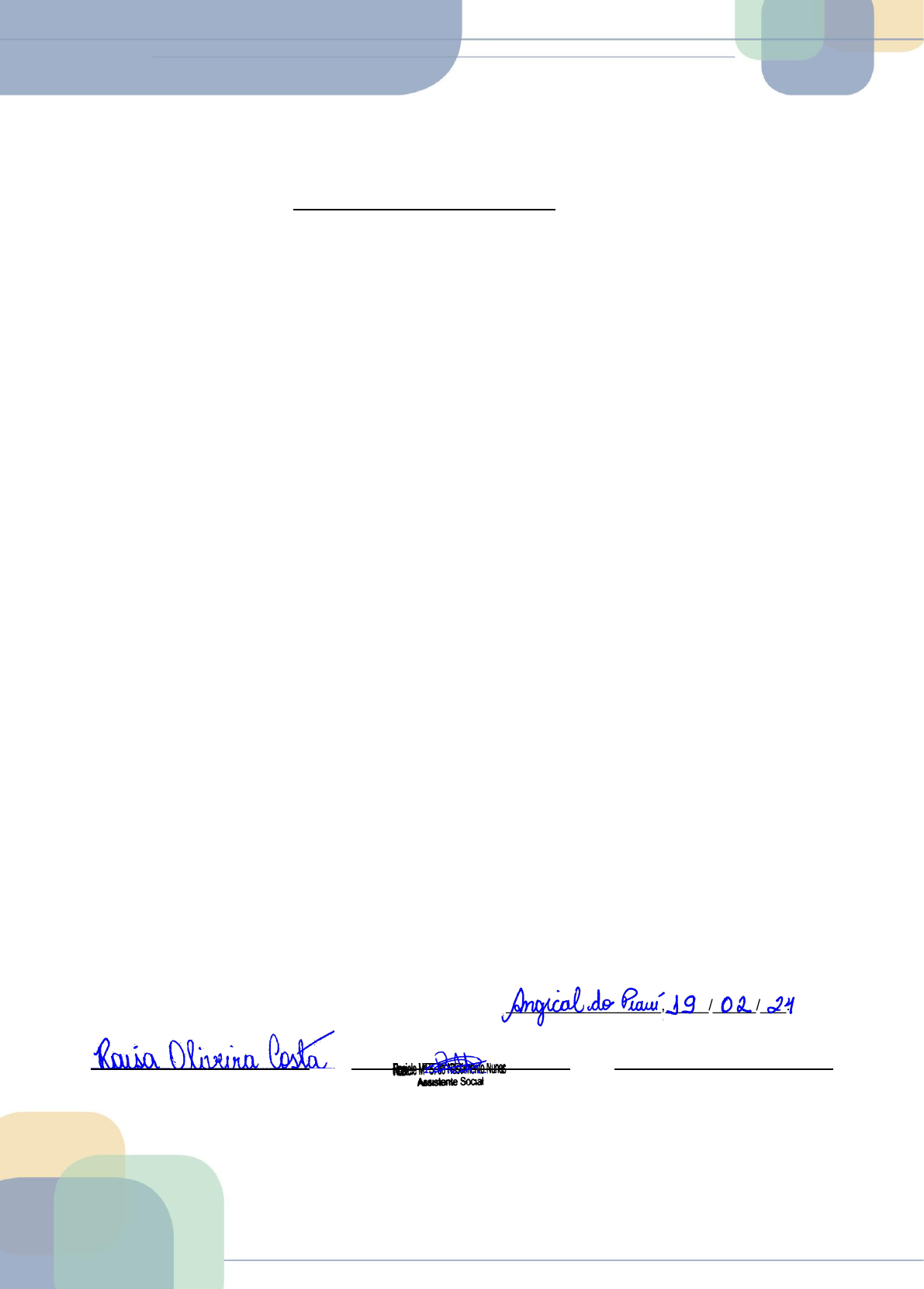 ANEXO I - PLANO DE ESTÁGIO Roteiro para elaboração do Plano de Estágio em Serviço Social 1 – Identificação a) Raísa Oliveira Costa, 2974676505, 7 º semestres b) Centro de Referência de Assistência Social, Rua Antônio gomes s/n centro, Angical do Piauí c) Secretaria Municipal do Trabalho, assistência social e direitos dos cidadãos d) Nome do supervisor de Campo/CRESS nº Rosiele Maria Soares do Nascimento Nunes / 5231 e) Nome do Supervisor acadêmico/CRESS nº: Carmem Célia Batista Sobrinho/ 2907 f) Período de realização do estágio: 19/02/2024 até 24/04/2024 g) Dias e horários de estágio: Segunda a quarta de 08:00 as 14:00 horas h) Dias e horários reservados para a supervisão de campo: nas segundas-feiras das 11h às 12h 2 – Justificativa O CRAS é uma unidade de proteção social básica do SUAS, que tem por objetivo prevenir a ocorrência de situações de vulnerabilidades e riscos sociais nos territórios, por meio do desenvolvimento de potencialidades e aquisições, do fortalecimento de vínculos familiares e comunitários, e da ampliação do acesso aos diretos. O Serviço Social no CRAS tem como finalidade acompanhar as famílias referenciadas a ele. A Equipe Técnica do CRAS desenvolve atendimentos psicossociais, ações como visitas domiciliares, encaminhamentos e orientações, estudos sociais, acolhimentos, promoção ao acesso de documentação pessoal, cadastramento socioeconômico, elaboração de relatórios e prontuários, atendimentos individuais ou grupais. O estagio III em Serviço social tem como proposta o exercício teórico-prático do aluno no campo de estágio. Aplicação e avaliação do projeto de intervenção. 3 – Objetivos 3.1 – Objetivo Geral: - Utilizar o instrumental teórico metodológico aprendido através das disciplinas já cursadas ou em curso. - Observar e respeitar princípios éticos e pedagógicos na relação com os usuários, a instituição e seus profissionais. - Analisar e propiciar o desenvolvimento de habilidades que a (o) permita internalizar atitudes positivas como pré-profissional. - Aprofundar a capacidade investigativa despertando para a possibilidade de pesquisa a partir da realidade campo de estágio. - Sistematizar sua prática, controle e avaliação dos resultados da intervenção. - Atuar com competência técnica e política diante das demandas que são suscitadas no cotidiano do estágio. 3.2 – Objetivos Pedagógicos: - Possibilitar ao aluno a identificação do espaço de intervenção profissional; - Possibilitar a aproximação do exercício profissional e sua importância para a população usuária do serviço social; - Identificar as políticas sociais implantadas na instituição e sua importância para a instrumentalização do exercício profissional. - Relacionar as expressões da questão social no município em que o aluno está inserido. 4 – Supervisão de Campo: Avaliação do Supervisor de Campo (formulário a ser encaminhado pela Instituição de Ensino), discursão de duvidas todas as segundas-feiras das 11h às 12h, individualmente com o supervisor de campo. 5– Supervisão Acadêmica: Avaliação do processo de supervisão: Plano de Estágio, relatórios processuais e descritivos produção de textos; avaliação individual no horário de funcionamento do polo, quando houver dúvidas. 6 – Avaliação: Acompanhamento do aluno a todos as ações do processo teórico pratico do aluno, mensurar o conhecimento do aluno a respeito dos instrumentos a serem realizados nas demandas. __________________,_____/_____/___. Estagiário Supervisor de Campo Assinatura e Carimbo Supervisor Acadêmico Assinatura e Carimbo ANEXO II A - FICHA DE SUPERVISÃO ACADÊMICA FICHA DE SUPERVISÃO ACADÊMICA Estágio Curricular Obrigatório em Serviço Social Nome do aluno: Raísa Oliveira Costa Dia/Mês Horário Assuntos Tratados 20/02 08h as 12h Orientação para a elaboração do Plano de Estágio; Orientação para o registro/ documentação das atividades; FICHA DE SUPERVISÃO ACADÊMICA Estágio Curricular Obrigatório em Serviço Social Nome do aluno: Raísa Oliveira Costa Dia/Mês Horário Assuntos Tratados 28/02 08h as 12h Indicação de bibliografias afins à área de atuação do estagiário para leitura, análise, discussão e produção de textos; FICHA DE SUPERVISÃO ACADÊMICA Estágio Curricular Obrigatório em Serviço Social Nome do aluno: Raísa Oliveira Costa Dia/Mês Horário Assuntos Tratados 11/03 08h as 12h Orientação para a produção do Relatório Semestral do Estágio FICHA DE SUPERVISÃO ACADÊMICA Estágio Curricular Obrigatório em Serviço Social Nome do aluno: Raísa Oliveira Costa Dia/Mês Horário Assuntos Tratados 02/04 08h as 12h Orientação para a entrega dos trabalhos acadêmicos Supervisor Acadêmico Assinatura e Carimbo Estagiário Assinatura Supervisor Acadêmico Assinatura e Carimbo Estagiário Assinatura Supervisor Acadêmico Assinatura e Carimbo Estagiário Assinatura Supervisor Acadêmico Assinatura e Carimbo Estagiário Assinatura ANEXO II B - FICHA DE SUPERVISÃO DE CAMPO FICHA DE SUPERVISÃO DE CAMPO Estágio Curricular Obrigatório em Serviço Social Nome do aluno: Raísa Oliveira Costa Dia/Mês Horário Assuntos Tratados 21/02 11h as 12h construção de conhecimento sobre instrumentalidade no serviço social, a Importância do conhecimento, como e feito o Parecer social, relatório social e Estudo social FICHA DE SUPERVISÃO DE CAMPO Estágio Curricular Obrigatório em Serviço Social Nome do aluno: Raísa Oliveira Costa Dia/Mês Horário Assuntos Tratados 27/02 11h as 12h Ensinamentos de como e a pratica de prestação de serviços utilizando os sites gov. e o Meu INSS FICHA DE SUPERVISÃO DE CAMPO Estágio Curricular Obrigatório em Serviço Social Nome do aluno: Raísa Oliveira Costa Dia/Mês Horário Assuntos Tratados 13/03 11h as 12h Orientações para requerimentos do bolsa família, bpc loas, benefícios eventuais e etc.. FICHA DE SUPERVI