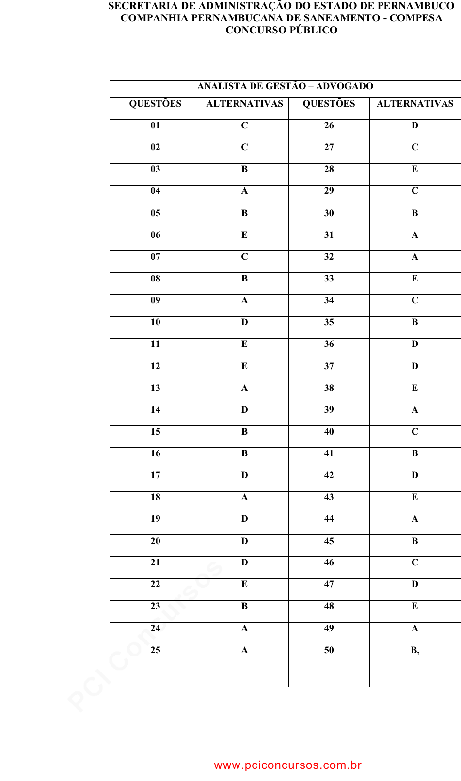pcimarkpci MjgwNDo0YmI0OjAxMDM6MWM5Yzo4ODJiOjNjYjI6NjFlNTplNTg5:VHVlLCAyOSBPY3QgMjAyNCAyMDo0Mzo1MiAtMDMwMA== www.pciconcursos.com.br SECRETARIA DE ADMINISTRAÇÃO DO ESTADO DE PERNAMBUCO COMPANHIA PERNAMBUCANA DE SANEAMENTO - COMPESA CONCURSO PÚBLICO ANALISTA DE GESTÃO – ADVOGADO QUESTÕES ALTERNATIVAS QUESTÕES ALTERNATIVAS 01 C 26 D 02 C 27 C 03 B 28 E 04 A 29 C 05 B 30 B 06 E 31 A 07 C 32 A 08 B 33 E 09 A 34 C 10 D 35 B 11 E 36 D 12 E 37 D 13 A 38 E 14 D 39 A 15 B 40 C 16 B 41 B 17 D 42 D 18 A 43 E 19 D 44 A 20 D 45 B 21 D 46 C 22 E 47 D 23 B 48 E 24 A 49 A 25 A 50 B, www.pciconcursos.com.br pcimarkpci MjgwNDo0YmI0OjAxMDM6MWM5Yzo4ODJiOjNjYjI6NjFlNTplNTg5:VHVlLCAyOSBPY3QgMjAyNCAyMDo0Mzo1MiAtMDMwMA== www.pciconcursos.com.br SECRETARIA DE ADMINISTRAÇÃO DO ESTADO DE PERNAMBUCO COMPANHIA PERNAMBUCANA DE SANEAMENTO - COMPESA CONCURSO PÚBLICO 2 ANALISTA DE GESTÃO – BIÓLOGO QUESTÕES ALTERNATIVAS QUESTÕES ALTERNATIVAS 01 C 26 E 02 C 27 B 03 B 28 D 04 A 29 B 05 B 30 A 06 E 31 C 07 C 32 E 08 B 33 D 09 A 34 C 10 D 35 A 11 E 36 E 12 E 37 B 13 A 38 C 14 D 39 B 15 B 40 B 16 B 41 D 17 D 42 A 18 A 43 B 19 D 44 E 20 D 45 A 21 C 46 C 22 E 47 E 23 A 48 A 24 B 49 D 25 D 50 E www.pciconcursos.com.br pcimarkpci MjgwNDo0YmI0OjAxMDM6MWM5Yzo4ODJiOjNjYjI6NjFlNTplNTg5:VHVlLCAyOSBPY3QgMjAyNCAyMDo0Mzo1MiAtMDMwMA== www.pciconcursos.com.br SECRETARIA DE ADMINISTRAÇÃO DO ESTADO DE PERNAMBUCO COMPANHIA PERNAMBUCANA DE SANEAMENTO - COMPESA CONCURSO PÚBLICO 3 ANALISTA DE GESTÃO – CONTADOR QUESTÕES ALTERNATIVAS QUESTÕES ALTERNATIVAS 01 C 26 B 02 C 27 A 03 B 28 D 04 A 29 C 05 B 30 D 06 E 31 C 07 C 32 A 08 B 33 E 09 A 34 C 10 D 35 B 11 E 36 A 12 E 37 C 13 A 38 D 14 D 39 C 15 B 40 D 16 B 41 A 17 D 42 C 18 A 43 D 19 D 44 C 20 D 45 D 21 C 46 A 22 B 47 A 23 D 48 B 24 E 49 B 25 C 50 A www.pciconcursos.com.br pcimarkpci MjgwNDo0YmI0OjAxMDM6MWM5Yzo4ODJiOjNjYjI6NjFlNTplNTg5:VHVlLCAyOSBPY3QgMjAyNCAyMDo0Mzo1MiAtMDMwMA== www.pciconcursos.com.br SECRETARIA DE ADMINISTRAÇÃO DO ESTADO DE PERNAMBUCO COMPANHIA PERNAMBUCANA DE SANEAMENTO - COMPESA CONCURSO PÚBLICO 4 ANALISTA DE GESTÃO – ENFERMEIRO DO TRABALHO QUESTÕES ALTERNATIVAS QUESTÕES ALTERNATIVAS 01 C 26 A 02 C 27 B 03 B 28 E 04 A 29 C 05 B 30 D 06 E 31 E 07 C 32 D 08 B 33 D 09 A 34 A 10 D 35 B 11 E 36 C 12 E 37 E 13 A 38 C 14 D 39 C 15 B 40 D 16 B 41 C 17 D 42 E 18 A 43 C 19 D 44 B 20 D 45 B 21 E 46 D 22 E 47 B 23 E 48 C 24 D 49 E 25 D 50 E www.pciconcursos.com.br pcimarkpci MjgwNDo0YmI0OjAxMDM6MWM5Yzo4ODJiOjNjYjI6NjFlNTplNTg5:VHVlLCAyOSBPY3QgMjAyNCAyMDo0Mzo1MiAtMDMwMA== www.pciconcursos.com.br SECRETARIA DE ADMINISTRAÇÃO DO ESTADO DE PERNAMBUCO COMPANHIA PERNAMBUCANA DE SANEAMENTO - COMPESA CONCURSO PÚBLICO 5 ANALISTA DE GESTÃO – MÉDICO DO TRABALHO QUESTÕES ALTERNATIVAS QUESTÕES ALTERNATIVAS 01 C 26 C 02 C 27 E 03 B 28 C 04 A 29 E 05 B 30 D 06 E 31 C 07 C 32 C 08 B 33 C 09 A 34 A 10 D 35 C 11 E 36 D 12 E 37 E 13 A 38 E 14 D 39 B 15 B 40 B 16 B 41 C 17 D 42 E 18 A 43 C 19 D 44 C 20 D 45 A 21 E 46 C 22 B 47 B 23 A 48 D 24 D 49 E 25 D 50 A www.pciconcursos.com.br pcimarkpci MjgwNDo0YmI0OjAxMDM6MWM5Yzo4ODJiOjNjYjI6NjFlNTplNTg5:VHVlLCAyOSBPY3QgMjAyNCAyMDo0Mzo1MiAtMDMwMA== www.pciconcursos.com.br SECRETARIA DE ADMINISTRAÇÃO DO ESTADO DE PERNAMBUCO COMPANHIA PERNAMBUCANA DE SANEAMENTO - COMPESA CONCURSO PÚBLICO 6 ANALISTA DE SANEAMENTO – ENGENHEIRO MECÂNICO QUESTÕES ALTERNATIVAS QUESTÕES ALTERNATIVAS 01 C 26 D 02 C 27 C 03 B 28 E 04 A 29 B 05 B 30 A 06 E 31 B 07 C 32 A 08 B 33 C 09 A 34 C 10 D 35 A 11 E 36 E 12 E 37 D 13 A 38 D 14 D 39 B 15 B 40 E 16 B 41 C 17 D 42 A 18 A 43 D 19 D 44 E 20 D 45 B 21 C 46 B 22 B 47 C 23 E 48 D 24 A 49 A 25 D 50 E www.pciconcursos.com.br pcimarkpci MjgwNDo0YmI0OjAxMDM6MWM5Yzo4ODJiOjNjYjI6NjFlNTplNTg5:VHVlLCAyOSBPY3QgMjAyNCAyMDo0Mzo1MiAtMDMwMA== www.pciconcursos.com.br SECRETARIA DE ADMINISTRAÇÃO DO ESTADO DE PERNAMBUCO COMPANHIA PERNAMBUCANA DE SANEAMENTO - COMPESA CONCURSO PÚBLICO 7 ANALISTA DE SANEAMENTO – ENGENHEIRO DE PRODUÇÃO QUESTÕES ALTERNATIVAS QUESTÕES ALTERNATIVAS 01 C 26 B 02 C 27 B 03 B 28 C 04 A 29 B 05 B 30 E 06 E 31 D 07 C 32 C 08 B 33 A 09 A 34 D 10 D 35 E 11 E 36 A 12 E 37 B 13 A 38 B 14 D 39 D 15 B 40 C 16 B 41 B 17 D 42 D 18 A 43 E 19 D 44 A 20 D 45 C 21 A 46 D 22 E 47 A 23 A 48 B 24 C 49 E 25 C 50 E www.pciconcursos.com.br