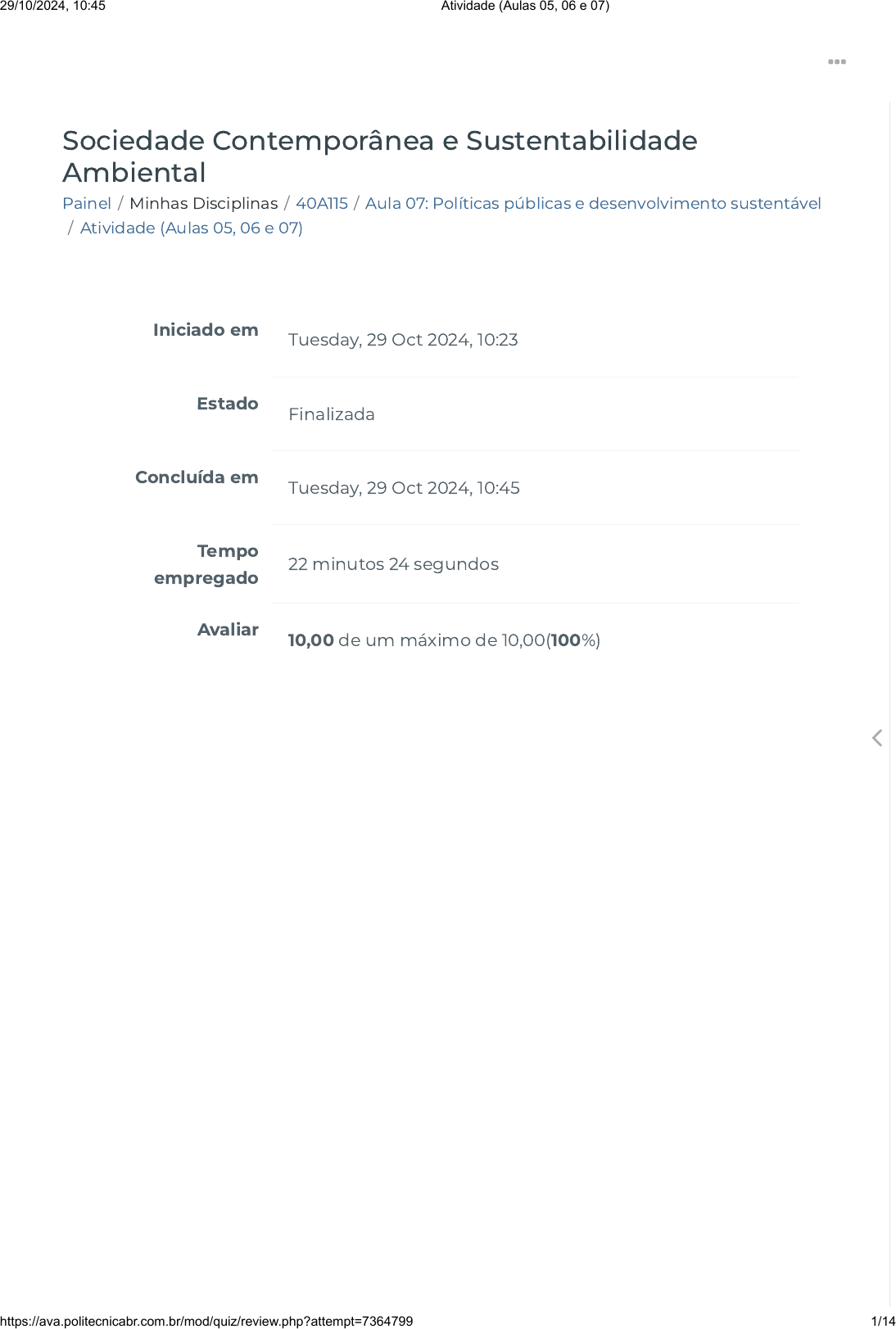 Painel / Minhas Disciplinas / 40A115 / Aula 07: Políticas públicas e desenvolvimento sustentável / Atividade (Aulas 05, 06 e 07) Sociedade Contemporânea e Sustentabilidade Ambiental Iniciado em Tuesday, 29 Oct 2024, 10:23 Estado Finalizada Concluída em Tuesday, 29 Oct 2024, 10:45 Tempo empregado 22 minutos 24 segundos Avaliar 10,00 de um máximo de 10,00(100%) 29/10/2024, 10:45 Atividade (Aulas 05, 06 e 07) https://ava.politecnicabr.com.br/mod/quiz/review.php?attempt=7364799 1/14 https://ava.politecnicabr.com.br/my/ https://ava.politecnicabr.com.br/my/ https://ava.politecnicabr.com.br/course/view.php?id=1057 https://ava.politecnicabr.com.br/course/view.php?id=1057#section-8 https://ava.politecnicabr.com.br/mod/quiz/view.php?id=33423 https://ava.politecnicabr.com.br/ Questão 1 Correto Atingiu 1,00 de 1,00 A respeito da ação do homem de forma negativa na natureza constatou-se que o ser humano podia intervir radicalmente no curso da natureza, a ponto de modi�car ou colocar em risco a existência do planeta. Porém algumas iniciativas foram tomadas entre elas um documento que previa que, se fosse mantido o ritmo de crescimento, os alimentos e a produção industrial iriam declinar até 2010, sendo inevitáveis o esgotamento dos recursos naturais, a poluição industrial e a diminuição da população. Que documento referi-se: Escolha uma opção: a. Declaração de Cocoyok b. Relatório Meadows c. Clube de Roma d. Protocolo de Kioto 29/10/2024, 10:45 Atividade (Aulas 05, 06 e 07) https://ava.politecnicabr.com.br/mod/quiz/review.php?attempt=7364799 2/14 https://ava.politecnicabr.com.br/ Questão 2 Correto Atingiu 1,00 de 1,00 De acordo com o relatório Nosso futuro, a de�nição de desenvolvimento sustentável entende-se como: Escolha uma opção: a. Ao se de�nirem os objetivos do desenvolvimento econômico e social, faz-se necessário levar em conta a sua sustentabilidade em todos os países desenvolvidos ou em desenvolvimento, com economia de mercado ou de planejamento central. b. Nenhuma das respostas. c. Ao se de�nirem os objetivos do desenvolvimento econômico e social, faz-se necessário levar em conta a sua sustentabilidade pricipalmente nos países em desenvolvimento, devido a baixa economia de mercado ou de planejamento central. d. Ao se de�nirem os objetivos do desenvolvimento econômico e social, faz-se necessário levar em conta a sua sustentabilidade apenas em países desenvolvidos, com economia de mercado ou de planejamento central. 29/10/2024, 10:45 Atividade (Aulas 05, 06 e 07) https://ava.politecnicabr.com.br/mod/quiz/review.php?attempt=7364799 3/14 https://ava.politecnicabr.com.br/ Questão 3 Correto Atingiu 1,00 de 1,00 De acordo com que foi estudado no capítulo Marque (V)verdadeiro ou (F) falso. ( ) Os ecossistemas, para Ernst Haeckel, abrangem todos os organismos que funcionam em conjunto em uma determinada área, as interações biológicas que eles estabelecem e todos os processos físico-químicos que sobre eles se re�etem. ( ) segundo Marcel Jollivet e Alain Pavé A noção de meio ambiente está relacionada a um objeto central e este objeto difere segundo as disciplinas cientí�cas. Ou seja, a noção de ambiente ou meio ambiente pressupõe a necessidade de um sujeito ou referencial central que percebe ou interage com o entorno. Ambiente ou meio ambiente, portanto, é aquilo que está em volta, mas necessariamente, de algo ou alguém. ( ) Embora a expressão meio ambiente seja complexa, polissêmica, mutável no tempo e no espaço, envolvendo fenômenos de características cientí�cas e técnicas difíceis de precisar, em geral tem sido usada como tudo aquilo que circunscreve os seres vivos e as coisas e a percepção e a intervenção do homem sobre o meio natural. ( ) A primeira Conferência sobre o Meio Ambiente em Estocolmo, foi lançado pelo canadense Maurice Strong. ( ) Desenvolvimento sustentável é aquele que atende às necessidades do presente sem comprometer a possibilidade as gerações futuras atenderem a suas próprias necessidades”. Escolha uma opção: a. V, V, F, V, V. b. V, F, F, F, V. 29/10/2024, 10:45 Atividade (Aulas 05, 06 e 07) https://ava.politecnicabr.com.br/mod/quiz/review.php?attempt=7364799 4/14 https://ava.politecnicabr.com.br/ Questão 4 Correto Atingiu 1,00 de 1,00 De acordo com cavalcanti o Progresso Econômico na sociedade moderna baseia-se: Escolha uma opção: c. V, V, V, F, V. d. V, V, V, V, V. e. F, V, V, V, V. a. Nenhuma das alternativas. b. Na insustentabilidade porque se baseia na acumulação de riqueza, e nas sociedades modernas ele se baseia na acumulação exponencial de riqueza. c. No crescimento e na percepção de que esse crescimento é ilimitado. Dessa forma, o desenvolvimento não �ui naturalmente porque as formas de desenvolvimento na natureza não se baseiam no crescimento, mas sim na evolução biológica, a qual comporta mudança e transformação homeostática. d. No progresso humano, o meio pelo qual o homem se desprenderia das limitações impostas pela natureza e alcançaria a sua emancipação. 29/10/2024, 10:45 Atividade (Aulas 05, 06 e 07) https://ava.politecnicabr.com.br/mod/quiz/review.php?attempt=7364799 5/14 https://ava.politecnicabr.com.br/ Questão 5 Correto Atingiu 1,00 de 1,00 Segundo Alain Touraine é correto a�rmar: Escolha uma opção: a. As soluções para os problemas ambientais, locais ou globais, nessa sociedade globalizada e caracterizada pela constante inovação cientí�ca e tecnológica, são um desa�o para a própria ciência, para o Estado, para o mercado e para a sociedade civil. b. Na globalização existe um reconhecimento geral de que os sistemas de conhecimento de peritos, embora especializados, são incapazes de prever as múltiplas consequências inesperadas dos seus atos. c. A globalização é mais do que a mundialização das trocas econômicas: signi�ca a destruição das mediações sociais e políticas que uniam a economia e a cultura e