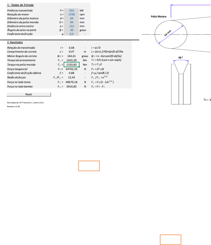 PAULO ANDRÉ PINHO DE ATAIDE RU: 1383257 ATIVIDADE PRÁTICA II - PROJETO DE CORREIAS ⁃ Potência Transmitida (kW): (3+2+5+7)x 15 = 255 ⁃ Rotação (rpm): (3+2+5+7)x 100 = 1700 ⁃ Diâmetro da polia menor (mm): (2+5+7) + 50 = 64 ⁃ Diâmetro da polia maior (mm): (2+5+7) + 80 = 94 ⁃ Distância entre centros (mm)(5+7)+ 100 = 112 ⁃ Ângulo do sulco da polia (graus) : 40 ⁃ Coeficiente de fricção/atrito : 0,3 1. Relação de transmissão (𝑖): i=d/D i = 64/94 = é aproximadamente 0,681 2. Comprimento da correia (𝐿): L=2a+1.57(D+d)+ (D - d)²/ 4a a=112 mm (distância entre centros) D=94 mm d=64 mm O comprimento da correia (𝐿) é aproximadamente 474,07 mm ou 0,47 m Paulo Ataide Typewriter NOTA: 97 Paulo Ataide Typewriter Whats: (96)991449865 Paulo Ataide Rectangle 3. Ângulo de abraçamento da polia menor (motora) (𝛼₁): α1 =π−2⋅\arcsen (D - d/ 2a) D−d=94−64=30mm D-d/2a = 30/2x112 = 30/224 ≈0,1339 \arcsen(0,1339) ≈ 0,1342rad α1 =π−2×0,1342=π−0,2684 ≈ 2,8732rad 2,8732rad x 180/ π ≈164,61° 4. Torque de acionamento (ajustado): T1 = P/ 2π . n/60 P=255000W n=1700rpm T1 = 255000/2π . 1700/60 = 255000/178.1 ≈1432.39 Nm 5. Torque na polia movida (𝑇₂): T2 = T1/ 𝑖 T2 = 1432.39/0.681 ≈ 2103.36 Nm 6. Força tangencial (𝐹𝑡): Ft = 2T1/ d T1 =1432,39N d=64mm=0,064m Ft = 2×1432,39 / 0,064 ≈ 44762,19N 7. Coeficiente de fricção efetiva (𝑓): f= μ / sin(β/2) μ=0,3 β=40° f=0,3 / sin(40°/2) = 0,3 / sin(20°) ≈ 0,3 / 0,342 ≈ 0,876 8. Razão de forças (𝐹₁/𝐹₂): F1 / F2 = ef⋅α1 f=0,876 α1 =164,61° = 2,873 F1 / F2 =e0,876×2,873 ≈ e2,516 ≈12,377 9. Força no lado tenso (𝐹₁): F1 = Ft / 1−1/ef⋅α1 F1 =44762,19 / 1−1/12,37744762,19 ≈1−0,080844762,19 ≈0,919244762,19 ≈ 48713,98N 10. Força no lado bambo (𝐹₂): F2 =F1 −Ft F2 =48713,98−44762,19 ≈ 3951,79N