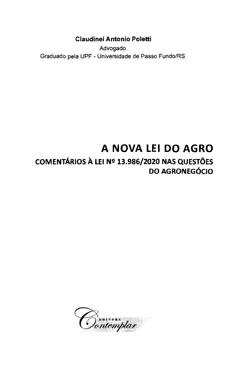 STJ00110728 Claudinei Antonio Poletti Advogado. Graduado pela UPF - Universidade de Passo Fundo/RS. A NOVA LEI DO AGRO COMENTÁRIOS À LEI N2 13.986/2020 NAS QUESTÕES DO AGRONEGÓCIO ISBN: 978-85-9487-073-5 Autor Claudinei Antonio Poletti Capa, Diagramação e Revisão Mario do Carmo Ricalde Revisão Gráfica Aline Vieira Pipino de Freitas Poletti, Claudinei Antonio. A Nova Lei do Agro. Comentários à Lei nº 13.986/2020 nas Questões do Agronegócio / Claudinei Antonio Poletti. 1 • ed. Campo Grande: Contemplar, 2021. 1. Direito. 2. Agrário. 1. Título. CDD: 340 CDU: 342.1247 Todo o conteúdo desta obra é de inteira responsabilidade do autor. Proibida a reprodução total ou parcial desta obra, por qualquer meio: eletrônico, mecânico, inclusive por processo xerográfico, sem a devida autorização do Editor (Lei nº 9.610/98). Todos os direitos desta Publicação reservados à Avenida Ana Rosa Castilho Ocampos, 756 Jardim Montevidéu. Campo Grande, MS Telefax: (67) 3029--2315 E-mail: contato@editoracontemplar.com.br site: www.editoracontemplar.com.br STJ00110728 SUMÁRIO INTRODUÇÃO ........................................................................................ 17 CAPÍTULO 1. O FUNDO GARANTIDOR SOLIDÁRIO - FGS ............... 21 1.1. FAF - Fundo de Aval Fraterno ........................................................... 21 1.2. Histórico ............................................................................................. 21 1.3. Natureza Jurídica ............................................................................... 23 1.4. Composição do FGS .......................................................................... 24 1.5. Consolidação de Dívidas .................................................................... 26 1.6. Responsabilidade Limitada ao Valor Integralizado - lmpenhorabilidade das Cotas .................................................................................................. 27 1. 7. A Obrigação de Pagar do FGS - Necessidade de Constituição em Mora ··················································································································29 1.8. Extinção do FGS - Restituição das Cotas ......................................... 30 CAPÍTULO 2. PATRIMÔNIO RURAL EM AFETAÇÃO .......................... 33 2.1. Histórico ............................................................................................. 33 2.2. Conceito - Natureza Jurídica ............................................................. 34 2.3. Quem Pode Constituir o Patrimônio Rural em Afetação .................... 37 2.4. Imóveis Rurais .................................................................................... 37 2.5. As Vedações ....................................................................................... 38 2.6. Constituição e Registro ...................................................................... 42 2.6.1. lnscriçl!Jo no CAR . . . . . . . . . . . . . . . . . . . . . . . . . . . . . . . . . . . . . . . . . . . . . . . . . . . . . . . . . . . . . . . . . . . . . . . . 46 2.6.2. Regularidade Fiscal, Trabalhista e Previdenciária ...................... 47 2.6.3. Certificaçl!Jo do Georreferenciamento no Sigef ........................... 47 2. 6. 4. Atos que Modifiquem ou Limitem a Propriedade . . . . . . . . . . . . . . . . . . . . . . . . 48 2. 6. 6. A Planta e as Coordenadas do Imóvel ........................................ 50 2. 6. 7. As Certidões ................................................................................ 50 2.7. A Regularidade Ambiental .................................................................. 51 2.8. A Análise da Documentação ............................................................... 51 2.9. Incumbências do Proprietário ............................................................. 54 2.1 O. Constituição da Garantia .................................................................. 56 STJ00110728 2.10.1. Vinculação - Segregação ............................................................. 57 2.10.2. Constituição de Outras Garantias ................................................. 58 2.10.3. Limitação ao Direito de Propriedade ............................................. 59 2.10.4. lmpenhorabilidade e Limitação para Novas Garantias ................. 63 2.10.5. Falência e Recuperação Judicial .................................................. 66 2.10.6. Previdenciárias, Trabalhistas e Fiscais ......................................... 68 2. 11. O Cancelamento do Patrimônio Rural de Afetação .......................... 69 CAPÍTULO 3. CÉDULA IMOBILIÁRIA RURAL ..................................... 73 3.1. Conceito - Natureza Jurídica ............................................................. 73 3. 1. 1. A Cambialidade . . .... . ....... .. .. . . .... . . ....... . . . .. . . . .. . ... . . . ... . . . . . ... . .... .... . .... 73 3.1.2. Título de Crédito .......................................................................... 76 3.1.3. Nominativo e à Ordem ................................................................ 78 3.1.4. Transferfvel e de Livre Negociaçrm ............................................. 80 3. 1. 5. Forma Cartular ou Escriturai ....................................................... 80 3. 1. 6. Promessa de Pagamento e Obrigação de Entrega de Coisa Certa ··············································································································ª2 3.2. O não Enquadramento no Crédito Rural. ........................................... 85 3.3. Vinculação a um Patrimônio Rural em Afetação ................................ 86 3.4. Aval e Garant