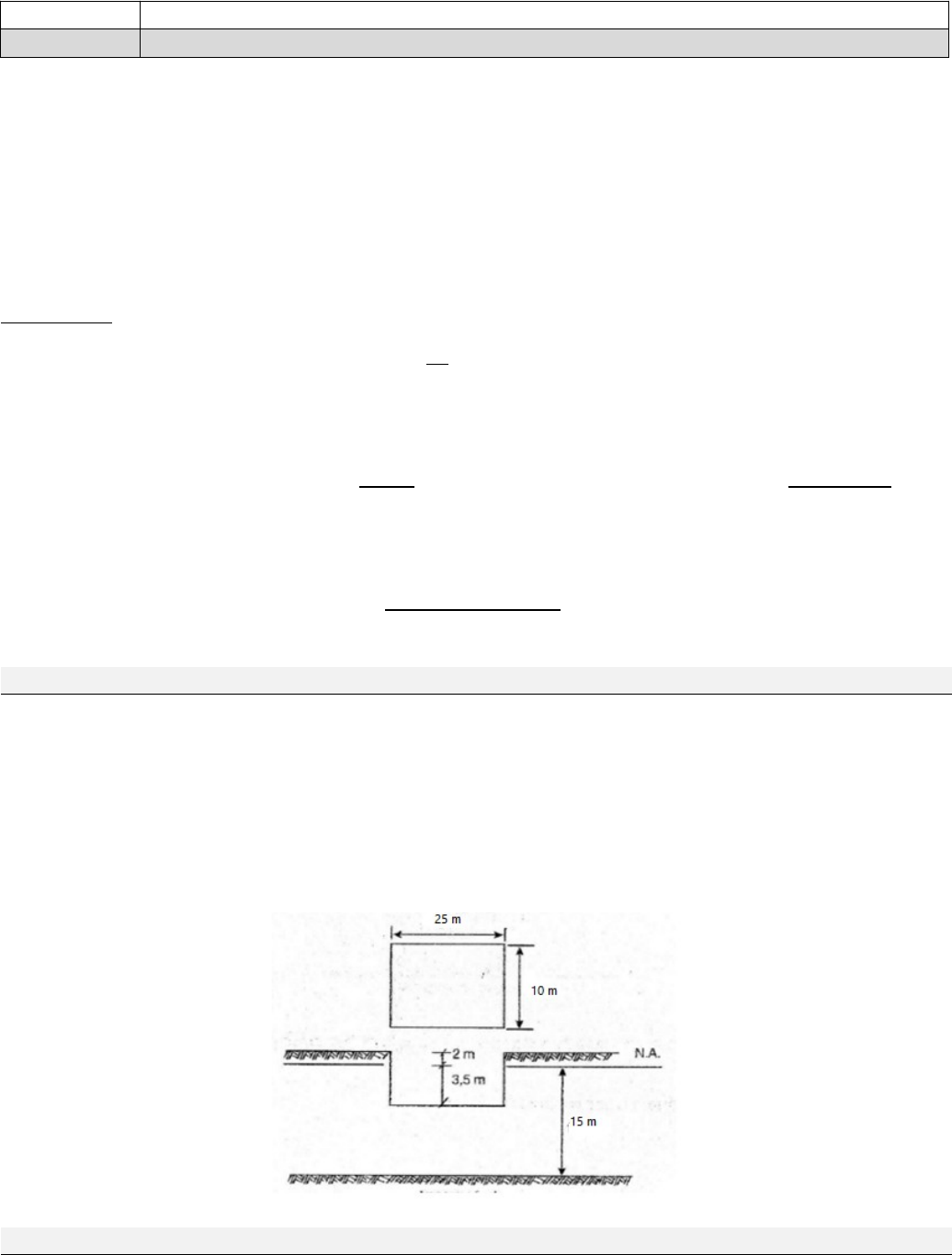 Curso: Engenharia Geotécnica Disciplina: Rebaixamento de Lençóis Freáticos Olá, turma! A seguir são apresentadas questões sobre todo o assunto abordado na disciplina. Para respondê-las, consultem o material didático fornecido, os materiais de apoio, as leituras e vídeos da sala de aula e dos estudos complementares. Orientações: · A atividade de envio da unidade 4 vale 25 pontos; · As questões discursivas devem ser redigidas pelo aluno e devidamente referenciadas. As citações e referências devem seguir o que preconizam a ABNT NBR 6023 e a ABNT NBR 10520; · Atividades com altos índices de plágio, conforme Manual do Aluno, devem ser reprovadas; · Todos os cálculos necessários à resolução da atividade devem estar elucidados em cada questão e podem ser feitos a mão e digitalizados; · A atividade deve ser entregue em apenas um arquivo em formato .pdf, .docx ou similar. QUESTÃO 01 (10 PONTOS) Calcular o número de ponteiras, e seu espaçamento, necessárias para rebaixar o lençol freático de uma área retangular de 25 x 10 m, sabendo que a permeabilidade do solo é dada por k = 10-2 cm/s e os demais elementos estão na figura. O cálculo deverá ser feito para manter seco o fundo da escavação. A empresa construtora pretende executar os poços com 4 polegadas de diâmetro onde serão instaladas as ponteiras filtrantes com 1,5 metros de altura molhada. QUESTÃO 02 (10 PONTOS) Para o sistema apresentado na seguinte figura, calcular a vazão (Q) que sai pelo ponto 2 e a pressão no ponto A. d=150 mm d=50 mm 1 2 z 0 A 3 m 2 m QUESTÃO 03 (5 PONTOS) Desenhe as formas mais comuns de distribuição de poços para o rebaixamento do lençol freático, sinalizando qual deles é o mais ideal. image1.png image2.png