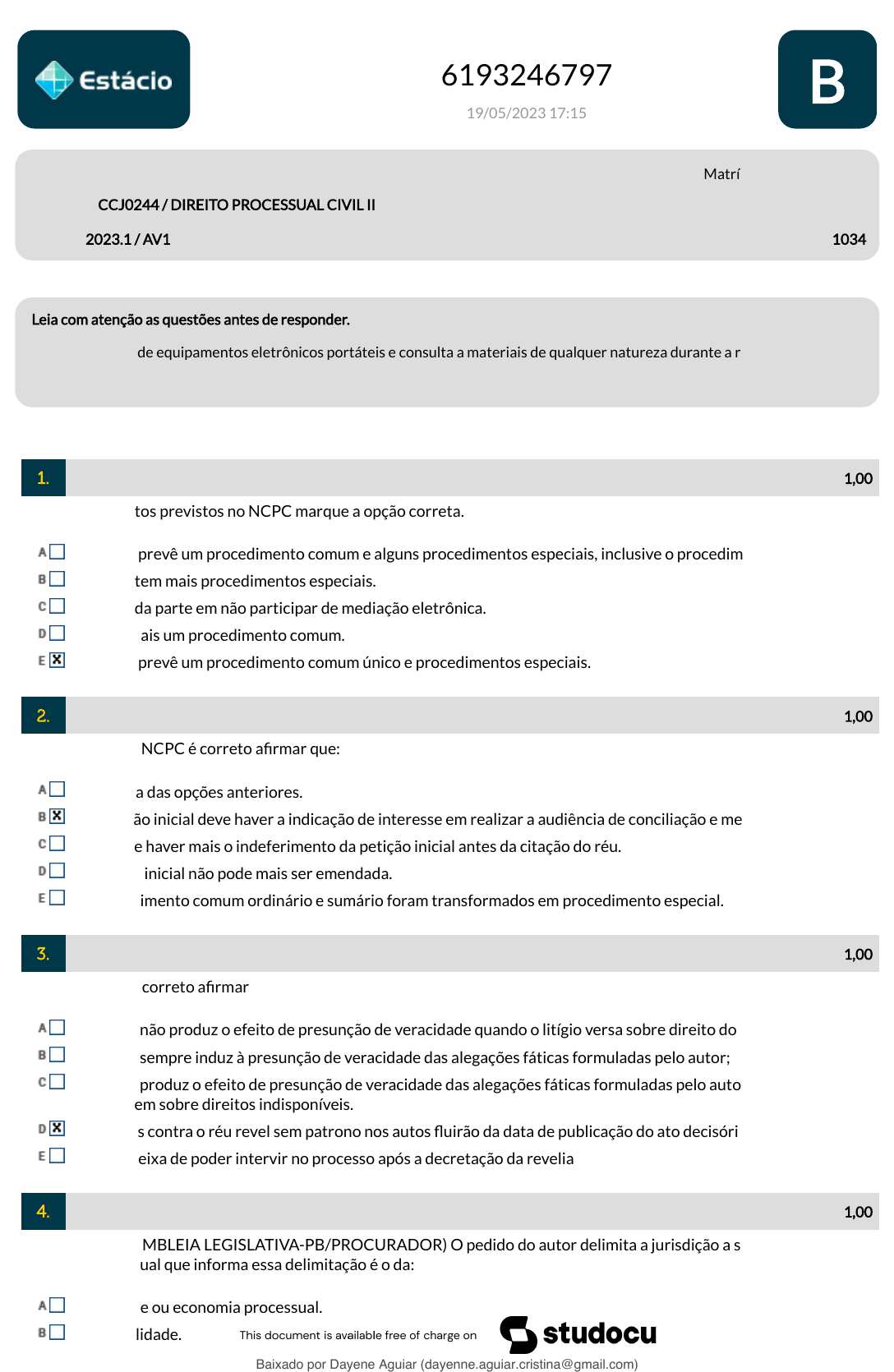 6193246797 B 19/05/2023 17:15 Nome: Matrícula: ________________ Disciplina: CCJ0244 / DIREITO PROCESSUAL CIVIL II Data: ___ /___ /______ Período: 2023.1 / AV1 Turma: 1034 Leia com atenção as questões antes de responder. É proibido o uso de equipamentos eletrônicos portáteis e consulta a materiais de qualquer natureza durante a realização da prova. Boa prova. _______ de 1,00 A respeito dos ritos previstos no NCPC marque a opção correta. O NCPC prevê um procedimento comum e alguns procedimentos especiais, inclusive o procedimento sumário. Não existem mais procedimentos especiais. A opção da parte em não participar de mediação eletrônica. Não há mais um procedimento comum. O NCPC prevê um procedimento comum único e procedimentos especiais. _______ de 1,00 De acordo com o NCPC é correto a�rmar que: Nenhuma das opções anteriores. Na petição inicial deve haver a indicação de interesse em realizar a audiência de conciliação e mediação. Não pode haver mais o indeferimento da petição inicial antes da citação do réu. A petição inicial não pode mais ser emendada. O procedimento comum ordinário e sumário foram transformados em procedimento especial. _______ de 1,00 Sobre a revelia, é correto a�rmar A revelia não produz o efeito de presunção de veracidade quando o litígio versa sobre direito do consumidor; A revelia sempre induz à presunção de veracidade das alegações fáticas formuladas pelo autor; A revelia produz o efeito de presunção de veracidade das alegações fáticas formuladas pelo autor mesmo em ações que versem sobre direitos indisponíveis. Os prazos contra o réu revel sem patrono nos autos �uirão da data de publicação do ato decisório no órgão o�cial; O revel deixa de poder intervir no processo após a decretação da revelia _______ de 1,00 (FCC/2013/ASSEMBLEIA LEGISLATIVA-PB/PROCURADOR) O pedido do autor delimita a jurisdição a ser prestada. O princípio processual que informa essa delimitação é o da: celeridade ou economia processual. imparcialidade. Baixado por Dayene Aguiar (dayenne.aguiar.cristina@gmail.com) lOMoARcPSD|30707823 Mobile User adstrição ou congruência. eventualidade. duração razoável do processo. _______ de 1,00 Em uma ação proposta com pedido de condenação a indenização por danos materiais e danos morais, após a apresentação de contestação, o magistrado entende que o primeiro pedido restou incontroverso, e, por isso, condenou o réu ao pagamento dos danos materiais comprovados e, no mesmo ato, determinou o prosseguimento da ação somente em relação aos danos morais. Esta decisão tem natureza jurídica de julgamento antecipado parcial de mérito e, portanto, desa�a recurso de apelação. julgamento antecipado parcial de mérito e, portanto, desa�a recurso de agravo de instrumento. tutela provisória incidental da evidência, mas não apresenta recorribilidade imediata, pois não comporta recurso de agravo de instrumento, mas apenas apelação após a sentença �nal. sentença �nal de mérito e, portanto, desa�a recurso de apelação. tutela provisória incidental de urgência e, portanto, desa�a recurso de agravo de instrumento. _______ de 1,00 Segundo o Código de Processo Civil de 2015, não é hipótese de indeferimento da petição inicial: Quando o autor, após determinação do juiz, não completar ou emendar a petição inicial no prazo legal Quando for inepta a petição inicial Quando o juiz reconhecer, desde logo, a ocorrência de prescrição e decadência Quando o autor carecer de interesse processual Quando a parte for manifestamente ilegítima _______ de 1,00 NÃO se refere a um requisito da petição inicial O pedido, com suas especi�cações; O dispositivo legal aplicável ao caso; Indicação de CPF das partes. O órgão judicial ao qual é dirigida; O valor da causa; _______ de 1,00 No tocante ao tema resposta do réu, assinale a alternativa correta. A existência de convenção de arbitragem pode ser alegada a qualquer tempo pelo réu. Os litisconsortes passivos sempre têm o mesmo prazo para apresentar contestação. O réu pode ser condenado a arcar com as despesas processuais e indenizar o autor pelos prejuízos decorrentes da falta de indicação do sujeito passivo, quando alegar sua ilegitimidade e não indicar o sujeito passivo, tendo conhecimento de quem o seja. Deve necessariamente ser alegado no bojo da contestação a denunciação da lide, o chamamento do processo, a incompetência relativa, a impugnação ao valor da causa e a arguição de impedimento ou suspeição. O termo inicial para oferecimento de contestação será sempre a data da audiência de conciliação ou de mediação, ou da última sessão de conciliação, quando qualquer parte não comparecer ou, comparecendo, não houver autocomposição. _______ de 1,00 De acordo com o Novo Código de Processo Civil, não deve ser alegada em preliminar da contestação: C) perempção e litispendência. Baixado por Dayene Aguiar (dayenne.aguiar.cristina@gmail.com) lOMoARcPSD|30707823 Mobile User Campus: CAMPO GRANDE (RJ) Prova Impressa em 19/05/2023 por MARTA DE CASSIA POMBAL PANGAIO Ref.: 6193246797 Prova Montada em 17/04/2023 B) a improcedência do pedido do autor. E) Nenhuma das opções acima. A) incompetência relativa e absoluta. D) a incapacidade da parte, defeito de representação ou falta de autorização. _______ de 1,00 A respeito da petição inicial e da resposta do réu, no NCPC assinale a alternativa correta. Oferecida a contestação, o autor não poderá ,sem o consentimento do réu,desistir da ação . Indeferida a petição inicial, a decisão somente poderá ser reformada, em recurso de apelação, pelo tribunal competente. A regra da impugnação especí�ca dos fatos se aplica ao advogado dativo, ao curador especial e ao órgão do Ministério Público. Independentemente da natureza da lide e das partes envolvidas, se o réu deixar de contestar