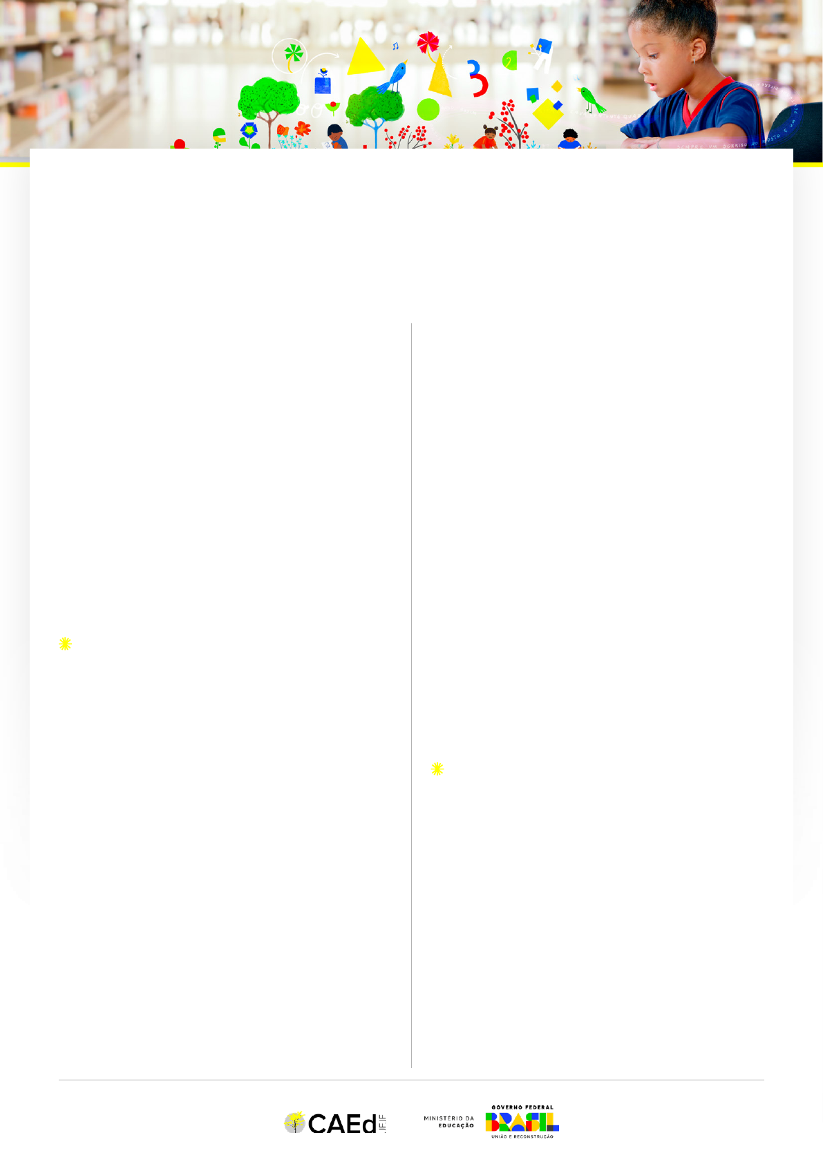 Prezada Professora Aplicadora, Prezado Professor Aplicador, A seguir, apresentamos as orientações para a aplicação da avaliação de Escrita junto às estudantes e aos estudantes do 4º e 5º ano do EF que participarão da Avaliação Contínua da Aprendizagem – Ciclo III / 2024, promovida pelo Ministério da Educação em parceria com o Centro de Políticas Públicas e Avaliação da Educação da Universidade Federal de Juiz de Fora (CAEd/UFJF). É muito importante que a equipe aplicadora tenha domínio das instruções de aplicação. Por isso, caso ainda tenha alguma dúvida, após a leitura desse material, consulte os tutoriais, vídeos, perguntas frequentes e canais de atendimento disponíveis na Plataforma. Vamos caminhar juntos, sempre ao lado de nossas crianças. Organização para a aplicação Ao receber os instrumentos de aplicação lembre-se de: 1. Conferir se os Cadernos de Teste correspondem ao ano de escolaridade da turma avaliada. 2. Verificar se o quantitativo de Cadernos de Teste é sufi- ciente para atender as crianças presentes para a avalia- ção na sua turma. 3. Informar às estudantes e aos estudantes que: P devem desligar os celulares e outros aparelhos eletrônicos e mantê-los desligados até o final da aplicação; P devem deixar sobre a carteira apenas lápis, borra- cha, caneta esferográfica azul ou preta; P não poderão ausentar-se definitivamente da sala de aula durante a aplicação (exceto em casos ex- tremos); P nenhuma pergunta sobre o conteúdo do teste po- derá ser respondida por você; P a atividade terá duração de até 40 minutos; P durante a distribuição dos testes, elas e eles devem aguardar para que todas e todos iniciem a realiza- ção da avaliação ao mesmo tempo. 4. Distribuir os Cadernos de Teste para as estudantes e os estudantes. 5. Orientar as estudantes e os estudantes a: □ escrever no Caderno de Teste o nome completo e a data de nascimento; □ responder as questões nas áreas corretas da Folha de respostas. 6. Iniciar a aplicação do teste. Somente a partir des- se momento o tempo de duração da aplicação deve ser considerado. 7. Atentar-se para o andamento da atividade durante todo o período. 8. Avisar à turma quando estiverem faltando 10 (dez) minu- tos para o término da avaliação. 9. Recolher todos os Cadernos de Teste. Após a aplicação do teste 1. Após a aplicação, a correção do teste de escrita deve ser realizada com o preenchimento do Formulário de Cor- reção do(a) Professor(a), tendo como base os Guias de Correção do CAEd, disponibilizados na Plataforma Com- promisso Nacional Criança Alfabetizada. Após a correção, realize um dos protocolos abaixo: □ Acesse a plataforma para realizar o lançamento das marcações realizadas nos Formulários de Correção do(a) Professor(a); ou □ Faça a leitura dos Formulários de Correção do(a) Professor(a) utilizando o aplicativo MEC Avaliação para a captura das marcações. Veja um exemplo: ORIENTAÇÕES PARA APLICAÇÃO | 4° E 5° ANOS DO EF – ESCRITA AVALIAÇÃO CONTÍNUA DA APRENDIZAGEM - CICLO III MEC 2024 88447777007777779966 Questão 01 - Produção de uma narrativa a partir de introdução Situação de correção A B C D E F G H I Competência I - Registro formal A B C D E Competência II - Coerência temática A B C D E Competência III - Tipologia textual A B C D E Competência IV - Coesão A B C D E INSTRUÇÕES Prezado(a) Professor(a), para realizar a correção do teste, consulte o Guia de Correção desta etapa, disponibilizado na plataforma. Verifique as orientações para a avaliação de cada questão. Ao realizar as marcações neste formulário, preencha o círculo completamente e com nitidez, utili- zando caneta esferográfica de tinta azul ou preta. EXEMPLO DE PREENCHIMENTO resposta à questão Y = A resposta à questão Z = C FORMULÁRIO DE CORREÇÃO DO(A) PROFESSOR(A) – 4EF AVALIAÇÃO CONTÍNUA DA APRENDIZAGEM – CICLO II / 2024 Nome do(a) estudante: __________________________________________________________________________________________________ Data de nascimento do(a) estudante: ______ / ______ / ______ Nome da turma: ______________________________________________ Legenda para preenchimento das competências de I a IV FOLHA DE INFORMAÇÕES COMPLEMENTARES - AVALIAÇÃO DE ESCRITA - 4EF E 5EF 1ª Avaliação Formativa 2024 - Diagnóstica Inicial Prezada Professora Aplicadora ou Prezado Professor Aplicador, Para realizar o preenchimento do Formulário de Correção e o lançamento na Plataforma Compromisso Nacional Criança Alfabetizada, das Avaliações de Escrita do 4º e 5º anos do Ensino Fundamental, considere as informações a seguir: CHAVE DE CORREÇÃO Pág. 07 do Guia de correção: Em todas as competências avaliadas, o critério “Nível I” corresponde à opção A, o critério “Nível II” corresponde à opção B, o critério “Nível IIII” corresponde à opção C, o critério “Nível IV” corresponde à opção D, e o critério “Nível V” corresponde à opção E, como ilustrado abaixo: A B C D E Nível I Nível II Nível III Nível IV Nível V ATENÇÃO! Na plataforma Compromisso Nacional Criança Alfabetizada, em cada questão, caso necessário, sinalize uma das duas indicações abaixo: 1ª Indicação Questão em branco Marque esta opção quando nenhum dos aspectos estiver sinalizado no Formulário de Correção. Esta indicação é diferente da Situação de Correção “EM BRANCO” (opção B), prevista na pág. 01 do Guia de correção, em que não há nenhuma resposta do estudante na avaliação. ■ “EM BRANCO” (opção B): para as situações em que não há nenhuma resposta do estudante na avaliação; ■ Questão em branco: para as situações em que não há nenhuma marcação no Formulário de Correção. 2ª Indicação Dupla marcação Marque esta opção quando você observar que no Formulário de Correção há mais de uma marcação. Por exemplo, v