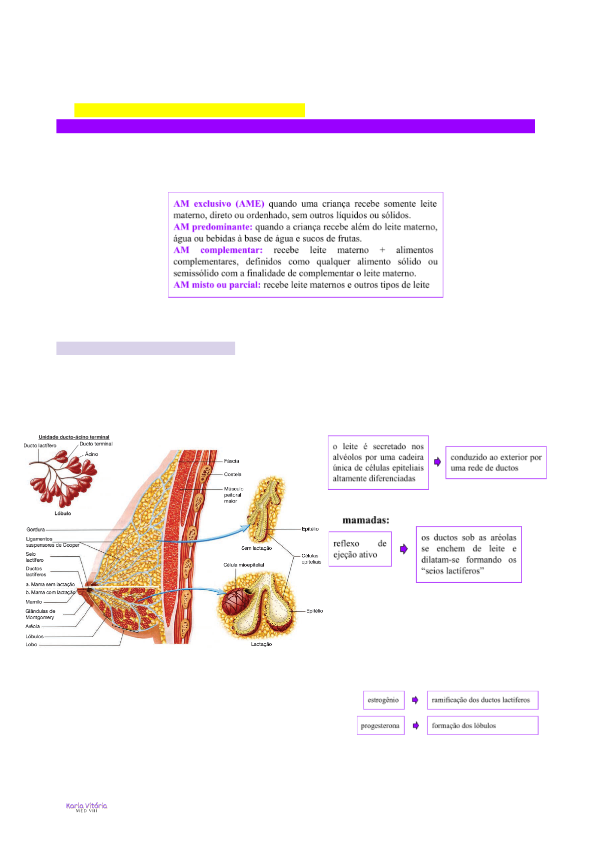 Aleitamento materno, puericultura, desenvolvimento, crescimento, capurro- 3º semestre 1. Como deve ser feito o aleitamento materno? ALEITAMENTOMATERNO . → Diz-se que uma criança está em AM quando ela recebe leite materno (direto da mama ou ordenhado) independente de estar recebendo ou não outros alimentos. Classificação: OMS, MS e SBP recomendam AM por 2 anos ou mais, sendo de forma exclusiva até os 6 meses Como o leite é produzido? . As mulheres adultas possuem de 15 a 25 lobos mamários (glândulas tubuloalveolares), constituídos, cada um, por 20 a 40 lóbulos → 10 a 100 alvéolos Envolvendo os alvéolos, encontram-se as células mioepiteliais e, entre os lobos mamários, os tecidos adiposo, conjuntivo, linfático, nervoso e vascular Gravidez: → diferentes hormônios preparam a mama para a lactação; → lactogênio placentário, prolactina e gonadotrofina coriônica (HCG) → o lactogênio placentário impede que durante a gravidez a mama secrete leite. Aleitamento materno, puericultura, desenvolvimento, crescimento, capurro- 3º semestre Fase I: influência de hormônios Fase II: também pela ação hormonal; ocorre mesmo sem sucção até o 3º ou 4º dia; Fase III: controle autócrino depende primordialmente da sucção do bebe e do esvaziamento da mama. → Grande parte do leite de uma mamada é produzido enquanto a criança mama, sob o estímulo da prolactina, que é liberada graças à inibição da liberação de dopamina, que é um fator inibidor da prolactina. A liberação de prolactina e ocitocina é regulada pelos reflexos da produção e ejeção do leite, respectivamente, ativados pela estimulação dos mamilos, sobretudo pela sucção da criança. A liberação da ocitocina também ocorre em resposta a estímulos condicionados, como visão, olfato e audição (ouvir o choro da criança), e a fatores de ordem emocional, como motivação, autoconfiança e tranquilidade Composição e aspecto do leite materno . → homogêneo quanto à sua composição; Apenas as mulheres com desnutrição grade podem ter o seu leite afetado quantitativo e qualitativamente Aleitamento materno, puericultura, desenvolvimento, crescimento, capurro- 3º semestre Colostro: secreção láctea que contém mais proteínas e menos lipídios que do leite maduro. é rico em imunoglobulinas, em especial IgA. Leite maduro: 10º dia pós parto. Composição: maior teor lipídico e de lactose; menor quantidade de proteínas. O leite anterior (solução) é ralo e doce, ocorrendo predomínio de proteína do soro e lactose. No meio da mamada (suspensão) é maior a quantidade de caseína. O leite posterior (emulsão) tem grande concentração de gordura, necessária para saciar o lactente. Leite de mães de RN pré-termo: tem mais calorias, mais proteínas, mais lipídeos; → O principal carboidrato do leite materno é a lactose, a principal proteína é a lactoalbumina. → A água contribui com quase 90% da composição do leite materno, o que garante o suprimento das necessidades hídricas de uma criança em AME, mesmo em climas quentes e áridos A concentração de gordura no leite (e consequentemente o teor energético) aumenta no decorrer de uma mamada → o leite do final da mamada (leite posterior) é mais rico em energia e sacia melhor a criança; daí a importância de a criança esvaziar bem a mama. O leite materno contém baixas concentrações de vitamina K, vitamina D e ferro recomendações do departamento de nutrologia da SBP: Vitamina K Nascimento Vitamina D até os 18 meses Ferro até os 2 anos a partir da introdução da alimentação complementar → No início da mamada, o teor de água e a presença de constituintes hidrossolúveis confere ao leite coloração de água de coco; no meio da mamada, com o aumento da concentração de caseína, o leite tende a ter uma coloração branca opaca; e, no final da mamada, em virtude da concentração dos pigmentos lipossolúveis, o leite é mais amarelado. A IgA secretória é a principal imunoglobulina, que atua contra microrganismos → leucócitos, que matam microrganismos; lisozima e lactoferrina, que atuam sobre bactérias, vírus e fungos; → oligossacarídeos (mais de 130 compostos), que previnem ligação da bactéria na superfície mucosa e protegem contra enterotoxinas no intestino, ligando-se à bactéria; → fator bífido, que favorece o crescimento do Lactobacillus bifidus na criança, uma bactéria saprófita que acidifica as fezes, dificultando a instalação de bactérias que causam diarreia, como Shigella, Salmonella e Escherichia coli. Aleitamento materno, puericultura, desenvolvimento, crescimento, capurro- 3º semestre Dinâmica da transferência do leite da mama para a criança . A técnica de amamentação, em especial o posicionamento da dupla mãe-bebê e a pega/sucção do bebê, são importantes para a retirada efetiva do leite pela criança e proteção dos mamilos. → o bebê com pega inadequada é capaz de obter o leite anterior, mas tem dificuldade de retirar o leite posterior, mais nutritivo e rico em gorduras → Quando o bebê faz a pega correta, o mamilo fica posicionado na parte posterior do palato, protegido de fricção e compressão, prevenindo traumas mamilares. A OMS destaca quatro pontos-chave para posicionamento e quatro para pega, que caracterizam uma boa técnica: Não há recomendações de amamentar . HIV, HTLV1 E HTLV2 (vírus da leucemia humana); Uso de medicamento incompatíveis com a amamentação (antineoplásicos e radiofármacos); crianças portadores de galactosemia; , doença de xarope de bordo e fenilcetonúria. Interrupção temporária de amamentação: . → infecções herpéticas, varicela ( a: se a mãe apresentar vesículas na pele cinco dias antes do parto ou até dois dias após o parto, recomenda-se o isolamento da mãe até que as lesões adquirem a forma de crosta); doença de chagas na fase aguda ou quando houver sangramento mamilar evidente; Abcesso mamár