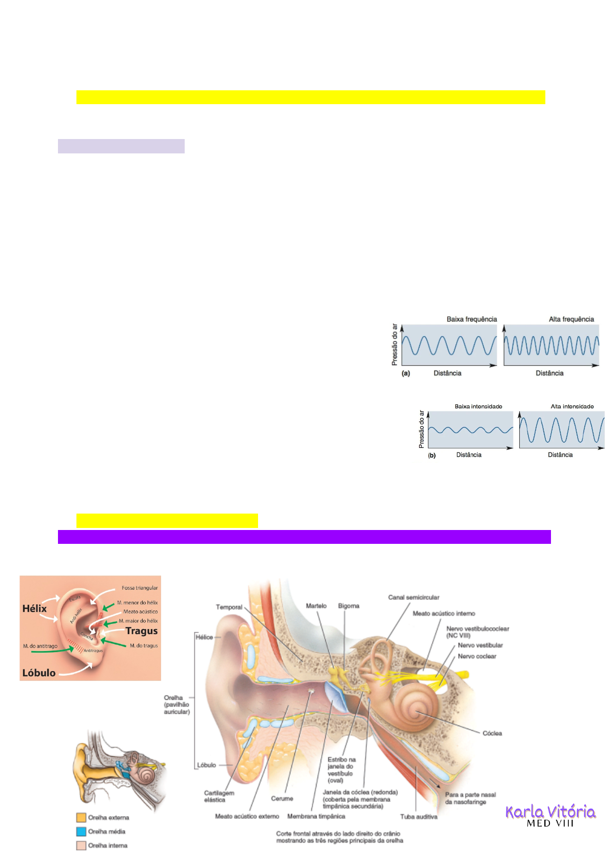 via auditiva e vestibular- 3º semestre TUTORIA 2.2 1. Quais as características anatômicas e histológicas referente às vias auditivas e vestibulares? *estudar morfo e histologia por morfo 2.2 Natureza do som : → são variações audíveis na pressão do ar; → quando um objeto se move em uma direção, um trecho de ar é comprimido, aumentando a densidade das moléculas; → Uma questão interessante é: “se uma árvore cai na floresta e ninguém escuta nada, então foi emitido algum som?”. Fisiologicamente, a resposta é NÃO, pois som, assim como dor, é uma percepção que resulta do processamento do cérebro de uma informação sensorial. A queda da árvore emite ondas sonoras, mas não existe som a menos que alguém ou alguma coisa esteja presente para processar e perceber a energia da onda como um som. Frequência: número de trechos de ar comprimidos ou rarefeitos que passam pelos nossos ouvidos a cada segundo; número de ciclos por segundo → as ondas de alta frequência tem regiões mais comprimidas e rarefeitas; → nosso ouvido: 20- 20000 Hz; a audição mais acurada entre 1.000 a 3.000 Hz. → agudo ou grave → Ultrassom: acima de 20kHz → Infrassom: abaixo de 20 Hz Intensidade: diferença e pressão do ar entre os picos e os vales das ondas sonoras; mais volume + intensidade; 2. Qual a fisiologia da via auditiva? VIA AUDITIVA . Audição → parte vivida de nossa vida consciente; via auditiva e vestibular- 3º semestre Estrutura do sistema auditivo . Pavilhão: está em um local estratégico, tornando mais sensível aos sons que chegam de frente do que de traz. As eminências e depressões do pavilhão assumem um papel na localização dos sons; dividido em 3: → Ouvido externo: do pavilhão até a membrana timpânica; Ouvido médio: membrana timpânica e ossículos; Ouvido interno: estrutura medial à janela oval Ar no ouvido: está em continuidade com o ar nas cavidades nasais através da tuba de estácio, embora esse tubo esteja fechado normalmente por um válvula. → se a pressão no interior do ouvido médio for mais alta que no exterior, a membrana timpânica protrai, e dá um pressão desagradável no ouvido. Amplificação da força dos sons pelos ossículos . → se não houvesse os ossículos para amplificar a força dos sons, o fato de a cóclea ser preenchida com fluido e não com ar, a membrana mal se moveria. → o fluido no ouvido interno resiste muito mais ao movimento do que o ar, de modo que é necessária uma pressão maior para vibrar o fluido do que vibrar o ar. Pressão sobre a membrana: definida como a força que lhe é imposta dividida por sua superfície; a pressão na janela torna-se maior do que a pressão na membrana timpânica se: 1. a força sobre a membrana da janela oval for maior do que a sobre a membrana timpânica; 2. a área de superfície da janela oval for menor do que a áre a membrana timpânica; Mecanismos de amplificação do som: aumento da pressão na janela oval pela alteração da força e da superfície; Ossículos: atuam como alavanca; → são transformados em vibrações menores, porém mais fortes; Reflexo de atenuação . → os dois músculos ligados aos ossículos tem um efeito significativo sobre a transmissão do som ao ouvido interno; Músculo tensor do tímpano: ligado ao martelo; Músculo estapédio: se liga ao estribo Com a contração desses músculos, a cadeia de ossículos fica mais rígida e a condução de som ao ouvido interna é diminuída → Se um som é muito alto, podendo causar danos à orelha interna, os pequenos músculos da orelha média puxam os ossos para reduzir seus movimentos, diminuindo, assim, a transmissão sonora em algum grau. via auditiva e vestibular- 3º semestre → o reflexo de atenuação tem um retardo de 50 a 100 ms em relação ao momento em que o som alcança o ouvido, possibilitando com que o dano possa ter ocorrido antes da contração; → O reflexo também está ativado quando falamos, de modo que não ouvimos a nossa própria voz tão alta quanto ouviremos sem esse reflexo; Helicotrema: local onde a rampa média está fechada e as escalas vestibulares e timpânicas se encontram; → A diferença na concentração da perilinfa e da endolinfa ocorre por causa de um processo de transporte ativo que ocorre na estria vascular, no endotélio que recobre a parede da escola média em contato com a endolinfa→ reabsorve sódio da endolinfa e secreta K+ Potencial endoclear: a endolinfa é aproximadamente 80mV mais positivo que a perilinfa via auditiva e vestibular- 3º semestre Via auditiva . → Como a pressão do fluido não tem nenhum outro lugar para escapar, a membrana da janela redonda deve se abaular para fora em resposta ao mov da janela oval, pois o fluido da cóclea é incompressível; Qualquer movimento da janela oval deve ser acompanhado pelo movimento da janela redonda Membrana basilar: é flexível e se movimenta em resposta ao som → cinco vezes mais larga no ápice do que na base; → a rigidez da membrana diminui da base em direção ao ápice; → a distância que a onda percorre a membrana basilar depende da frequência do som → os sons de alta frequência produzem a propagação de uma onda, a qual se dissipa próxima à base estrita e rígida da membrana basilar; → os sons de baixa frequência produz uma onda que se propaga por toda a membrana até o seu ápice, antes de se dissipar; Tonotopia: organização sistemática de frequências características em uma estrutura auditiva; Órgão de corti: local onde as células receptoras auditivas que convertem a energia mecânica em uma alteração na polarização da membrana estão; → células ciliadas, pelos pilares de corti e células de sustentação; via auditiva e vestibular- 3º semestre → as células ciliadas possuem estereocílios → não são neurônios → são células epiteliais especializadas; → são elas que formam sinapses com neurônios sensitivos de primeira ordem e com os n