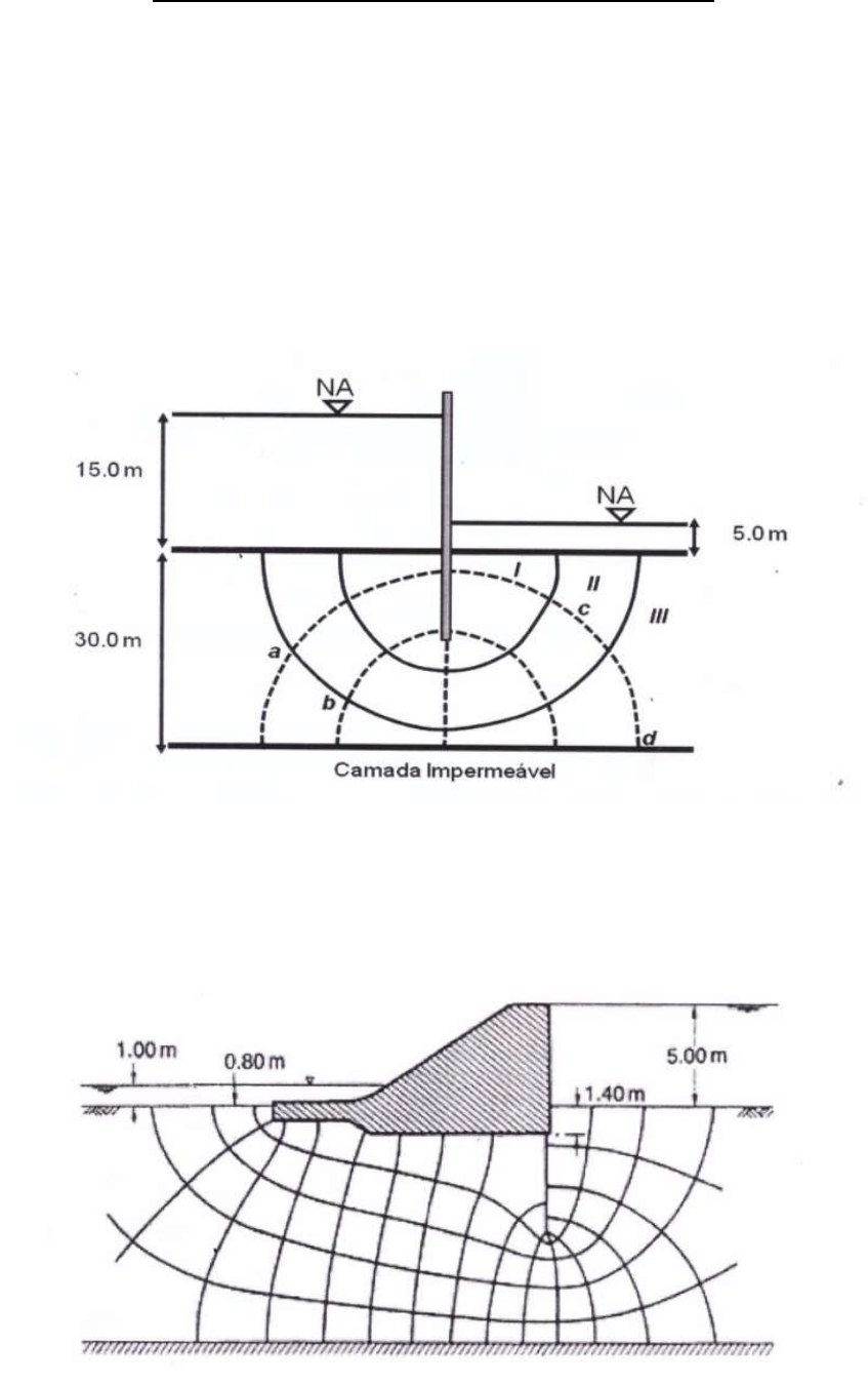 Lista de Exercícios: Percolação d’água nos solos Prof: Juliana Azoia Lukiantchuki 1) A Figura a seguir mostra uma rede de fluxo em torno de uma cortina estaca-prancha em uma camada de solo permeável. Considerando-se kx=kz=k= 510-3 cm/s, determine: a) A altura (acima da superfície do solo) alcançada pela água, medida por piezômetros posicionados nos pontos a, b, c e d; b) A vazão por unidade de comprimento através do canal de fluxo II (perpendicular à seção mostrada); e c) A vazão total através da camada permeável por unidade de comprimento. 2) A Figura a seguir apresenta a seção transversal de uma barragem. Determine a vazão total diária que percola pelo terreno da fundação. Elabore um diagrama da distribuição de subpressão na base da barragem. Adotar o coeficiente de permeabilidade do solo igual a 3.510-5 cm/s 3) Calcular a vazão que percola sob a fundação das duas barragens representadas a seguir, sabendo que a condutividade hidráulica do solo (k) é igual a 8×10-5 cm/s. Determinar também as subpressões na base das barragens (Traçar o diagrama). Qual o valor da pressão neutra no ponto A? Quais são o gradiente hidráulico e a força de percolação no elemento B? ESCALA 1:200 4) Para o maciço esquematizado abaixo, com solo homogêneo e isotrópico, calcular: a) a vazão (m3/h) para 200 m de comprimento de barragem, considerando que a permeabilidade do material seja k = 1,510-4 cm/s b) os gradientes hidráulicos nos elementos I e II c) a força de percolação que atua no elemento III d) as pressões neutras nos pontos A, B e C. escala 1:100 5) A seção transversal de uma cortina de estacas-prancha ao longo de um estuário é apresentada na Figura abaixo. Na maré baixa, a profundidade da água na frente da cortina é 4.00 m, o lençol de água atrás da cortina apresenta uma diferença de 2.50 m em relação ao nível da maré. Esboçar um gráfico da distribuição da pressão de água na cortina. 6) Um leito de rio consiste em uma camada de areia com 8.25 m sobre uma rocha impermeável, a profundidade da água é 2.50 m. Uma grande ensecadeira com 5.50 m de largura é formada pela escavação de duas linhas de estacas-prancha até uma profundidade de 6.00 m abaixo do nível do leito do rio, e foi realizada uma escavação até uma profundidade de 2.00 m abaixo do nível do leito dentro da ensecadeira. O nível de água dentro da ensecadeira é mantido no nível da escavação por meio de bombeamento. Se o fluxo de água na ensecadeira é de 0.25 m3/h e por comprimento unitário, qual é o coeficiente de permeabilidade da areia? Qual é o gradiente hidráulico imediatamente abaixo da superfície escavada? 7) Uma seção de barragem de terra homogênea e anisotrópica esta detalhada na Figura abaixo. Os coeficientes de permeabilidade nas direções x e z são 4.510-8 e 1.610-8 m/s, respectivamente. Construa a rede de fluxo e determine a vazão através da barragem. Qual e o valor da pressão neutra no ponto P?