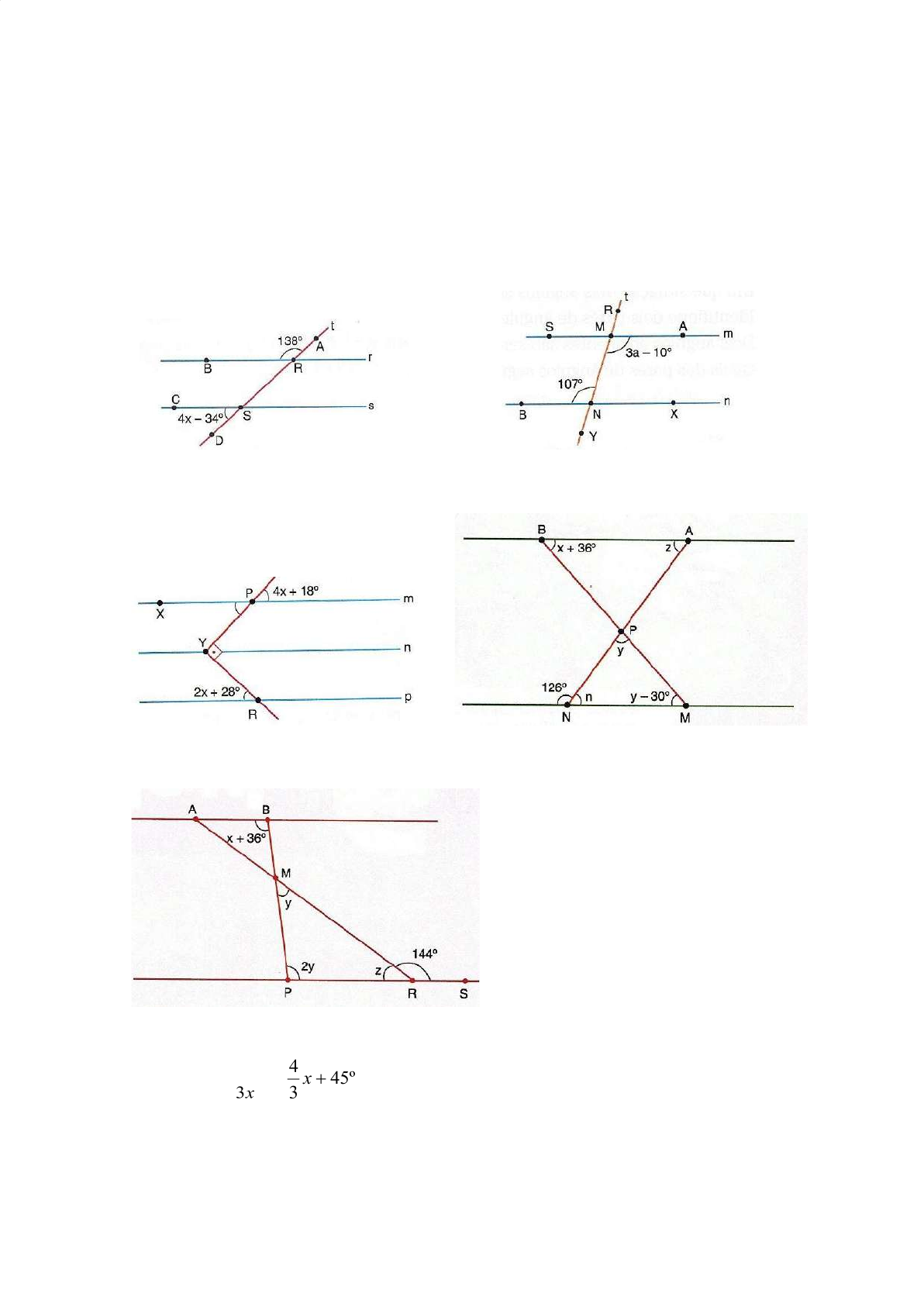 RETAS PARALELAS E TRANSVERSAIS Prof CLAUDIO - bimestre I 1) Na figura seguinte, há um feixe de retas paralelas cortado por uma ou duas transversais. Calcule o valor das incógnitas x, y, z, n, a: a) b) c) d) e) 2) Duas retas paralelas, cortadas por uma transversal, determinam ângulos alternos externos cujas medidas são expressas, em graus, por e . 3)Calcule a medida de cada um desses ângulos. 4)Nas figuras seguintes, determine as medidas dos ângulos dos triângulos: 5) Na figura, as Ruas Alexandre Nanine e João Turra são paralelas, e as Avenidas 1, 2 e 3 são transversais a elas. Calcule os valores de x, a, y e b. 6) A figura mostra como uma desenhista procede para observar o vaso que quer desenhar. O lápis é colocado paralelamente ao objeto e serve para comparar as dimensões. Podemos representar alguns elementos da figura pelas retas paralelas r e s e as transversais t e v. Agora, calcule os valore de x e y. 7) Determine as medidas x, y e z, em grau. Considere : r//s u e v as retas transversais 8) Sabendo que as retas r e s são paralelas, determine o valor de x em cada caso: 9) Observe a figura e classifique as afirmações em V ( verdadeira) ou F (falsa). a) ( ) Os ângulos e são correspondentes e, portanto, congruentes. b) ( ) Os ângulos e são alternos internos e, portanto, suplementares. c) ( ) Os ângulos e são congruentes , pois são alternos externos. d) ( ) Os ângulos e são suplementares , pois são colaterais externos. e) ( ) Os ângulos e são colaterais internos e, portanto, congruentes. 10) O suplemento do complemento de um ângulo excede a terça parte do complemento do dobro desse ângulo em 85º.? 11) O suplemento do triplo do complemento da metade de um ângulo é igual ao triplo do complemento desse ângulo. Determine o ângulo. GABARITO 1) a) X = 19o b) a = 39o c) x =7,3o ou 7o 18’ d) n = 54o, y = 78o, z = 54o, x = 12o e) z = 36o y = 48o 2) 81o 3) a = 20º b = 70º x = 90º 4) a) x = 45o; ang. (45, 100, 35) b) x = 28o; ang. ( 96, 34) c) x = 81o; ang. ( 42, 48,90) 5) x = 50o, a = 120o, y = 137o e b = 12o 6) x = 78o e y = 114o 7) x= 36o, y = 64o, z = 116o 8) a) X = 42o b) x = 45o c) x = 52o d) x = 42o e) x = 70o f)x = 25o 9) a)V b) F c) V d) V e) F 10) 180 - (90 – x) = 1:3 ( 90 – 2x) + 85 90 + x = 30 +85 – 2x:3 5x:3 = 115 – 90 5x = 25 . 3 5x = 75 x = 15 11) [ 180° - 3*( 90° - (x/2) ] = 3*( 90° - x ) [ 180° - 270° + (3/2)x ] = 270° - 3x (3/2)x + 3x = 270° + 90° 3x + 6x = 720° 9x = 720 x = 80°