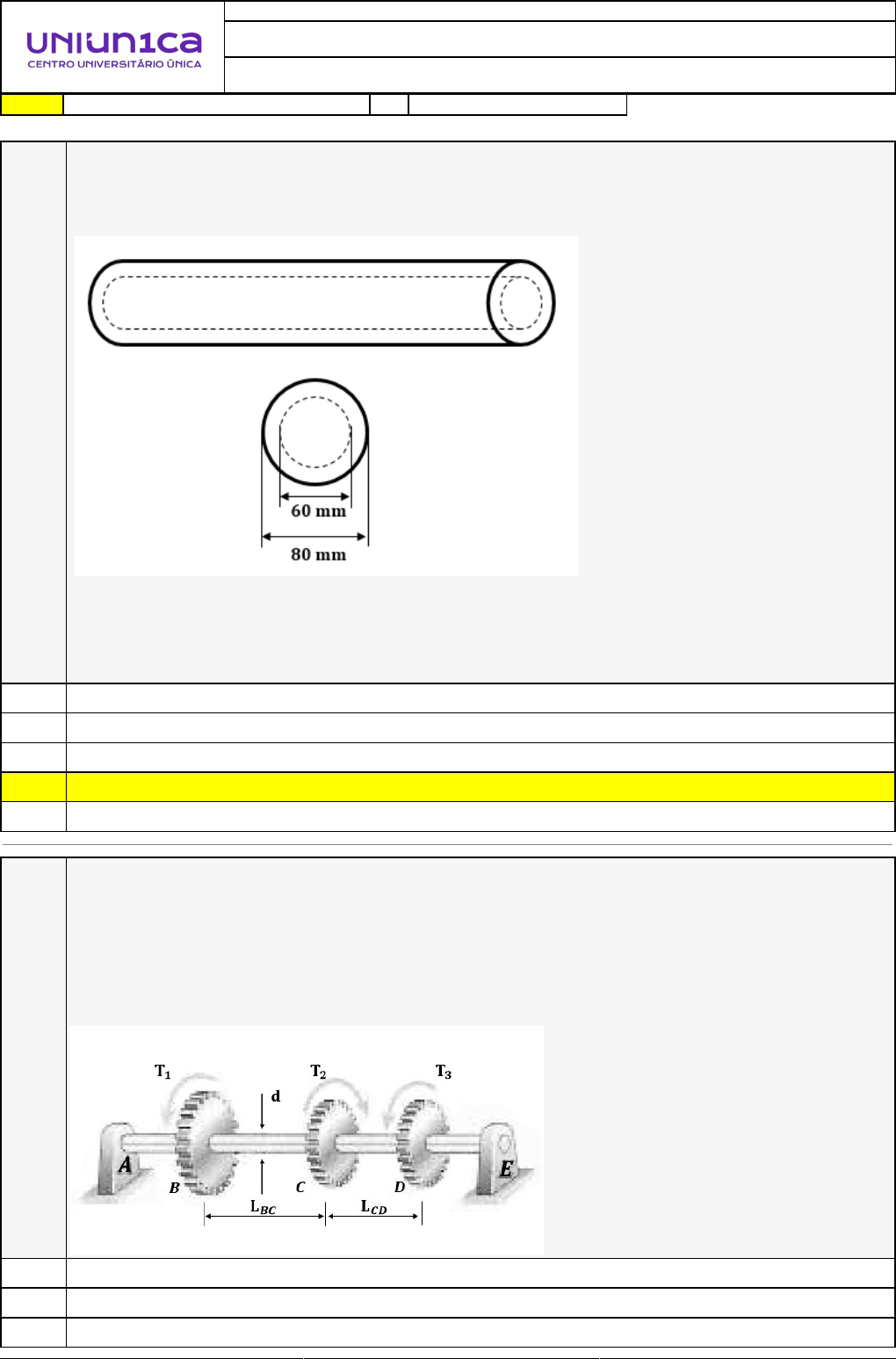 REVISÃO DE SIMULADO Nome: Disciplina: Mecânica dos Sólidos Respostas corretas são marcadas em amarelo X Respostas marcardas por você. Questão 001 (Adaptada de BEER, 1995). Um tubo circular com um diâmetro externo de 80 mm e um diâmetro interno de 60 mm está submetido a um torque T=4,0 kNm conforme a figura abaixo. O tubo é feito de uma liga de alumínio 7075-T6. Determine a tensão de cisalhamento máxima atuante no tubo. τmáx=58,2 MPa τmáx=5,82 MPa τmáx=582,6 MPa τmáx=32,4 GPa τmáx=37,8 GPa A) τmáx=32,4 GPa B) τmáx=582,6 MPa C) τmáx=37,8 GPa X D) τmáx=58,2 MPa E) τmáx=5,82 MPa Questão 002 (Adaptado de J. M. GERE, 2009). Um eixo sólido ABCD, tendo diâmetro d=30 mm, gira livremente em mancais nos pontos A e E. O eixo é comandado pela engrenagem em C, que aplica um torque T2=450Nm nadireção ilustrada na figura. As engrenagens B e D são giradas pelo eixo e têm torques de resistência T_1=275 Nm e T3=175 Nm, respectivamente, agindo na direção oposta ao torque T2. Os segmentos BC e CD têm comprimentos LBC=500 mm e LCD=400 mm, respectivamente e o módulo de cisalhamento G=80 GPa. Determine a tensão de cisalhamento máxima em cada parte do eixo entre as engrenagens B e D. A) τBC=66,3 MPa; τCD=45,0 MPa B) τBC=6,63 MPa; τCD=33,0 MPa C) τBC=5,19 MPa; τCD=45,0 MPa 22/10/2024 17:30:27 1/4 X D) τBC=51,9 MPa; τCD=33,0 MPa E) τBC=519 MPa; τCD=45,0 MPa Questão 003 (Adaptada de BEER, 1995). Determinar o torque T que causará uma tensão de cisalhamento máxima de 45 MPa no cilindro vazado de aço, como indicado na figura abaixo. Qual a máxima tensão de cisalhamento causada pelo mesmo torque T, em um cilindro maciço de mesma área de secão transversal. A) T=61,4 kNm; τmáx=8,72 Mpa B) T=6,14 kNm; τmáx=2,56 Mpa C) T=517 kNm; τmáx=25,6 Mpa D) T=51,7 kNm; τmáx=256 Mpa X E) T=5,17 kNm; τmáx=87,2 Mpa Questão 004 Um eixo circular vazado de aço cilíndrico tem comprimento L = 2 m e diâmetros interno e externo iguais a 30 e 50 mm, respectivamente. Sabendo que a tensão de cisalhamento não deve exceder 110 MPa, qual eÌÂ□ o valor mínimo correspondente da tensão de cisalhamento no eixo circular? Autor (2019) A) τmin = 76Mpa B) τmin = 36Mpa C) τmin = 66Mpa D) τmin = 94Mpa X E) τmin = 6Mpa 22/10/2024 17:30:27 2/4 Questão 005 (Adaptada de BEER, 1995). Um eixo circular vazado de aço tem comprimento L=1,5 m e diâmetros interno externo respectivamente de 40 e 60 mm. Qual é o maior momento de torção que pode ser aplicado ao eixo, para que as tensões de cisalhamento não excedam a 120 MPa? Qual o valor mínimo da tensão de cisalhamento para esse caso? A) T=408,0 kNm e τ=80 MPa B) T=2,04 kNm e τ=60 MPa C) T=40,8 kNm e τ=60 MPa D) T=2,04 kNm e τ=70 MPa X E) T=4,08 kNm e τ=80 MPa Questão 006 Na figura abaixo, temos uma junta de dupla superposição em aço. Considerando que os elementos são finos e que a porca não está muito apertada, podemos desprezar o atrito entre os elementos. Sendo os elementos finos podemos desprezar também o momento criado pela força F. Neste caso, a qual tipo de tensão a área da seção transversal do parafuso e a superfície de fixação entre os elementos estão principalmente sendo solicitadas? Autor (2019) A) Tensão de compressão. B) As estruturas listadas não estão sendo submetidas a nenhum tipo de tensão. X C) Tensão de cisalhamento duplo. D) Tensão normal. E) Pressão axial. Questão 007 .(Adaptada de BEER, 1995). O eixo circular BC é vazado, e tem diâmetros de 90 mm e 120 mm, respectivamente interno externo. Os eixos AB e CD são maciços, com diâmetro d. Determinar, para o carregamento indicado: (a) o valor máximo e o valor mínimo da tensão de cisalhamento no eixo BC (b) qual o diâmetro necessário nos eixos AB e CD se a tensão admissível no material é 65 MPa. A) (a) τmáx=8,62 MPa; τmín=68,MPa (b) d=7,78 mm B) (a) τmáx=36,7 MPa; τmín=64,MPa (b) d=25,6 mm C) (a) τmáx=0,862 MPa; τmín=68,MPa (b) d=25,6 mm X D) (a) τmáx=86,2 MPa; τmín=64,MPa (b) d=77,8 mm E) (a) τmáx=3,67 MPa; τmín=68,MPa (b) d=25,6 mm Questão 008 A) θBC=-0,0216 rad; θCD=0,110°; θBD=-0,016 rad B) θBC=-2,16 rad; θCD=0,0110 rad; θBD=-0,06 rad C) θBC=-2,16 rad; θCD=0,25°; θBD=-0,0106 rad D) θBC=0,0216 rad; θCD=0,30 rad; θBD=-10,6 rad X E) θBC=-0,0216 rad; θCD=0,0110 rad; θBD=-0,0106 rad image3.jpeg image4.jpeg image5.jpeg image6.jpeg image7.jpeg image8.jpeg image9.jpeg image1.png image2.png
