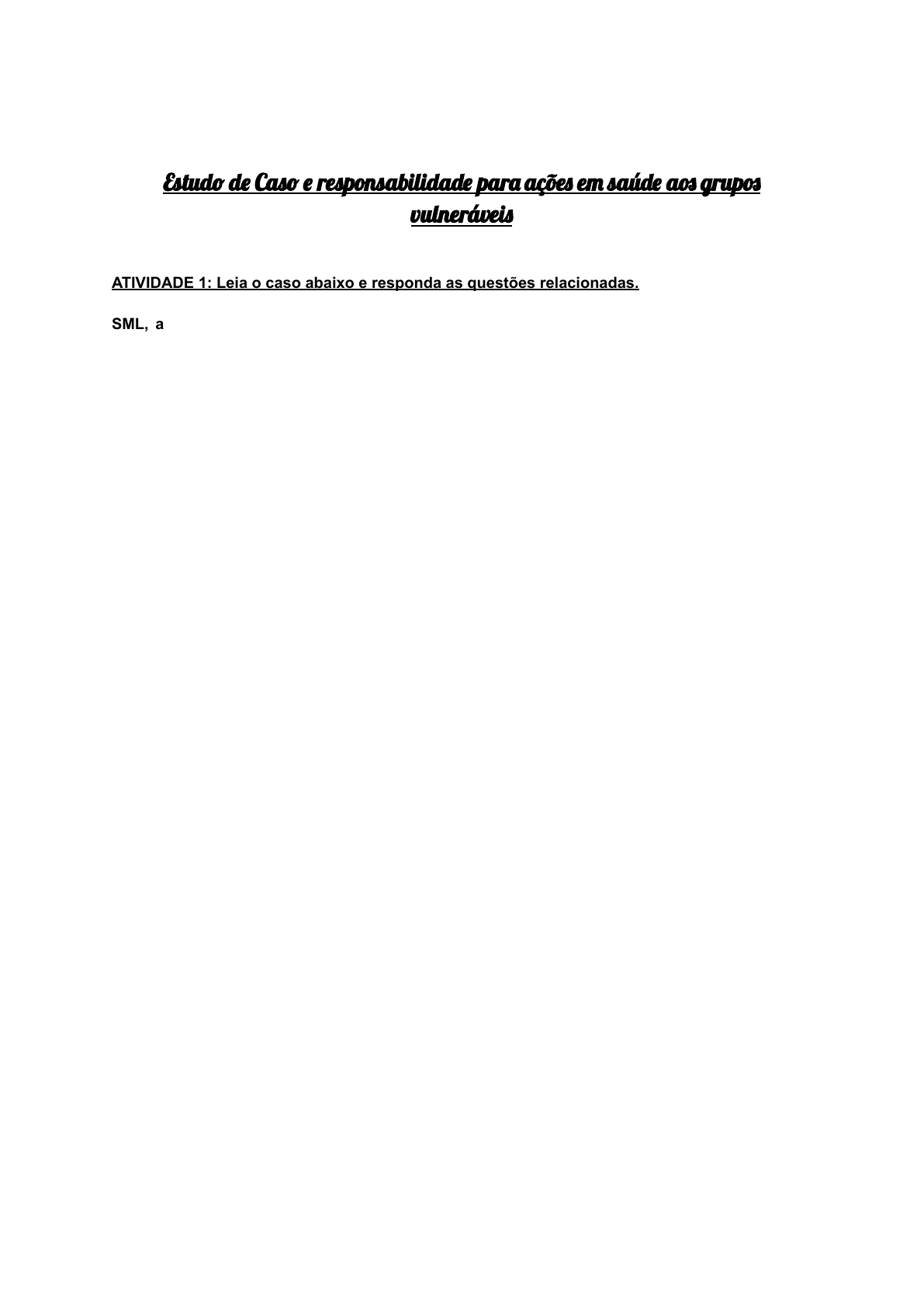 Estud� d� Cas� � responsabilidad� par� açõe� e� saúd� a� grup� vulnerávei� ATIVIDADE 1: Leia o caso abaixo e responda as questões relacionadas. SML, adolescente de 17 anos, estudante do ensino médio, compareceu à Unidade Básica de Saúde para consulta de enfermagem em ginecologia. Queixas principais: DUM há quase três meses. Queixa de náusea e vômito pela manhã, com redução da frequência alimentar e dificuldade para dormir. Relata dispareunia e disúria. Anamnese: filha de pais separados, renda familiar de 1,5 salários-mínimos, reside na periferia da cidade, frequenta a escola com pouca regularidade. Nega antecedentes patológicos familiares e pessoais. Menarca aos 11 anos, coito aos 15 anos. Total de 4 parceiros sexuais. Tem parceiro fixo, vida sexual ativa, não utiliza uso de métodos contraceptivos hormonais, refere uso esporádico de preservativo masculino e por vezes pratica coito interrompido, acredita que assim previne uma gestação inesperada. Não expressa preocupação em relação às IST 's. Refere que ama muito o seu namorado, Ricardo, de 19 anos, um garoto que não estuda e foi colocado para fora de casa quando seu pai descobriu que estava usando drogas ilícitas. Relata que apesar dos problemas do namorado, confia muito nele. Ao exame físico: consciente, orientada, deambulando sem dificuldade, acianótica, anictérica, eupneica, afebril, normocárdica, normotensa, mucosas coradas e hidratadas, MV+ s/ RA, BRNF 2T s/s, abdome plano, ruídos hidroaéreos diminuídos e discreto edema em membros inferiores (1+/4+). Pelos pubianos aparados, presença de verrugas genitais, vulva violácea, períneo íntegro, sem cicatrizes. Ao exame especular: canal vaginal íntegro, hiperemiado, secreção amarelo-esverdeado, de aspecto bolhoso e odor fétido. Colo uterino hiperemiado. A.Considerando o caso acima, faça o levantamento dos problemas de enfermagem. Problemas de enfermagem: Foi relatado pela adolescente SML, 17 anos que a sua DUM foi há quase 3 meses, refere náuseas e vômito pela manhã, redução de frequência alimentar e insônia, dispareunia e disúria, edema em membros inferiores, verrugas genitais, canal da vagina hiperemiado, secreção amarelo-esverdeado com aspecto bolhoso e odor fétido, colo uterino hiperemiado, coito interrompido, uso esporádico de preservativo masculino nas relações. Namorado é dependente químico. Não apresenta antecedentes familiares. B.Elabore 5 diagnósticos de enfermagem - NANDA com título, fatores relacionados e características definidoras. ● Domínio: 2 – Classe 1: Nutrição Desequilibrada: Menor do que as necessidades corporais. Características definidoras: Ruídos intestinais hiperativos, ingestão de alimentos menor que a ingestão diária recomendada (IDR) Fatores relacionados: Aversão a alimento, conhecimento inadequado sobre as exigências nutricionais, suprimento inadequado de alimentos. ● Domínio 3 – Classe 1: Eliminação urinária prejudicada Características definidoras: Disúria Fatores relacionados: Fator ambiental alterado, hábitos de higiene íntima ineficazes. ● Domínio 8 – Classe 3: Processo perinatologia ineficaz Características definidoras: Comportamento de vínculo inadequado, cuidado pré-natal inadequado, falha em utilizar apoio social, manejo ineficaz de sintomas desagradáveis na gestação, preparo inadequado do bebê ainda não nascido. Fatores relacionados: Ambiente inseguro, apoio social inadequado, baixa confiança materna, conhecimento inadequado sobre o processo perinatológico, cuidado pré-natal inadequado, desnutrição materna, modelo de comportamento materno/paterno inadequado, plano de nascimento não realista, preparo mental inadequado para paternidade/maternidade. ● Domínio 4 – Classe 1: Distúrbio no padrão de sono Características definidoras: Despertar não intencional, dificuldade para iniciar o sono, dificuldade para manter o sono, expressa insatisfação com o sono. Fatores relacionados: Distúrbios ambientais, perturbação causada pelo parceiro de sono, privacidade insuficiente. ● Domínio 11 – Classe 1: Risco de infecção Características definidoras: Edema em membros inferiores, verrugas genitais, canal da vagina hiperemiado, secreção amarelo-esverdeado com aspecto bolhoso e odor fétido, colo uterino hiperemiado. Fatores relacionados: Acesso inadequado a equipamento de proteção individual, adesão inadequada a recomendações de saúde pública, conhecimento inadequado para evitar exposição a patógenos, desnutrição, higiene inadequada. C. A partir dos diagnósticos de enfermagem NANDA, prescreva cuidados específicos a esses diagnósticos, tendo como referência a literatura NIC. Com base nos diagnósticos, deve-se orientar a paciente quanto à ingestão hídrica adequada, bem como consumir alimentos que promovam uma diminuição das náuseas; promover uma escuta qualificada, orientando quanto à importância de um ambiente tranquilo e confortável na hora de repousar, a fim de proporcionar um sono restaurador e consequentemente uma melhor qualidade de vida. Os cuidados com as eliminações urinárias devem oferecer orientação a essa paciente sobre a importância da ingestão hídrica adequada, bem como a correta higienização íntima e estimular o autocuidado e solicitar exames laboratoriais. Em relação à nutrição, o enfermeiro deve orientar sobre a importância da alimentação para a manutenção da saúde, incluir frutas e verduras na dieta bem como alimentar-se com pequenas porções várias vezes ao dia e fazer encaminhamento ao nutricionista. Já ao risco de infecção, a paciente deve ser orientada quanto à prática sexual segura, orientar higienização íntima adequada e uso de preservativo para prevenção de infecção e doenças sexualmente transmissíveis, realizar exame citológico do colo do útero, solicitar exames laboratoriais como hemograma, urina e papanicolau.