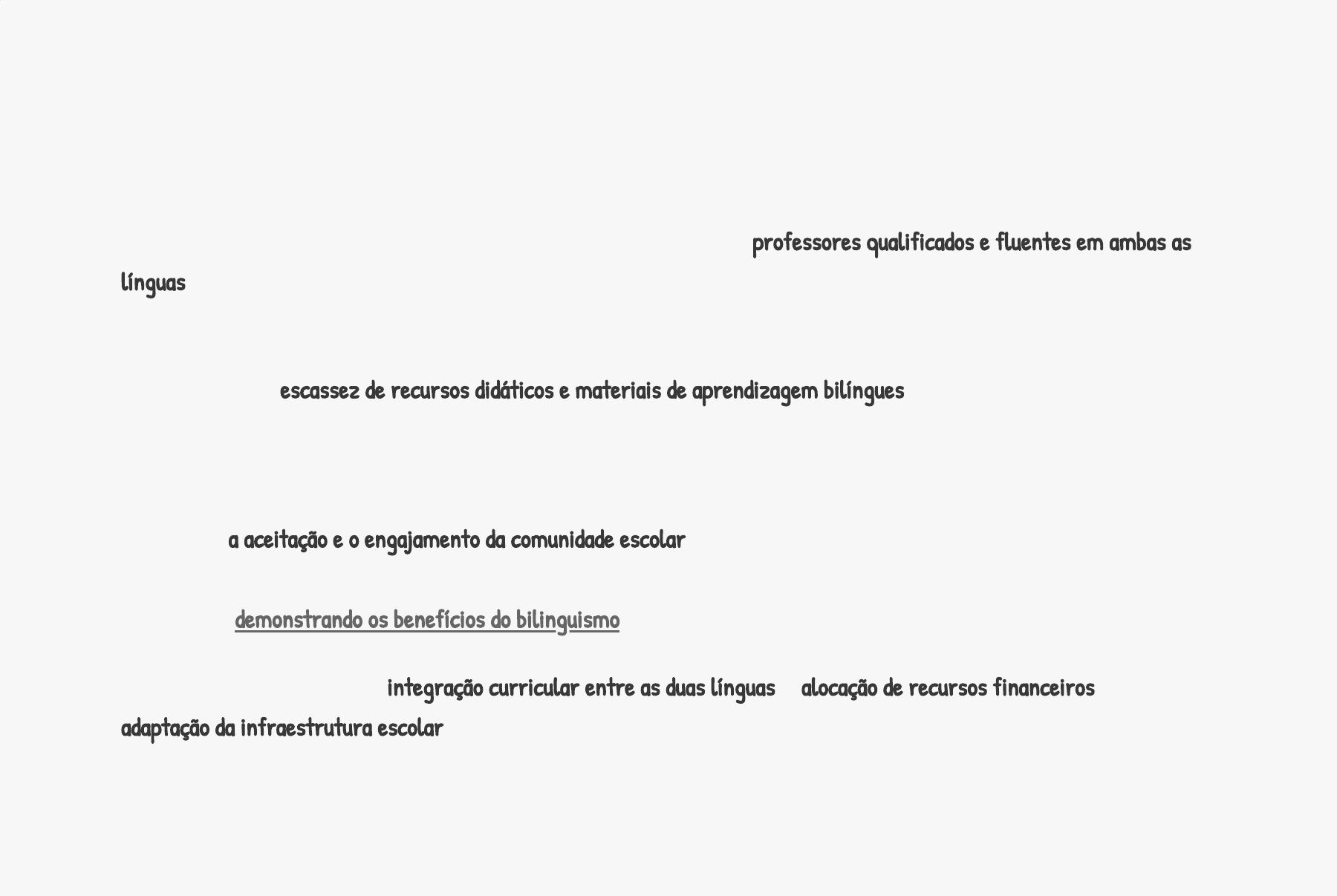 QUAIS Desafios da Implementação do Bilinguismo? Implementar um programa de educação bilíngue enfrenta diversos desafios que precisam ser cuidadosamente abordados para garantir o sucesso. Um dos principais obstáculos é a escassez de professores qualificados e fluentes em ambas as línguas, especialmente em determinadas regiões. Isso exige um investimento significativo em programas de formação e capacitação docente, visando desenvolver as competências linguísticas e pedagógicas necessárias. Outro desafio é a escassez de recursos didáticos e materiais de aprendizagem bilíngues, que muitas vezes precisam ser desenvolvidos do zero. Isso requer uma colaboração estreita entre educadores, linguistas e especialistas em design instrucional para criar conteúdo de alta qualidade, alinhado com os objetivos curriculares e as necessidades dos alunos. Além disso, a aceitação e o engajamento da comunidade escolar, incluindo pais, alunos e gestores, são cruciais para o sucesso da implementação. É necessário um esforço constante de comunicação, sensibilização e envolvimento dessa comunidade, demonstrando os benefícios do bilinguismo e garantindo seu apoio ao longo do processo. Desafios adicionais incluem a integração curricular entre as duas línguas, a alocação de recursos financeiros e a adaptação da infraestrutura escolar para acomodar as necessidades específicas de um programa bilíngue. Abordar esses obstáculos de forma planejada e estratégica é fundamental para garantir uma implementação bem-sucedida e sustentável do bilinguismo na educação. https://www.educabras.com.br/blog/bilinguismo-escolar COMO E A Formação de Professores Bilíngues? A formação de professores bilíngues é fundamental para garantir a qualidade e a efetividade da educação bilíngue. Esses profissionais devem possuir não apenas domínio das duas línguas de instrução, mas também uma sólida compreensão das melhores práticas pedagógicas e das estratégias de ensino específicas para o desenvolvimento bilíngue dos alunos. Proficiência Linguística: Os professores bilíngues devem demonstrar proficiência avançada nas duas línguas de ensino, com capacidade de se comunicar fluentemente e utilizar adequadamente os recursos gramaticais, lexicais e pragmáticos de cada idioma. 1. Competência Pedagógica: Além do domínio linguístico, os docentes precisam desenvolver habilidades didáticas específicas para mediar a aprendizagem em ambientes bilíngues, como técnicas de instrução integrada de conteúdo e língua, avaliação diferenciada e estratégias de suporte à aquisição da segunda língua. 2. Compreensão do Bilinguismo: Os professores bilíngues devem ter conhecimento aprofundado sobre as teorias, os processos e os desafios do desenvolvimento bilíngue, a fim de criar experiências de aprendizagem significativas e adaptadas às necessidades dos alunos. 3. Desenvolvimento Profissional Contínuo: A formação bilíngue não se encerra na graduação, é preciso que os docentes mantenham-se atualizados sobre as pesquisas, as metodologias e as inovações na área, participando de capacitações, congressos e trocando experiências com a comunidade de educadores bilíngues. 4. Ao investir na formação de professores bilíngues qualificados, as escolas e sistemas de ensino garantem que os alunos tenham acesso a um ensino de excelência, que valoriza a diversidade linguística e cultural, e promove o desenvolvimento integral dos estudantes.