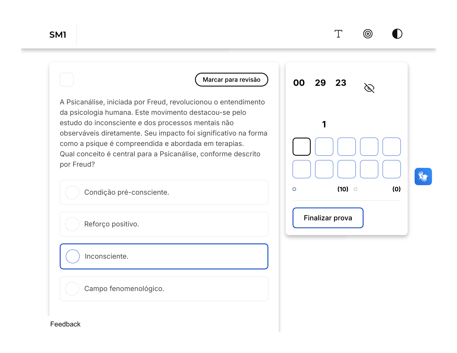 A B C D 1 A Psicanálise, iniciada por Freud, revolucionou o entendimento da psicologia humana. Este movimento destacou-se pelo estudo do inconsciente e dos processos mentais não observáveis diretamente. Seu impacto foi significativo na forma como a psique é compreendida e abordada em terapias. Qual conceito é central para a Psicanálise, conforme descrito por Freud? Condição pré-consciente. Reforço positivo. Inconsciente. Campo fenomenológico. hora : min : seg Ocultar Questão de 10 Respondidas Em branco 1 2 3 4 5 6 7 8 9 10 Psicologia Aplicada À Saúde Feedback Firefox https://estacio.saladeavaliacoes.com.br/prova/6722aa71286b57435440c318/ 1 of 12 30/10/2024, 19:12 E A B Condicionamento clássico. 2 �CESPE / CEBRASPE/2017 - adaptada) De acordo com as contribuições freudianas, o sujeito seria determinado por seu inconsciente. Sobre o aparelho psíquico, analise as asserções I e II. I. O aparelho psíquico seria constituído por três instâncias: id, ego e superego. II. O ego é o responsável pela mediação entre as moções advindas do id, as exigências do superego e a realidade externa. Marque a alternativa que apresenta a relação correta entre as asserções I e II. As asserções I e II são verdadeiras e a asserção II é uma justificativa para a asserção I. As asserções I e II são verdadeiras, mas a asserção II não é uma justificativa para a asserção I. Feedback Firefox https://estacio.saladeavaliacoes.com.br/prova/6722aa71286b57435440c318/ 2 of 12 30/10/2024, 19:12 C D E A B C A asserção I é verdadeira e a asserção II é falsa. A asserção I é falsa e a asserção II é verdadeira. As asserções I e II são falsas. 3 A Psicossomática estuda a relação da nossa mente com as doenças corporais. Sobre o conceito de psicossomática é afirmar: Não leva em conta os aspectos sociais do indivíduo. Trata a doença e não o sujeito. Nasce com Hipócrates, na Antiga Grécia. Feedback Firefox https://estacio.saladeavaliacoes.com.br/prova/6722aa71286b57435440c318/ 3 of 12 30/10/2024, 19:12 D E A B C É praticada apenas por médico. Só é possível de ser realizada em ambiente hospitalar. 4 O Behaviorismo, proposto por John B. Watson, centrou-se na observação do comportamento como principal objeto de estudo da psicologia. Esta abordagem objetiva e experimental distanciou-se das teorias baseadas em processos internos inobserváveis, focando em comportamentos mensuráveis e observáveis. Qual é o principal foco de estudo do Behaviorismo? Processos cognitivos. Comportamento observável. Estruturas mentais. Feedback Firefox https://estacio.saladeavaliacoes.com.br/prova/6722aa71286b57435440c318/ 4 of 12 30/10/2024, 19:12 D E Experiências subjetivas. Inconsciente. 5 Do ponto de vista epistemológico, é possível abordar a história da ciência psicológica, que começa com Wundt e James e seus precursores e os sistemas que deles emergiram. Nesse sentido, é importante que conhecimentos fundamentados na laicidade da ciência não se confundam com os conhecimentos dogmáticos da religião. Diante da incidência do discurso religioso, a Psicologia sofre tensionamentos internos, e os conselhos profissionais da área tem se encontrado na posição de alvo de ofensivas contra algumas normativas, frente à reivindicação de uma ¿Psicologia cristã¿. Em meio a este cenário complexo, os Conselhos de Psicologia têm produzido marcos de referência para a defesa da laicidade e recusa de fundamentalismos, sendo atualmente atores estratégicos na defesa da democracia brasileira. Nesse contexto, avalie as afirmações a seguir. I. O debate sobre laicidade, democracia e Psicologia tem refletido o esforço epistemológico em reafirmar a autonomia da Psicologia como ciência e profissão. Feedback Firefox https://estacio.saladeavaliacoes.com.br/prova/6722aa71286b57435440c318/ 5 of 12 30/10/2024, 19:12 A B C D E II. O psicólogo, segundo o Código de Ética Profissional, deve contemplar a diversidade que configura o exercício de sua profissão e, desse modo, deve relativizar o princípio da laicidade. III. O desenvolvimento da Psicologia, em termos epistemológicos e de suas práticas, tem sido orientado pelas transformações e demandas sociais. IV. A Psicologia, como ciência e profissão, deve ser crítica e reflexiva e, portanto, contrária a qualquer posicionamento fundamentalista. É correto apenas o que se afirma em: I e IV. II e III. II e IV. I, II e III. I, III e IV. Feedback Firefox https://estacio.saladeavaliacoes.com.br/prova/6722aa71286b57435440c318/ 6 of 12 30/10/2024, 19:12 A B C D E 6 O Construtivismo, uma abordagem psicológica influente, defende que o conhecimento é construído pelo aprendiz em interação com o ambiente. Esta teoria tem sido fundamental na educação, destacando a importância da experiência ativa do aprendiz na construção do conhecimento. Qual é o princípio chave do Construtivismo na educação? Aprendizagem passiva. Reforço positivo. Construção ativa do conhecimento. Comportamento observável. Inconsciente. Feedback Firefox https://estacio.saladeavaliacoes.com.br/prova/6722aa71286b57435440c318/ 7 of 12 30/10/2024, 19:12 A B C D 7 �FCC/2019 - adaptada) No Manual de Diagnóstico e Estatístico de Transtornos Mentais �DSM�V) as patologias são abordadas no capítulo de Sintomas Somáticos e outros Transtornos Relacionados, entre eles estão o Transtorno de Ansiedade de Doença, o Transtorno Conversivo e o Transtorno Factício. Sobre o Transtorno Factício, marque a alternativa correta. O surgimento na infância ou no início da adolescência e o ajustamento às normas sociais na vida adulta. Comportamentos relacionados a falsidade e a manipulação nas relações sociais, além de um padrão difuso de indiferença aos outros. Uma atitude comportamental manipuladora aprendida e aprimorada socialmente, que não sofre influência genética. Comportamento relacionado a fingir estar doente, fingindo ter sintomas fís