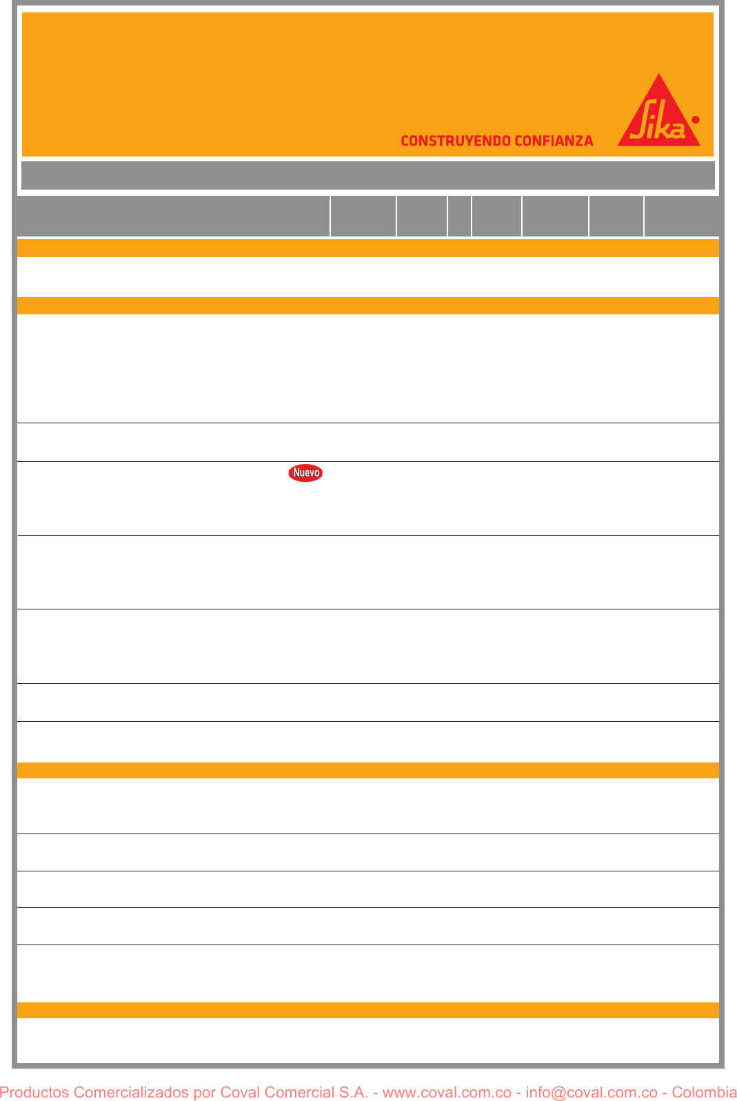 LISTA DE PRECIOS MARZO 7 DE 2014 SIKA COLOMBIA S.A.1 PRODUCTO $ UN EMPAQUE IVA 16% TOTALCODIGO CANTIDAD UN Sika®-2 Sellador de filtraciones. Sika®-1 Impermeabilizante integral para morteros y concretos. (NUEVA TECNOLOGIA) Sika®-3 Acelerante para morteros. SikaBond PVA Emulsión polimérica que mejora la adherencia y la calidad de los morteros cementosos y los estucos. SikaLátex® Aditivo adherente para morteros. Sika®ViscoBond Aditivo tipo látex para mejorar adherencia, impermeabilizar, plastificar y mejorar resistencias en morteros y concretos. SikaTard®E Retardador - reductor de agua para morteros de larga vida. Sikanol®M Estabilizador para morteros de larga vida. Sikaset®L Acelerante de fraguado y resistencia para concretos. Plastocrete®169 HE Plastificante - acelerante para concretos. Sikafluid® Fluidificante para mezclas de concreto. Sikafiber®AD Micro fibra de polipropileno para concreto y mortero. Plastocrete®DM Impermeabilizante para concreto - plastificante. Antisol®Blanco Curador para concreto y mortero, con base acuosa. ADITIVOS PARA CEMENTOS ADITIVOS PARA MORTEROS ADITIVOS Y ADICIONES PARA CONCRETO 111000 111001 110208 110200 110201 110202 110204 110240 111101 110708 110701 110702 110740 110406 110401 110402 110440 110600 110601 110602 110640 114240 114740 105001 105002 105040 105440 100802 100840 142657 103001 103002 103040 140002 140040 2.5 5.5 1.0 2.0 4.0 20.0 60.0 220.0 5.0 1.0 4.0 20.0 200.0 0.25 4.5 20.0 200.0 1.0 3.2 19.0 200.0 230.0 200.0 5.0 25.0 230.0 230.0 25.0 230.0 1.0 4.5 20.0 230.0 20.0 200.0 kg kg kg kg kg kg kg kg kg kg kg kg kg kg kg kg kg kg kg kg kg kg kg kg kg kg kg kg kg kg kg kg kg kg kg CURADORES Y DESENCOFRANTES 11,750 10,600 7,300 7,200 7,050 5,700 5,400 3,380 7,000 7,000 6,365 5,455 4,375 29,500 18,200 16,900 14,100 17,000 15,000 14,200 11,450 5,000 3,250 7,950 6,925 4,240 3,600 4,880 3,350 12,800 7,400 6,860 4,500 3,500 2,800 29,375 58,300 7,300 14,400 28,200 114,000 324,000 743,600 35,000 7,000 25,460 109,100 875,000 7,375 81,900 338,000 2,820,000 17,000 60,000 269,800 2,290,000 1,150,000 650,000 39,750 173,125 975,200 828,000 122,000 770,500 12,800 33,300 137,200 1,035,000 70,000 560,000 4,700 9,328 1,168 2,304 4,512 18,240 51,840 118,976 5,600 1,120 4,074 17,456 140,000 1,180 13,104 54,080 451,200 2,720 9,600 43,168 366,400 184,000 104,000 6,360 27,700 156,032 132,480 19,520 123,280 2,048 5,328 21,952 165,600 11,200 89,600 34,075 67,628 8,468 16,704 32,712 132,240 375,840 862,576 40,600 8,120 29,534 126,556 1,015,000 8,555 95,004 392,080 3,271,200 19,720 69,600 312,968 2,656,400 1,334,000 754,000 46,110 200,825 1,131,232 960,480 141,520 893,780 14,848 38,628 159,152 1,200,600 81,200 649,600 L I S T A D E PRECIOS CONSTRUCCION Sugerida al Público - Vigente Marzo 7 de 2014 Productos Comercializados por Coval Comercial S.A. - www.coval.com.co - info@coval.com.co - Colombia 2 140102 140140 140202 140240 140302 140340 140502 140540 140502-10 140540-10 128066 128066-01 128065 128065-01 123860 123862 123960 123962 124260-01 124262-01 124264-01 124260-02 124262-02 124264-02 124060 124062 124064 124160 124162 124164 127365 122580 122064 122164 642266-07 126564 126064 125073 20.0 200.0 16.0 170.0 20.0 210 15.0 170.0 20.0 200.0 25.0 25.0 50.0 50.0 2.0 10.0 2.0 10.0 2.0 10.0 25.0 2.0 10.0 25.0 2.0 10.0 25.0 2.0 10.0 25.0 50 80.0 30.0 30.0 30.0 25.0 25.0 4.0 kg kg kg kg kg kg kg kg kg kg kg kg kg kg kg kg kg kg kg kg kg kg kg kg kg kg kg kg kg kg kg kg kg kg kg kg kg kg CURADORES Y DESENCOFRANTES MORTEROS LISTOS MORTEROS LISTOS MODIFICADOS LISTA DE PRECIOS MARZO 7 DE 2014 SIKA COLOMBIA S.A. 4,100 3,900 9,530 6,920 6,000 5,500 12,000 9,460 5,720 5,610 1,390 1,770 1,220 1,670 2,900 2,700 3,790 3,590 1,850 1,720 1,380 1,550 1,390 1,112 3,770 3,270 2,670 3,160 2,800 2,050 750 885 2,320 1,870 760 2,900 4,500 9,000 82,000 780,000 152,480 1,176,400 120,000 1,155,000 180,000 1,608,200 114,400 1,122,000 34,750 44,250 61,000 83,500 5,800 27,000 7,580 35,900 3,700 17,200 34,500 3,100 13,900 27,800 7,540 32,700 66,750 6,320 28,000 51,250 37,500 70,800 69,600 56,100 22,800 72,500 112,500 36,000 13,120 124,800 24,397 188,224 19,200 184,800 28,800 257,312 18,304 179,520 5,560 7,080 9,760 13,360 928 4,320 1,213 5,744 592 2,752 5,520 496 2,224 4,448 1,206 5,232 10,680 1,011 4,480 8,200 6,000 11,328 11,136 8,976 3,648 11,600 18,000 5,760 95,120 904,800 176,877 1,364,624 139,200 1,339,800 208,800 1,865,512 132,704 1,301,520 40,310 51,330 70,760 96,860 6,728 31,320 8,793 41,644 4,292 19,952 40,020 3,596 16,124 32,248 8,746 37,932 77,430 7,331 32,480 59,450 43,500 82,128 80,736 65,076 26,448 84,100 130,500 41,760 PRODUCTO $ UN EMPAQUE IVA 16% TOTALCODIGO CANTIDAD UN Antisol®Blanco Pigmentado Curador para concreto y mortero base agua con pigmento reflectivo. Antisol®Rojo Curador para concreto y mortero, con base solvente. Antisol®Rojo Base Agua Curador para concreto y mortero, con base agua. Separol® Desformaleteante premium. Separol®N Desformaleteante económico para fácil desencofre de concreto. SikaCeram®B.A. Gris Adhesivo para enchapes de baja absorción. Blanco Gris Blanco Binda®Boquilla Color Emboquillador para enchapes. Colores: Blanco y Beige Binda®Boquilla Acrílico Emboquillador con látex, en color, para rellenar juntas entre enchapes. Colores: Blanco y Beige Sika®-1 Mortero Blanco Recubrimiento impermeable Gris Sika®-101 Mortero Blanco Recubrimiento impermeable. Gris Sikalisto®Piso Mortero listo impermeable para nivelación de pisos. Sika Concrelisto RE Concreto listo fluído sin retracción. SikaGrout®-200 Relleno para nivelación y anclaje de equipos y estructuras con áreas menores a 2 m2. SikaGrout®-212 Relleno para nivelación y anclaje de equipos y estructuras con áreas mayores a 2 m2. Sikafloor®-3 Quartz Top Neutro Endurecedor superficial para pisos con base cuarzo y cemento SikaRepair 224 Mortero monocomponente para reparaciones estructurales SikaQuick 2500 Mortero de reparación monocoponente de fraguado rápido SikaTop®-Armatec