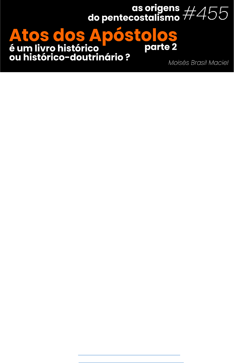 1 Youtube: www.youtube.com/c/moisesbrasilmaciel Instagram: www.instagram.com/moises.brasil.maciel INTRODUÇÃO O pesquisador do pentecostalismo Eddie Hyatt afirma que a história do pentecostalismo não é tão evidente antes do século XX, devido à rejeição dos dons espirituais por parte de historiadores mais modernos, fazendo com que os dons do Espírito Santo fossem ignorados ou tratados de maneira detrativa. Desta maneira, há dentro do pentecostalismo um desafio da legitimidade histórica devido à crítica a ele dirigida de não possuírem uma tradição histórica e, consequentemente, ser apenas um movimento periférico ao cristianismo ortodoxo. Assim, se faz necessário apresentar a história do pentecostalismo, tendo como fundamento pessoas e movimentos que contribuíram de maneira direta ou indireta na formação teológica do pentecostalismo. A questão de rejeição ao pentecostalismo por parte dos historiadores abrange também o relato histórico dentro do próprio protestantismo. Segmentos protestantes, como reformados calvinistas, batistas, luteranos, anglicanos e outros, desprezam quase que completamente os eventos que ao longo da história foram definindo a teologia pentecostal. Na maioria das vezes esta rejeição se dá pela escassez de documentos históricos do próprio pentecostalismo ou pela rejeição à própria teologia pentecostal. Esta rejeição à teologia pentecostal tem como um dos fundamentos a http://www.youtube.com/c/moisesbrasilmaciel http://www.instagram.com/moises.brasil.maciel 2 Youtube: www.youtube.com/c/moisesbrasilmaciel Instagram: www.instagram.com/moises.brasil.maciel discussão sobre ser o livro de Atos dos Apóstolos apenas um livro histórico, ou um livro histórico e doutrinário simultaneamente. Pois para aqueles que rejeitam a teologia pentecostal, o livro de Atos dos Apóstolos é um livro exclusivamente histórico, não apresentando aspectos doutrinários que deveriam ser observados pela Igreja cristã no decorrer dos séculos. Consequentemente, um dos eventos bíblicos fundamentais para o pentecostalismo, o batismo com o Espírito Santo, não é doutrinário, mas apenas um relato histórico e, por isso, não é ensinado na maioria das denominações protestantes distintas das pentecostais e neopentecostais. Contudo, por parte do pentecostalismo e suas mais diversas segmentações é defendido que Atos dos Apóstolos é simultaneamente histórico e doutrinário. ATOS: HISTÓRICO OU DOUTRINÁRIO Teólogos, intérpretes do Novo Testamento e diversos autores afirmam que Lucas, o autor de Atos dos Apóstolos, não tinha a intensão de desenvolver um propósito didático ou instrutivo na elaboração do escrito, mas, apenas um relato histórico. Por isso, para estes, quando afirmamos que queremos ser guiados pelas Escrituras pelo entendimento da obra do Espírito, devemos buscar essa orientação primeiramente nas partes didáticas, mais que nas partes históricas. As partes didáticas da Bíblia encontram-se nos ensinos de Jesus e nos sermões e escritos dos apóstolos, não nas partes puramente narrativas de Atos. Ou seja, o que é doutrinário deve ter maior relevância de ser praticado pela igreja, do que apenas uma narrativa histórica, como no caso de Atos dos Apóstolos. Esta argumentação defende a separação do que é didático (ensino) e o que é histórico (narrativa de um fato). Afirmam ainda que o processo de formular doutrinas e práticas na base de matérias históricas é hermenêutica incorreta ou ainda uma hermenêutica pragmática no lugar de uma http://www.youtube.com/c/moisesbrasilmaciel http://www.instagram.com/moises.brasil.maciel 3 Youtube: www.youtube.com/c/moisesbrasilmaciel Instagram: www.instagram.com/moises.brasil.maciel hermenêutica científica. Além disso, defendem que o Evangelho de Lucas e o livro de Atos dos Apóstolos devem estar dentro de uma separabilidade, ou seja, são dois escritos com propósitos diferentes. Por outro lado, diversos outros teólogos, intérpretes do Novo Testamento e inúmeros escritores defendem que é bastante arbitrária o pensamento de que a matéria histórica não tem valor didático. Isto é, mesmo que o escrito lucano de Atos dos Apóstolos seja uma narrativa histórica, mas não é destituída de intensões instrutivas. Esta posição afirma que o gênero literário de Atos não é meramente histórico, mas também intencionalmente teológico, ou seja, Lucas tinha a intenção de ensinar doutrina, prática e experiências cristãs. Neste sentido, o Evangelho de Lucas e o livro de Atos dos Apóstolos não são dois livros separados, mas, são realmente duas metades de uma única obra, e devem ser interpretados como uma unidade. Tanto o Evangelho de Lucas quanto Atos dos Apóstolos demonstram a intensão de ensinar doutrina e prática normativas, pois são de um mesmo autor e desenvolvido com o mesmo estilo literário. Para os que defendem o livro de Atos dos Apóstolos como histórico e doutrinária, Lucas empregava suas origens documentárias e desenvolveu sua matéria de modo semelhante aos historiadores veterotestamentários e interbíblicos. E assim fez especificamente para introduzir temas-chaves teológicos e para estabelecer, ilustrar e reforçar aqueles temas mediante episódios históricos específicos. O propósito de Lucas era didático, de catequese e instrução, e não meramente informático, ao contar a história da origem e expansão do Cristianismo. Além disso, um texto de Paulo que merece atenção nesta discussão é o seu segundo escrito a Timóteo “Toda Escritura divinamente inspirada é proveitosa para ensinar, para redarguir, para corrigir, para instruir em justiça” (2Tm 3.16 ARC). Paulo tinha em mente o Antigo Testamento, e neste mesmo Antigo Testamento estavam http://www.youtube.com/c/moisesbrasilmaciel http://www.instagram.com/moises.brasil.maciel 4 Youtube: www.youtube.com/c/moisesbrasilmaciel Instagram: www.instagram.com/moises.brasil.ma