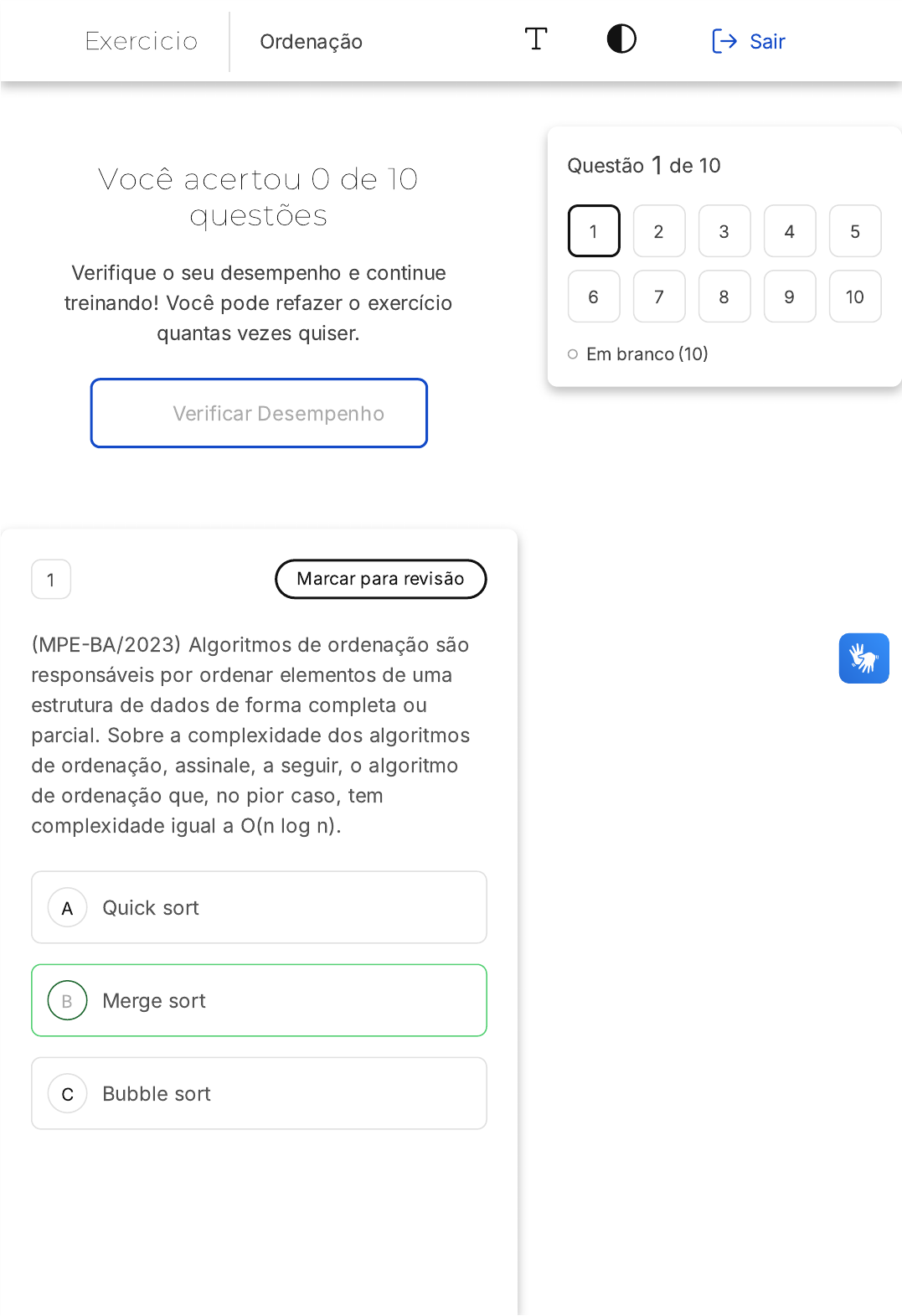 29/10/24, 23:41 https://estacio.saladeavaliacoes.com.br/exercicio/67219cd593e529c49d356b1c/gabarito/ https://estacio.saladeavaliacoes.com.br/exercicio/67219cd593e529c49d356b1c/gabarito/ 1/14 Você acertou 0 de 10 questões Verifique o seu desempenho e continue treinando! Você pode refazer o exercício quantas vezes quiser. Verificar Desempenho A B C 1 Marcar para revisão �MPE�BA/2023� Algoritmos de ordenação são responsáveis por ordenar elementos de uma estrutura de dados de forma completa ou parcial. Sobre a complexidade dos algoritmos de ordenação, assinale, a seguir, o algoritmo de ordenação que, no pior caso, tem complexidade igual a O(n log n). Quick sort Merge sort Bubble sort Questão 1 de 10 Em branco �10� 1 2 3 4 5 6 7 8 9 10 Exercicio Ordenação Sair 29/10/24, 23:41 https://estacio.saladeavaliacoes.com.br/exercicio/67219cd593e529c49d356b1c/gabarito/ https://estacio.saladeavaliacoes.com.br/exercicio/67219cd593e529c49d356b1c/gabarito/ 2/14 D E Insertion sort Selection sort Questão não respondida Opa! A alternativa correta é a letra B. Confira o gabarito comentado! Gabarito Comentado O Merge sort é um algoritmo de divisão e conquista que divide repetidamente a lista em sublistas menores, até que cada sublista contenha apenas um elemento. Em seguida, ele combina as sublistas em pares, ordenando-as ao mesmo tempo, e continua mesclando-as em sublistas maiores até que a lista esteja completamente ordenada. A complexidade do Merge sort no pior caso é O(n log n), onde "n" é o número de elementos a serem ordenados. 2 Marcar para revisão �INSTITUTO AOCP/2022 � Adaptada) A ordenação por seleção é um algoritmo de ordenação simples e intuitivo. Na ordenação por seleção, é necessário permutar o vetor. Para esse caso, o significado de ‘permutarʼ é 29/10/24, 23:41 https://estacio.saladeavaliacoes.com.br/exercicio/67219cd593e529c49d356b1c/gabarito/ https://estacio.saladeavaliacoes.com.br/exercicio/67219cd593e529c49d356b1c/gabarito/ 3/14 A B C D E substituir o vetor por chaves de ordenação rearranjar os elementos do vetor alterar os valores de um vetor A depois de ordenado em um vetor B alternar os valores de um vetor A com um vetor B ordenar os elementos do vetor A em função de um vetor B de ordenação Questão não respondida Opa! A alternativa correta é a letra B. Confira o gabarito comentado! Gabarito Comentado Ao utilizar a ordenação por seleção, é necessário realizar permutações entre os elementos do vetor, ou seja, alterar a ordem dos elementos para colocá-los na posição correta de acordo com a ordenação desejada. Durante o processo de seleção, os elementos são comparados e trocados de posição, resultando em um rearranjo dos elementos do vetor até que todos estejam na posição correta. 3 Marcar para revisão 29/10/24, 23:41 https://estacio.saladeavaliacoes.com.br/exercicio/67219cd593e529c49d356b1c/gabarito/ https://estacio.saladeavaliacoes.com.br/exercicio/67219cd593e529c49d356b1c/gabarito/ 4/14 A B C D E �FUMARC/2014 � Adaptada) Considere uma estrutura de dados do tipo vetor de tamanho 6 (seis) inicializado com as chaves abaixo: Analise a ilustração dos passos intermediários de um método de ordenação das chaves do vetor: O método de ordenação apresentado é: Ordenação por inserção Ordenação por seleção Quicksort Shellsort Mestrellasort Questão não respondida Opa! A alternativa correta é a letra B. Confira o gabarito comentado! Gabarito Comentado A ordenação por seleção é um algoritmo de ordenação que consiste em encontrar o menor valor no vetor e colocá-lo na 29/10/24, 23:41 https://estacio.saladeavaliacoes.com.br/exercicio/67219cd593e529c49d356b1c/gabarito/ https://estacio.saladeavaliacoes.com.br/exercicio/67219cd593e529c49d356b1c/gabarito/ 5/14 A B C D E primeira posição (ou o maior valor, dependendo da ordem desejada). Em seguida, encontra-se o segundo menor valor e o coloca na segunda posição, e assim por diante, repetindo o processo para os (n-1) elementos restantes, até os últimos dois elementos. 4 Marcar para revisão �UEAP/2014� Leia o seguinte trecho de código- fonte escrito em Java. O algoritmo de ordenação implementado nesse trecho de código-fonte é o Heap Sort Bubble Sort Quick Sort Merge Sort May Sort Questão não respondida 29/10/24, 23:41 https://estacio.saladeavaliacoes.com.br/exercicio/67219cd593e529c49d356b1c/gabarito/ https://estacio.saladeavaliacoes.com.br/exercicio/67219cd593e529c49d356b1c/gabarito/ 6/14 A B C Opa! A alternativa correta é a letra B. Confira o gabarito comentado! Gabarito Comentado Bubble Sort indica um algoritmo de ordenação de elementos, que é um dos algoritmos mais simples e conhecidos para ordenar um conjunto de dados. O Bubble Sort funciona percorrendo a lista de elementos várias vezes, comparando pares de elementos adjacentes e trocando-os se estiverem na ordem errada. O processo é repetido até que nenhuma troca seja necessária, o que significa que a lista está ordenada. 5 Marcar para revisão �MPE�BA/2023� Algoritmos de ordenação são responsáveis por ordenar elementos de uma estrutura de dados de forma completa ou parcial. Sobre a complexidade dos algoritmos de ordenação, assinale, a seguir, o algoritmo de ordenação que, no pior caso, tem complexidade igual a O(n log n). Quick sort Merge sort Bubble sort 29/10/24, 23:41 https://estacio.saladeavaliacoes.com.br/exercicio/67219cd593e529c49d356b1c/gabarito/ https://estacio.saladeavaliacoes.com.br/exercicio/67219cd593e529c49d356b1c/gabarito/ 7/14 D E Insertion sort Selection sort Questão não respondida Opa! A alternativa correta é a letra B. Confira o gabarito comentado! Gabarito Comentado O Merge sort é um algoritmo de divisão e conquista que divide repetidamente a lista em sublistas menores, até que cada sublista contenha apenas um elemento. Em seguida, ele combina as sublistas em pares, ordenando-as ao mesmo tempo, e continua mesclando-as em su