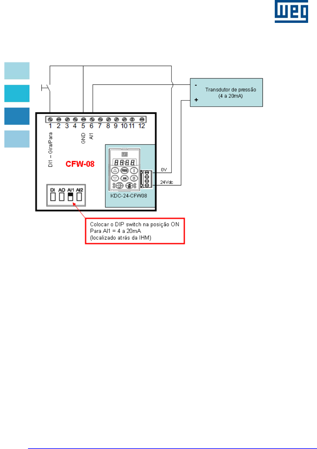 WEG Equipamentos Elétricos S/A Av. Prefeito Waldemar Grubba, 3000 - 89256-900 - Jaraguá do Sul - SC - Fone (47) 3276-4000 - Fax (47) 3276-4010 – www.weg.net CONTROLE PID NO CFW-08 Esquema elétrico: Observação: Pode ser utilizado uma IHM comum, porém deve-se utilizar uma fonte externa para alimentar o transdutor de pressão. Parametrização Favor alterar os parâmetros na seqüência mostrada abaixo. À partir do padrão de fábrica: P000 = 5 Senha para alterar os parâmetros P203 = 1 Habilita PID P222 = 0 Setpoint em remoto via IHM P100 = 0,1 Rampa de aceleração (rampa será feita pelo controle PID) P101 = 0,1 Rampa de desaceleração (rampa será feita pelo controle PID) P220 = 1 Sempre remoto P235 = 1 Sinal da entrada = 4 a 20mA P263 = 9 Programação da DI1 como gira/para P265 = 11 Programação da DI3 como sem função P266 = 11 Programação da DI4 como sem função P536 = 1 Desativa ajuste automático de setpoint WEG Equipamentos Elétricos S/A Av. Prefeito Waldemar Grubba, 3000 - 89256-900 - Jaraguá do Sul - SC - Fone (47) 3276-4000 - Fax (47) 3276-4010 – www.weg.net AJUSTES P133 = Velocidade mínima (Hz) P212 = Freqüência para ativar modo dormir (ajustar 1Hz acima do P133) P213 = Intervalo de tempo para ativar modo dormir P535 = Erro PID para sair do modo dormir P525 = Setpoint (em %) P520 = Ganho proporcional P521 = Ganho integral P522 = Ganho diferencial PARÂMETROS DE LEITURA P040 = Leitura da variável de processo (0 a 100%) EXEMPLO O sistema de pressurização está utilizando um transdutor de pressão que lê a de 0 a 15bar com a saída de 4 a 20mA. Deseja-se controlar a pressão estabilizando em 10bar (setpoint), e se a bomba estiver trabalhando abaixo de 30Hz por 5 segundos, o inversor deverá entrar no modo dormir. Ajustes: P133 = 30 Hz Velocidade mínima P212 = 31Hz Velocidade para ativar modo dormir P213 = 5 seg Tempo para entrar em modo dormir P525 = 66,6% Setpoint (66,6% de 15bar = 10bar) Esquema elétrico: Parametrização AJUSTES PARÂMETROS DE LEITURA EXEMPLO