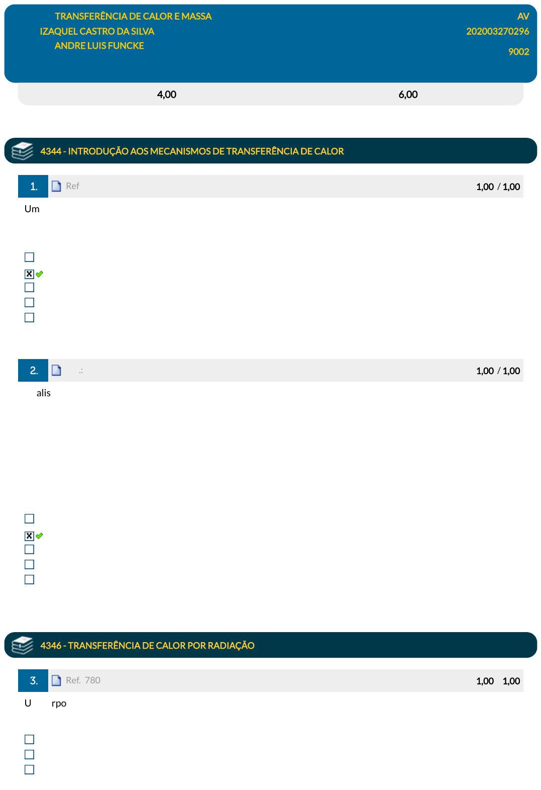 19/06/2023, 20:09 EPS https://simulado.estacio.br/alunos/ 1/4 Disciplina: TRANSFERÊNCIA DE CALOR E MASSA AV Aluno: IZAQUEL CASTRO DA SILVA 202003270296 Professor: ANDRE LUIS FUNCKE Turma: 9002 DGT1110_AV_202003270296 (AG) 07/06/2023 21:40:10 (F) Avaliação: 4,00 pts Nota SIA: 6,00 pts 4344 - INTRODUÇÃO AOS MECANISMOS DE TRANSFERÊNCIA DE CALOR 1. Ref.: 7703954 Pontos: 1,00 / 1,00 Um recipiente cilíndrico de vidro tem área da base relativamente pequena se comparada com sua altura. Ele contém água em temperatura ambiente até quase a sua borda e é colocado sobre a chama de um fogão. A transmissão do calor por meio das moléculas da água durante seu aquecimento ocorre apenas por: Convecção e irradiação Convecção Irradiação Condução e convecção Condução. 2. Ref.: 7703789 Pontos: 1,00 / 1,00 Analise as a�rmações abaixo no que tange a transferência de calor. Selecione a alternativa que supre as omissões das a�rmações: I - O calor do Sol chega até nós por _________________________. II - Uma moeda bem polida �ca __________ quente do que uma moeda revestida de tinta preta, quando ambas são expostas ao sol. III - Numa barra metálica aquecida numa extremidade, a propagação do calor se dá para a outra extremidade por _________________________. Radiação - menos - convecção. Radiação - menos - condução. Condução - mais - radiação. Convecção - mais - condução Convecção - mais - radiação 4346 - TRANSFERÊNCIA DE CALOR POR RADIAÇÃO 3. Ref.: 7800986 Pontos: 1,00 / 1,00 Um corpo opaco tem uma emissividade de 0,7 a 800 K. Qual é o valor da re�etividade? Observação: um corpo opaco pode ser considerado neste caso como um corpo negro, utilize essa característica fazendo uso da Lei de Kirchhoff. 0,7 0 1 javascript:alert('C%C3%B3digo da quest%C3%A3o: 7703954.'); javascript:alert('C%C3%B3digo da quest%C3%A3o: 7703789.'); javascript:alert('C%C3%B3digo da quest%C3%A3o: 7800986.'); 19/06/2023, 20:09 EPS https://simulado.estacio.br/alunos/ 2/4 0,5 0,3 4. Ref.: 7800985 Pontos: 0,00 / 1,00 Considere um corpo cúbico de 40 cm X 40 cm X 40 cm a 700 K suspenso no ar. Assumindo que o corpo é similar a um corpo negro. Qual é a taxa que o cubo emite energia de radiação em W? 13070 W 21700 W 37201 W 26892 W 20000 W 4347 - TROCADORES DE CALOR 5. Ref.: 7797074 Pontos: 0,00 / 1,00 Um trocador de calor em contra�uxo ou corrente opostas tem um coe�ciente total de transferência de calor de 300 W/m².K quando opera em condições iniciais de construção. Um �uido quente entra ao tubo a 00°C e sai a 65°C enquanto um �uido frio ingressa no casco a 30°C e sai a 40°C. Depois de um período de uso, fuligem aparece nas superfícies produzindo um fator de incrustação de 0,0004 m².K/W. A área de transferência é de 100 m² e a capacidade calorí�ca especí�ca do �uido quente e fria são iguais (4500 J/kg.°C). Qual é o valor da temperatura média logarítmica (MDLT)? 46,4 °C 38,3 °C 27,3 °C 55,3 °C 62,3 °C 6. Ref.: 7796838 Pontos: 0,00 / 1,00 Um trocador de calor de tubo duplo é construído com um tubo interior de aço ( k = 52W/mK ) de diametro interno Di = 0,2 m e externo De = 0,26m. Os coe�cientes de transferencia de calor por convecção são hi = 500 W/m²K sobre a super�cie interior do tubo e he = 50 W/m²K sobre a super�cie exterior. Para um fator de incrustação Rf,i = 0,0005 m².K/W do lado do tubo e Rf,e = 0,0002 m²K/W do lado externo. Qual é o valor da resistência térmica do trocador por comprimento unitário? 0,0132 K/W 0,1334 K/W 0,3255 K/W 0,0829 K/W 0,0332 K/W 4562 - TRANSFERÊNCIA DE MASSA - APLICAÇÕES 7. Ref.: 7797791 Pontos: 1,00 / 1,00 javascript:alert('C%C3%B3digo da quest%C3%A3o: 7800985.'); javascript:alert('C%C3%B3digo da quest%C3%A3o: 7797074.'); javascript:alert('C%C3%B3digo da quest%C3%A3o: 7796838.'); javascript:alert('C%C3%B3digo da quest%C3%A3o: 7797791.'); 19/06/2023, 20:09 EPS https://simulado.estacio.br/alunos/ 3/4 Qual é fração mássica de 63 kg de cal em 100 kg de água a 298 K? 0,386 0,523 0,256 0,785 0,855 8. Ref.: 7797583 Pontos: 0,00 / 1,00 0,16 0,55 0,65 0,78 0,93 4830 - TRANSFERÊNCIA DE CALOR POR CONDUÇÃO 9. Ref.: 7797475 Pontos: 0,00 / 1,00 Um tubo condutor de vapor de diâmetro interno 160 mm e externo 170 mm é coberto com duas camadas de isolante térmico. A espessura da primeira camada é 30 mm e a da segunda camada é 50 mm. As condutividades térmicas k1, k2, k3 do tubo e das camadas isolantes são 50, 0,15 e 0,08 W/m.K, respectivamente. A temperatura da superfície interna do tubo de vapor é 300 °C e a da superfície externa do segundo isolante é 50 °C. Qual é o �uxo de calor por unidade de comprimento do tubo? 241 W 852 W 520 W 176 W 388 W 10. Ref.: 7796993 Pontos: 0,00 / 1,00 Em uma partícula esférica de raio r1 há geração térmica uniforme a uma taxa q e com condutividade térmica constante k. A temperatura da superfície tem um valor de Ts e está sendo resfriada pelo ar ambiente (T∞,h). Qual é a equação de condução de calor do problema em estado estacionário? (r2. ) = 0d dr dT dr (r2. ) = d dr dT dr 1 k (r2. ) = − . r2d dr dT dr q k javascript:alert('C%C3%B3digo da quest%C3%A3o: 7797583.'); javascript:alert('C%C3%B3digo da quest%C3%A3o: 7797475.'); javascript:alert('C%C3%B3digo da quest%C3%A3o: 7796993.'); 19/06/2023, 20:09 EPS https://simulado.estacio.br/alunos/ 4/4 (r2. ) = − . r2 + . d dr dT dr q k p.Cp k dT dt (r2. ) = . r2d dr dT dr 1 k