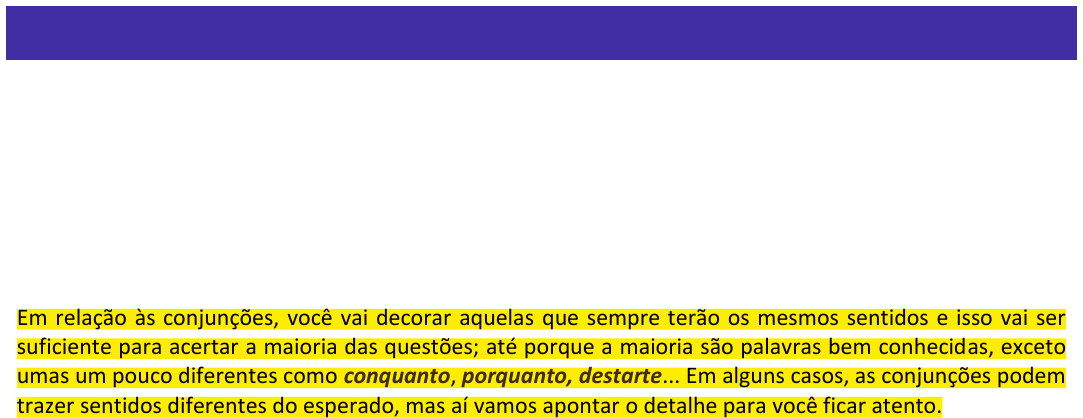 NOÇÕES INICIAIS Olá, pessoal!!! Vamos dar início ao estudo de duas classes de palavras que denominamos de Conectivos. Nesta aula, veremos o uso das preposições e das conjunções. Trata-se de um assunto dos mais cobrados dentro desse tema, em TODA PROVA. Vamos ser práticos. São assuntos muito simples: na parte das preposições, vamos entender a diferença entre preposições relacionais e nocionais. Esse entendimento é essencial para uma correta análise sintática. Em relação às conjunções, você vai decorar aquelas que sempre terão os mesmos sentidos e isso vai ser suficiente para acertar a maioria das questões; até porque a maioria são palavras bem conhecidas, exceto umas um pouco diferentes como conquanto, porquanto, destarte... Em alguns casos, as conjunções podem trazer sentidos diferentes do esperado, mas aí vamos apontar o detalhe para você ficar atento. Lembre-se: esta aula é vital para a compreensão das diversas orações subordinadas e coordenadas, pois são as conjunções que as iniciam. PREPOSIÇÕES A preposição é uma classe de palavras invariável, ou seja, que não se flexiona. A função dessa classe é conectar palavras e iniciar orações reduzidas. Normalmente, as preposições vão compor locuções. Quando ligada a adjetivos, formará uma locução adjetiva (ou seja, um adjetivo formado por mais de uma palavra); quando ligada a um advérbio, formará uma locução adverbial (ou seja, um advérbio formado por mais de uma palavra); e assim por diante. Vamos relembrar as principais preposições: a, com, de, em, para, ante, até, após, contra, sem, sob, sobre, per, por, desde, trás, perante. Ex: Gosto de chocolate (a preposição liga a palavra "chocolate" ao verbo "gostar") Ex: Tenho medo de cobra (a preposição liga a palavra "cobra" ao nome "medo") Ex: Sem estudar, não será possível passar no concurso (a preposição introduz a oração reduzida de infinitivo) Ex: Esta mesa é de mármore (a preposição forma uma locução adjetiva) Preposições Essenciais e Acidentais: São chamadas de “essenciais” as preposições puras, que só atuam como preposição: a, com, de, em, para, por, desde, contra, sob, sobre, ante, sem... São chamadas de preposições “acidentais” aquelas palavras que na verdade pertencem a outra classe, mas que, “acidentalmente”, em determinados contextos, passam a ser preposição: consoante, conforme, segundo (quando não introduzem oração), como, que, mesmo, durante, mediante... Ex: Tenho de estudar/Tenho que estudar (essas expressões são equivalentes e o “que” é uma preposição acidental, pois é uma conjunção que está “acidentalmente” no papel de preposição (“de”). Ex: Eu jogo de goleiro/ Eu jogo como goleiro. (“como” é conjunção, mas aqui está no papel de preposição (“de”). As palavras salvo, exceto, exclusive, afora, menos e senão são consideradas preposições acidentais quando introduzem locuções adverbiais com sentido de exclusão: Ex: Salvo aquele capítulo, o livro inteiro é bom. Ex: O livro inteiro é bom, menos aquele capítulo. Usamos eu e tu após preposições acidentais ou palavras denotativas: Ex: Fora tu, todos erraram (fora é preposição acidental) Ex: Até tu, Brutus! (até, nesse contexto, é palavra denotativa de inclusão) Com preposições essenciais, devemos usar as formas pronominais oblíquas: Ex: Venha até mim e haverá bênçãos para ti. Preposições Relacionais e Nocionais: As preposições que são exigidas por verbos e nomes, ou seja, que são regidas, têm “valor relacional”. São preposições eminentemente gramaticais e introduzem funções sintáticas de complemento, como objetos diretos, indiretos e complementos nominais. Em suma, são aquelas preposições obrigatórias, pedidas pela regência (exigidas pelas palavras que pedem um complemento). Ex: Desconfio de um funcionário. (“relacional” - introduz complemento de verbo) Ex: Tenho medo de cobra. (“relacional” - introduz complemento de substantivo) Ex: Estou desconfiado de um funcionário. (“relacional” - introduz complemento de adjetivo) Ex: Fui favorável a suas escolhas. (“relacional” - introduz complemento de advérbio) Então, se a preposição introduzir um complemento obrigatório de um verbo, substantivo, adjetivo ou advérbio, ela será uma preposição gramatical/relacional e será exigência de um termo anterior. As que não são exigidas obrigatoriamente, mas aparecem para estabelecer “relações de sentido”, têm valor “nocional”, pois trazem noção de posse, causa, instrumento, matéria, modo, etc. Geralmente introduzem adjuntos adnominais e adverbiais. Ex: Este é o carro de Ricardo. (“nocional” - introduz locução indicativa de posse) Ex: Tenho um violão de madeira. (“nocional” - indica qualidade/matéria) Ex: Estudo de noite. (“nocional” - introduz circunstância de tempo) Ex: Ele morreu de fome. (“nocional” - introduz circunstância de causa) Então vamos analisar um exemplo e ver qual preposição é exigida gramaticalmente por um termo anterior: Ex: Discordo de argumentos de direita. O verbo “discordar” pede a preposição “de”. A expressão “de argumentos” é um objeto indireto. Essa preposição tem valor relacional, pois é obrigatória, própria do verbo “discordar”. Repare que inicia um complemento! Já a expressão preposicionada “de direita” é uma locução adjetiva, pois equivale a um adjetivo: “direitistas”. Por ter esse valor de adjetivo, exerce função de adjunto adnominal, ligado ao nome “argumentos”. Observe agora que ela não é exigida pelo termo anterior, está aqui para fazer uma relação de sentido, para introduzir a “noção” de tipo ou qualidade dos argumentos. A distinção entre esses dois tipos de preposição é fundamental para a análise sintática. Contração das preposições: As preposições podem ser contraídas com outras classes:
