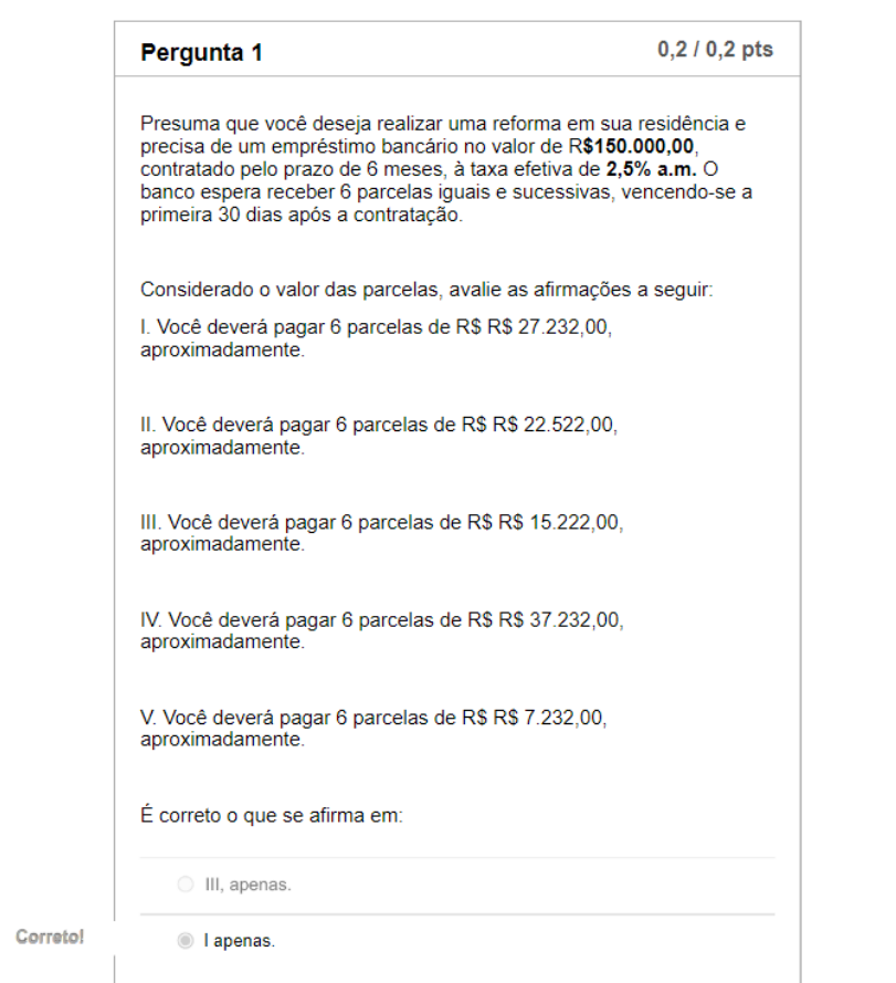 Caso você esteja realizando a atividade através do aplicativo "Canvas Student", é necessário que você clique em "FAZER O QUESTIONÁRIO", no final da página. Parte superior do formulário Sinalizar pergunta: Pergunta 1 Pergunta 10,2 pts Leia o texto a seguir: Há tempos, Pepe vem observando lojas virtuais, interessado na compra de uma nova geladeira. Decididos marca e modelo, seu foco voltou para preços e condições de compra. A oferta que mais lhe agradou, finalmente, foi o preço de R$ 3.000,00, com parcelamento em 6 vezes, com ou sem entrada, em crediário oferecido pela própria loja, às taxas de 2,5% a.m. (6 parcelas iguais, sendo uma de entrada) ou 3,0% (6 parcelas iguais, vencendo-se a primeira 30 dias após a compra). Sem possibilidades de comprar à vista e com algumas dificuldades para obtenção de crédito, viu-se atraído pelas condições descritas. Considerando que Pepe escolheu o plano sem entrada, quanto será o valor das parcelas mensais? Grupo de escolhas da pergunta O plano “sem entrada” exigiria, de Pepe, 6 parcelas iguais de R$ 503,37 O plano “sem entrada” exigiria, de Pepe, 6 parcelas iguais de R$ 553,79 O plano “sem entrada” exigiria, de Pepe, 6 parcelas iguais de R$ 653,79 O plano “sem entrada” exigiria, de Pepe, 6 parcelas iguais de R$ 531,37 O plano “sem entrada” exigiria, de Pepe, 6 parcelas iguais de R$ 443,79 Sinalizar pergunta: Pergunta 2 Pergunta 20,2 pts As séries uniformes de pagamentos postecipados são aqueles em que o primeiro pagamento ocorre no momento 1. Portanto: Considere um financiamento a ser quitado através de quatro pagamentos mensais de R$ 5.000,00, vencendo a primeira parcela a 30 dias da liberação dos recursos. Sendo de 5,5% ao mês a taxa contratual de juros. Qual o valor do financiamento? Grupo de escolhas da pergunta R$ 18.900,00 R$ 18.750,00 R$ 17.525,87 R$ 17.700,00 R$ 17.900,00 Sinalizar pergunta: Pergunta 3 Pergunta 30,2 pts Leia o texto a seguir: Bianca pretendeu comprar um veículo cujo preço era R$ 150.000,00, com financiamento bancário de R$ 100.000,00, a pagar em 12 meses, com parcelas iguais e sucessivas. A taxa de juros praticada pelo banco, nesse tipo de operação era de 2,3 % a.m., no momento da consulta, vencendo-se a primeira 30 dias após a contratação. Considerando as informações apresentadas, o valor das parcelas, será de aproximadamente: Grupo de escolhas da pergunta R$ 10.000,00 R$ 9.631,00 R$ 6.333,00 R$ 12.331,00 R$ 19.031,00 Sinalizar pergunta: Pergunta 4 Pergunta 40,2 pts As séries uniformes de pagamentos antecipadas são aquelas em que o primeiro pagamento ocorre na data focal 0 (zero). Este tipo de sistema de pagamento é também chamado de sistema de pagamento com entrada. Considere uma série de 6 prestações (títulos) de R$ 20.000,00, vencíveis mensalmente, sendo a primeira no ato da compra, sabendo que a taxa é de 5% a.m. Qual o valor à vista do título? Grupo de escolhas da pergunta R$ 108.700,00 R$ 106.900,00 R$ 107.500,00 R$ 105.650,00 R$ 106.589,70 Sinalizar pergunta: Pergunta 5 Pergunta 50,2 pts Presuma que você deseja realizar uma reforma em sua residência e precisa de um empréstimo bancário no valor de R$150.000,00, contratado pelo prazo de 6 meses, à taxa efetiva de 2,5% a.m. O banco espera receber 6 parcelas iguais e sucessivas, vencendo-se a primeira 30 dias após a contratação. Considerado o valor das parcelas, avalie as afirmações a seguir: I. Você deverá pagar 6 parcelas de R$ R$ 27.232,49 II. Você deverá pagar 6 parcelas de R$ R$ 22.522,00 III. Você deverá pagar 6 parcelas de R$ R$ 15.222,00 IV. Você deverá pagar 6 parcelas de R$ R$ 37.232,00 V. Você deverá pagar 6 parcelas de R$ R$ 7.232,00 Estão corretas apenas as afirmativas: Grupo de escolhas da pergunta IV I III V II image7.png image8.png image9.png image10.png image11.png image12.png image13.wmf image14.wmf image1.png image2.png image3.png image4.png image5.png image6.png