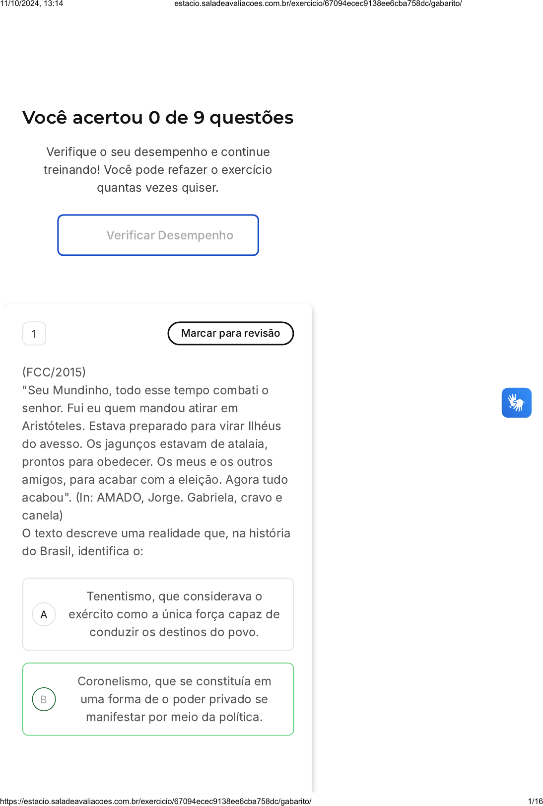 Você acertou 0 de 9 questões Verifique o seu desempenho e continue treinando! Você pode refazer o exercício quantas vezes quiser. Verificar Desempenho A B 1 Marcar para revisão �FCC/2015� "Seu Mundinho, todo esse tempo combati o senhor. Fui eu quem mandou atirar em Aristóteles. Estava preparado para virar Ilhéus do avesso. Os jagunços estavam de atalaia, prontos para obedecer. Os meus e os outros amigos, para acabar com a eleição. Agora tudo acabou". �In: AMADO, Jorge. Gabriela, cravo e canela) O texto descreve uma realidade que, na história do Brasil, identifica o: Tenentismo, que considerava o exército como a única força capaz de conduzir os destinos do povo. Coronelismo, que se constituía em uma forma de o poder privado se manifestar por meio da política. 11/10/2024, 13:14 estacio.saladeavaliacoes.com.br/exercicio/67094ecec9138ee6cba758dc/gabarito/ https://estacio.saladeavaliacoes.com.br/exercicio/67094ecec9138ee6cba758dc/gabarito/ 1/16 C D E Mandonismo, criado com o objetivo de administrar os conflitos no interior das elites agrárias do país. Messianismo, entidade com poderes políticos capaz de subjugar a população por meio da força. Integralismo, que consistia em uma forma de a oligarquia cafeeira demonstrar sua influência e poder político. Questão não respondida Opa! A alternativa correta é a letra B. Confira o gabarito comentado! Gabarito Comentado O trecho do livro "Gabriela, cravo e canela" de Jorge Amado, retrata uma situação típica do coronelismo, fenômeno sociopolítico brasileiro do início do século XX, durante a República Velha �1889�1930�. Nesse período, indivíduos conhecidos como "coronéis" exerciam poder local sobre as camadas inferiores da sociedade, garantindo votos em troca de favores políticos em níveis locais, estaduais e federais. A figura do "Seu Mundinho" no texto, que está disposto a usar a força e influência para interferir no resultado de uma eleição, é um exemplo clássico dessa prática. Portanto, a alternativa correta é a B, que se refere ao coronelismo. 11/10/2024, 13:14 estacio.saladeavaliacoes.com.br/exercicio/67094ecec9138ee6cba758dc/gabarito/ https://estacio.saladeavaliacoes.com.br/exercicio/67094ecec9138ee6cba758dc/gabarito/ 2/16 A B C D E 2 Marcar para revisão �FUNCAB/2010 � Adaptada) O período da ditadura militar no Brasil vai de 1964 a 1985, sendo seu primeiro presidente o Marechal Humberto de Alencar Castelo Branco, indicado pela junta militar que governara o país na primeira quinzena após o golpe. Sobre o seu período presidencial, analise as afirmativas abaixo, assinalando as ações realizadas durante a sua gestão. I. O Congresso Nacional foi convocado para a promulgação de nova Constituição, elaborada pelo Poder Executivo. II. Foi criado o bipartidarismo, sistema em que apenas dois partidos foram autorizados a funcionar oficialmente: Movimento Democrático Brasileiro e Aliança Renovadora Nacional. III. No transcorrer desse período, houve forte contestação popular, culminando com a passeata dos "Cem Mil", promovida pela União Nacional dos Estudantes no estado do Rio de Janeiro. Marque a alternativa que apresenta as afirmativas corretas. I, II e III. Apenas II e III. Apenas I e III. Apenas I e II. Apenas I. Questão 4 de 9 Exercicio A Justiça No Brasil: Da Velha República Aos Governos Militares Sair 11/10/2024, 13:14 estacio.saladeavaliacoes.com.br/exercicio/67094ecec9138ee6cba758dc/gabarito/ https://estacio.saladeavaliacoes.com.br/exercicio/67094ecec9138ee6cba758dc/gabarito/ 3/16 Questão não respondida Opa! A alternativa correta é a letra D. Confira o gabarito comentado! Gabarito Comentado Durante o governo do Marechal Humberto de Alencar Castelo Branco, primeiro presidente do período da ditadura militar no Brasil, foram realizadas diversas ações que marcaram a história do país. Entre elas, destaca-se a convocação do Congresso Nacional para a promulgação de uma nova Constituição, elaborada pelo Poder Executivo, conforme afirmativa I. Esta nova Constituição, promulgada em 1967, suspendeu a Constituição anterior e estabeleceu, entre outras coisas, a concentração do poder de decisão no Poder Executivo e a realização de eleições indiretas para presidente. Outra ação importante foi a criação do bipartidarismo, sistema em que apenas dois partidos foram autorizados a funcionar oficialmente: o Movimento Democrático Brasileiro �MDB) e a Aliança Renovadora Nacional �ARENA�, conforme afirmativa II. Este sistema foi estabelecido pelo Ato Institucional N° 3, em 1966, e representou uma importante mudança na política brasileira. Por outro lado, a afirmativa III não é correta. A passeata dos "Cem Mil", promovida pela União Nacional dos Estudantes, ocorreu em junho de 1968, já no governo de Costa e Silva, e não durante o governo de Castelo Branco. Portanto, as afirmativas corretas são I e II, o que corresponde à alternativa D. Em branco �9� 1 2 3 4 5 6 7 8 9 11/10/2024, 13:14 estacio.saladeavaliacoes.com.br/exercicio/67094ecec9138ee6cba758dc/gabarito/ https://estacio.saladeavaliacoes.com.br/exercicio/67094ecec9138ee6cba758dc/gabarito/ 4/16 A B C D E 3 Marcar para revisão Em relação ao Golpe Militar de 1964 no Brasil, pode-se dizer que: I. Foi fruto de uma conspiração civil militar alarmada com os rumos nacionalistas do governo João Goulart. II. Foi a forma encontrada pelos comandos militares para garantir a posse do novo presidente. III. Representou a repulsa de setores da sociedade brasileira à tentativa de João Goulart de aumentar a presença do capital estrangeiro no país. IV. Evitou a tentativa do Partido Comunista Brasileiro, de sindicatos de trabalhadores e de setores do Partido Trabalhista Brasileiro de pressionar o presidente, para a implementação imediata das "reformas de base" que foram anunciadas. Analisando as afirmações anteriores, podemos concluir que estão corretas somente: III e IV. III e V. I, II e III. 