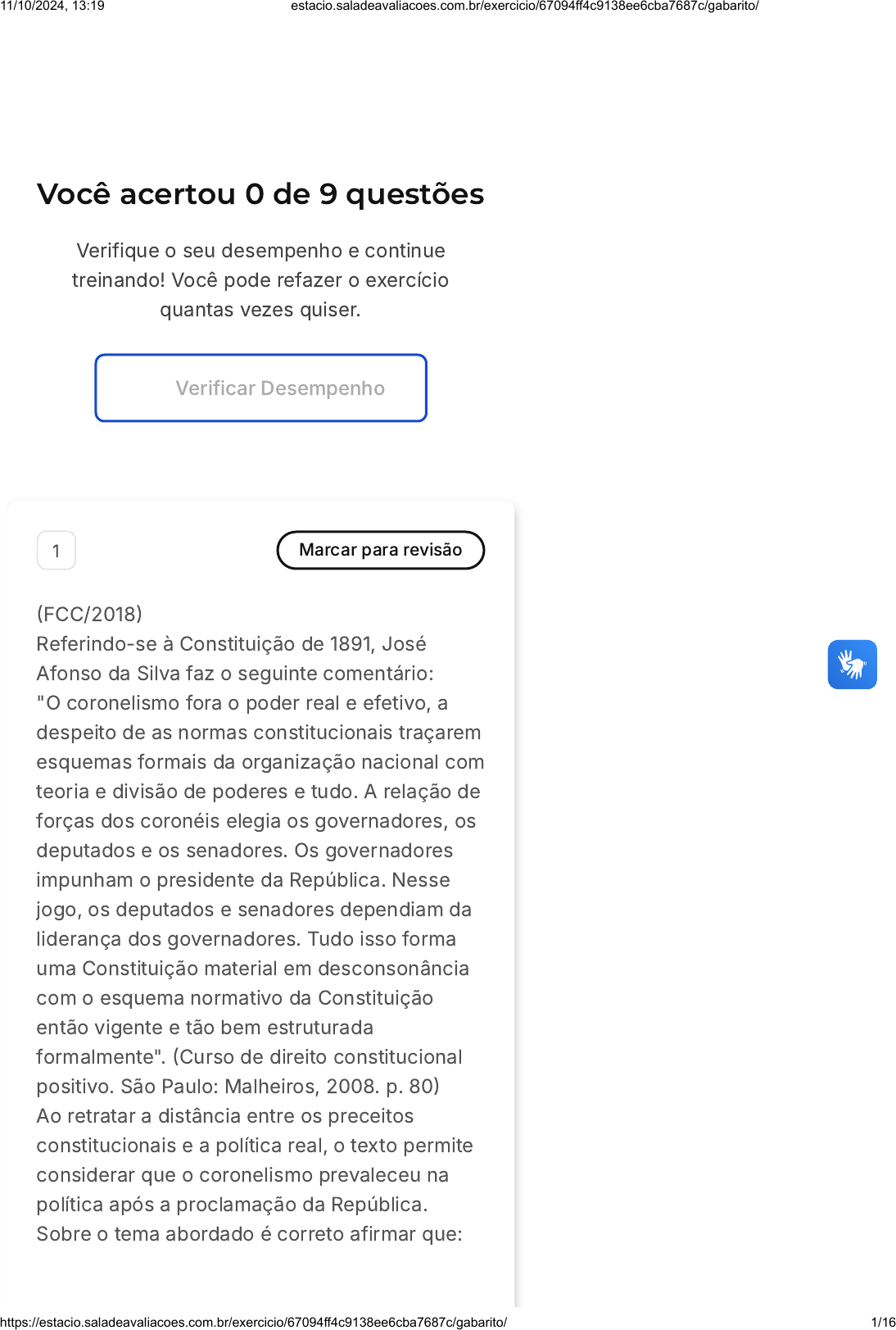 Você acertou 0 de 9 questões Verifique o seu desempenho e continue treinando! Você pode refazer o exercício quantas vezes quiser. Verificar Desempenho 1 Marcar para revisão �FCC/2018� Referindo-se à Constituição de 1891, José Afonso da Silva faz o seguinte comentário: "O coronelismo fora o poder real e efetivo, a despeito de as normas constitucionais traçarem esquemas formais da organização nacional com teoria e divisão de poderes e tudo. A relação de forças dos coronéis elegia os governadores, os deputados e os senadores. Os governadores impunham o presidente da República. Nesse jogo, os deputados e senadores dependiam da liderança dos governadores. Tudo isso forma uma Constituição material em desconsonância com o esquema normativo da Constituição então vigente e tão bem estruturada formalmente". �Curso de direito constitucional positivo. São Paulo: Malheiros, 2008. p. 80� Ao retratar a distância entre os preceitos constitucionais e a política real, o texto permite considerar que o coronelismo prevaleceu na política após a proclamação da República. Sobre o tema abordado é correto afirmar que: 11/10/2024, 13:19 estacio.saladeavaliacoes.com.br/exercicio/67094ff4c9138ee6cba7687c/gabarito/ https://estacio.saladeavaliacoes.com.br/exercicio/67094ff4c9138ee6cba7687c/gabarito/ 1/16 A B C D E O constitucionalismo republicano cumpriu suas funções essenciais, isto é, foi eficaz em regular o poder realmente existente, garantindo a independência do chefe da nação, isolando-o das pressões estaduais e das ingerências dos coronéis. A relação direta entre os poderes locais, submetidos às práticas coronelísticas, impediu que representantes de São Paulo exercessem a presidência da República nas primeiras décadas após sua instauração. O federalismo republicano deixou às claras que o poder do exército impunha, na "Primeira República", uma relação direta de poderes locais com o legislativo, por meio da ação dos coronéis. Na federação instituída pela Constituição de 1891, para não haver conflitos entre as diversas esferas do poder estadual foi estimulada a participação das forças militares municipais, controladas por seus coronéis, por representarem o maior poder local. O federalismo instituído garantiu as bases do domínio oligárquico, fundado na propriedade da terra e no controle eleitoral da população rural pelos chefes políticos locais. 11/10/2024, 13:19 estacio.saladeavaliacoes.com.br/exercicio/67094ff4c9138ee6cba7687c/gabarito/ https://estacio.saladeavaliacoes.com.br/exercicio/67094ff4c9138ee6cba7687c/gabarito/ 2/16 Questão não respondida Opa! A alternativa correta é a letra E. Confira o gabarito comentado! Gabarito Comentado O comentário de José Afonso da Silva sobre a Constituição de 1891 destaca a prevalência do coronelismo na política após a proclamação da República, apesar das normas constitucionais formalmente estabelecidas. A alternativa correta é a letra E, que afirma que o federalismo instituído garantiu as bases do domínio oligárquico, fundado na propriedade da terra e no controle eleitoral da população rural pelos chefes políticos locais. Isso é consistente com a descrição de Silva, que retrata os coronéis como uma força política real e efetiva, capaz de eleger governadores, deputados e senadores, e até mesmo de impor o presidente da República. Portanto, a realidade política da época estava em desconsonância com o esquema normativo da Constituição, evidenciando a distância entre os preceitos constitucionais e a política real. 2 Marcar para revisão �FCC/2015� "Seu Mundinho, todo esse tempo combati o senhor. Fui eu quem mandou atirar em Aristóteles. Estava preparado para virar Ilhéus do avesso. Os jagunços estavam de atalaia, prontos para obedecer. Os meus e os outros amigos, para acabar com a eleição. Agora tudo acabou". �In: AMADO, Jorge. Gabriela, cravo e canela) 11/10/2024, 13:19 estacio.saladeavaliacoes.com.br/exercicio/67094ff4c9138ee6cba7687c/gabarito/ https://estacio.saladeavaliacoes.com.br/exercicio/67094ff4c9138ee6cba7687c/gabarito/ 3/16 A B C D E O texto descreve uma realidade que, na história do Brasil, identifica o: Tenentismo, que considerava o exército como a única força capaz de conduzir os destinos do povo. Coronelismo, que se constituía em uma forma de o poder privado se manifestar por meio da política. Mandonismo, criado com o objetivo de administrar os conflitos no interior das elites agrárias do país. Messianismo, entidade com poderes políticos capaz de subjugar a população por meio da força. Integralismo, que consistia em uma forma de a oligarquia cafeeira demonstrar sua influência e poder político. Questão não respondida Opa! A alternativa correta é a letra B. Confira o gabarito comentado! Gabarito Comentado O trecho do livro "Gabriela, cravo e canela" de Jorge Amado, retrata uma situação típica do coronelismo, fenômeno sociopolítico brasileiro do início do século XX, durante a República Velha �1889�1930�. Nesse período, indivíduos conhecidos como "coronéis" exerciam poder local sobre as camadas inferiores da sociedade, 11/10/2024, 13:19 estacio.saladeavaliacoes.com.br/exercicio/67094ff4c9138ee6cba7687c/gabarito/ https://estacio.saladeavaliacoes.com.br/exercicio/67094ff4c9138ee6cba7687c/gabarito/ 4/16 A B C D E garantindo votos em troca de favores políticos em níveis locais, estaduais e federais. A figura do "Seu Mundinho" no texto, que está disposto a usar a força e influência para interferir no resultado de uma eleição, é um exemplo clássico dessa prática. Portanto, a alternativa correta é a B, que se refere ao coronelismo. 3 Marcar para revisão Sobre as formulações da justiça na redemocratização após o Estado Novo, percebemos que: I. Não houve mudanças drásticas no âmbito da justiça. II. Houve mudanças pontuais no período do retorno de Vargas. III. A tentativa de uma estabiliza