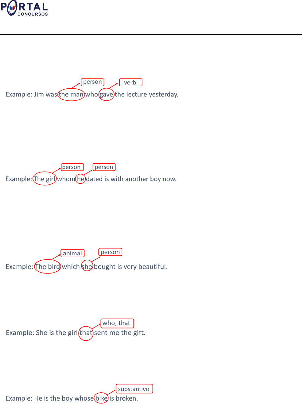 INGLÊS PROF. MARCUS GIOVANNI www.cursosdoportal.com.br RELATIVE PRONOUNS Who person + relative pronoun + verb person + relative pronoun + person Whom person + relative pronoun + person person, prep. + relative pronoun + person Which animal; object + relative pronoun + person; verb animal; object; prep. + relative pronoun + person; verb That Substitui who, whom ou which Whose Usado antes de um substantivo